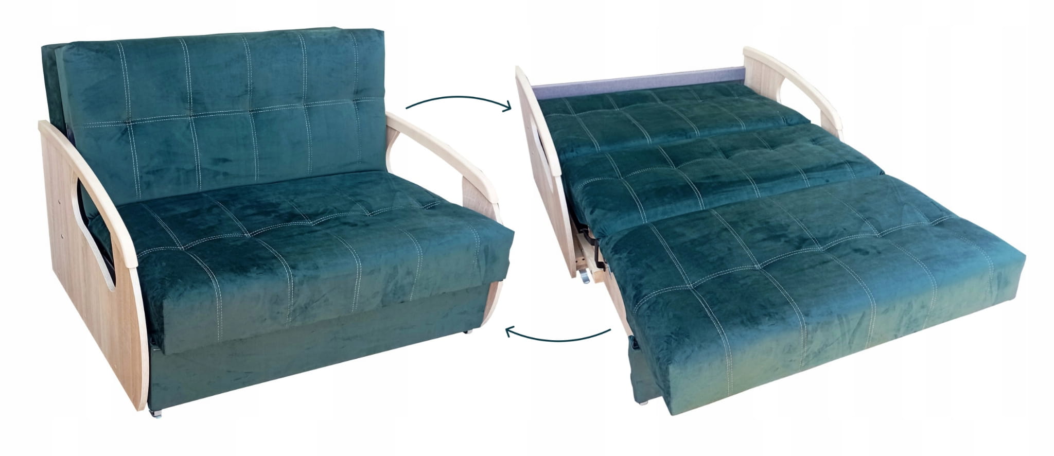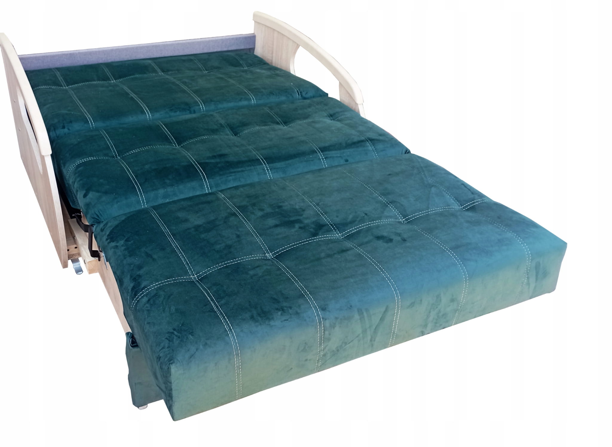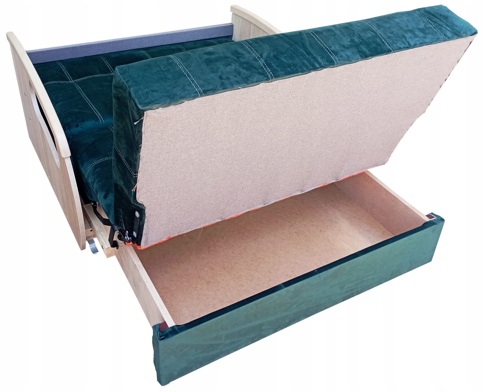 Solidny mechanizm rozkładania przytwierdzony do drewnianej ramy za pomocą śrub sprawia, że mebel rozkłada się bezproblemowo, a konstrukcja mebla jest niezwykle wytrzymała i stabilna.