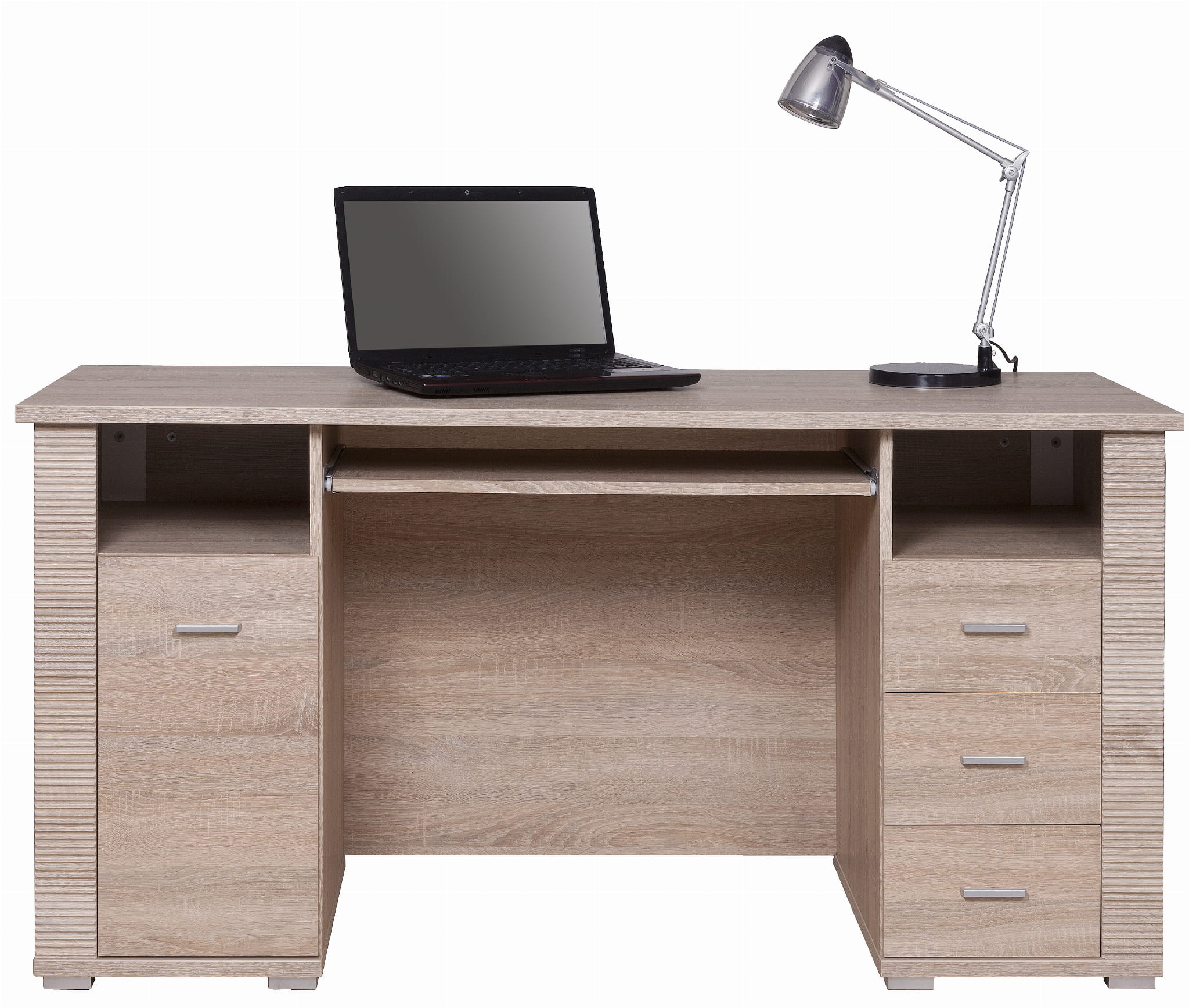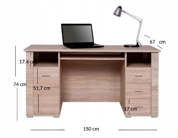 Biurko z kolekcji Gress może stanowić idealne wyposażenie gabinetów, biur, a także pokojów młodzieżowych. Mebel jest solidnie wykonany. Pozwala na swobodne korzystanie z laptopa lub komputera stacjonarnego. Biurko zbudowane jest z trzech szuflad i otwartej półki po jednej stronie oraz szafki i otwartej półki po drugiej stronie. Charakterystycznym wyróżnikiem biurka z kolekcji Gress są ryflowane ozdobne listwy. Kolor mebli, dąb sonoma, naturalnie łączy się z szeroką gamą barw farb oraz tapet.