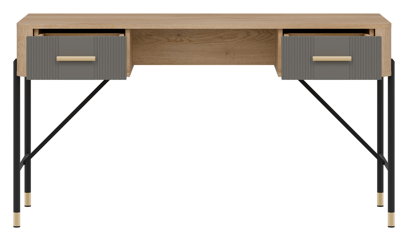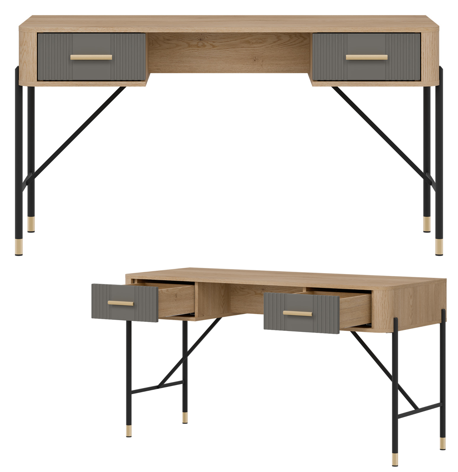 Biurko DT23 z kolekcji DANTE to perfekcyjne połączenie wyrafinowanego designu z funkcjonalnym podejściem do przestrzeni roboczej. Stworzone z myślą o nowoczesnych wnętrzach, doskonale sprawdzi się zarówno w eleganckim biurze, domowym gabinecie, jak i stylowej przestrzeni do nauki. Biurko nie tylko zachwyca wyglądem, ale także funkcjonalnością – zostało wyposażone w dwie praktyczne szuflady oraz otwartą wnękę, idealną na drobne akcesoria, notatki lub laptopa.