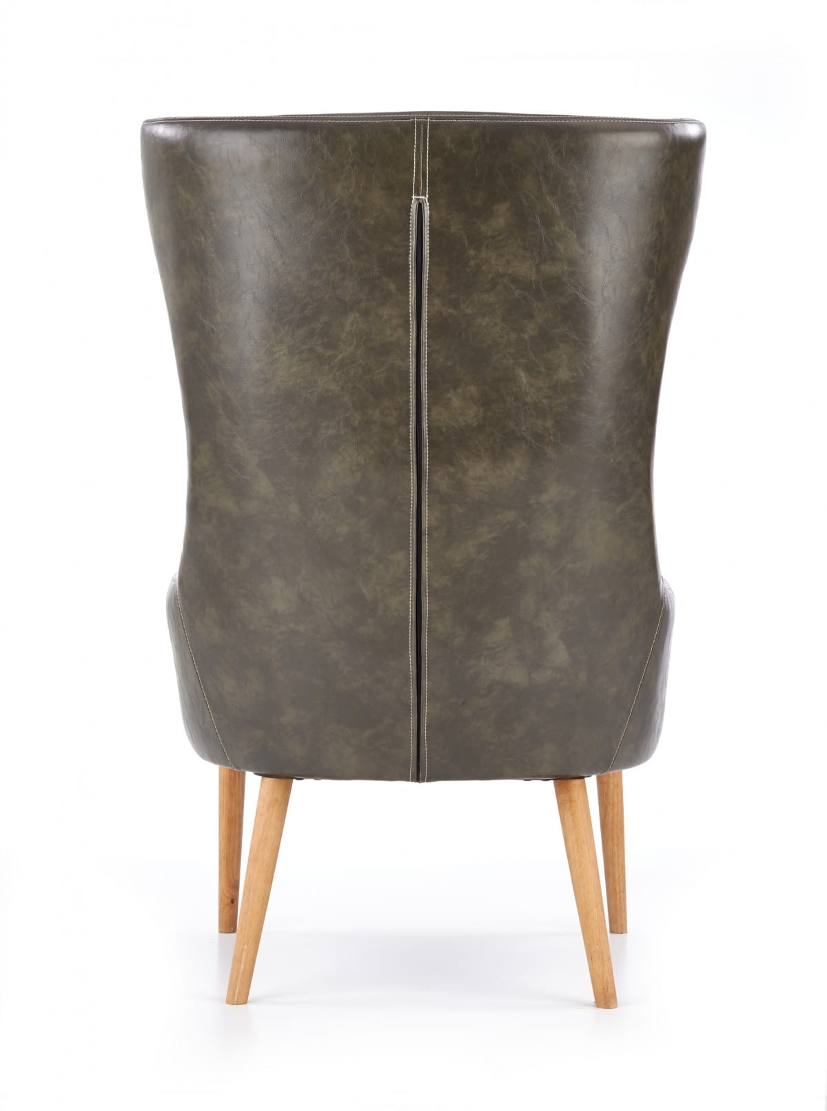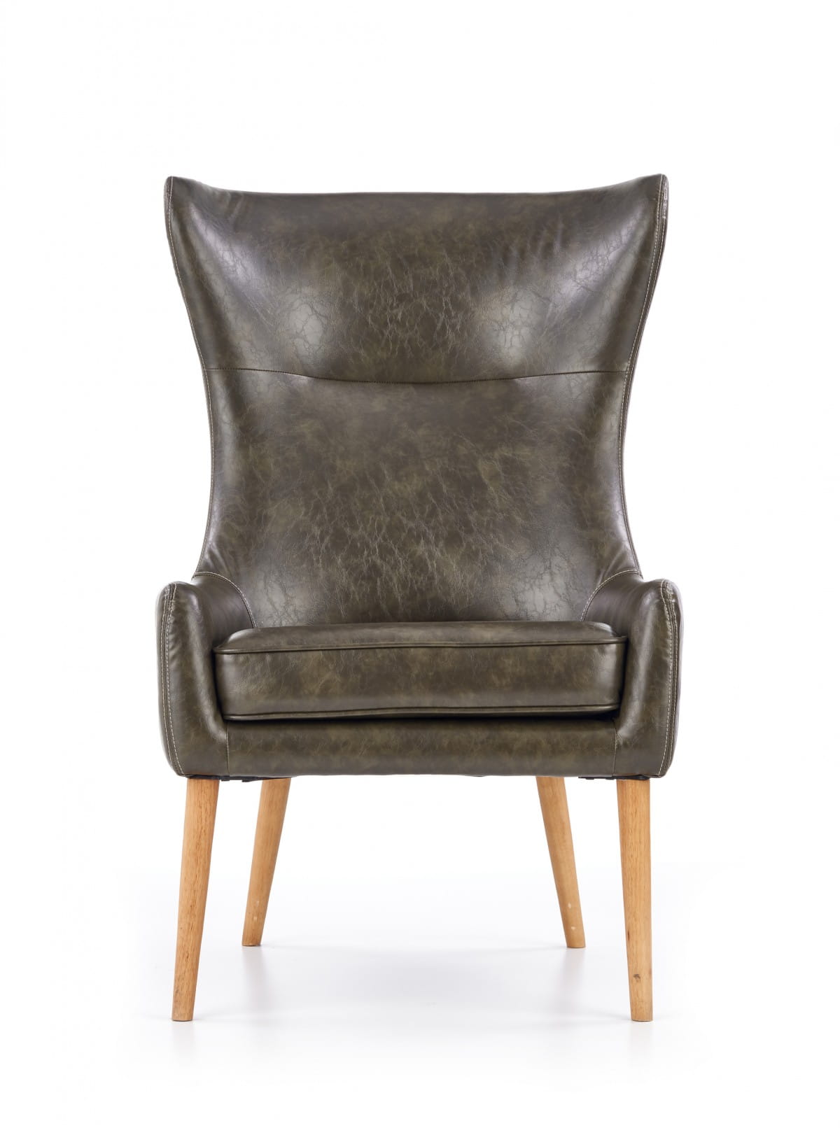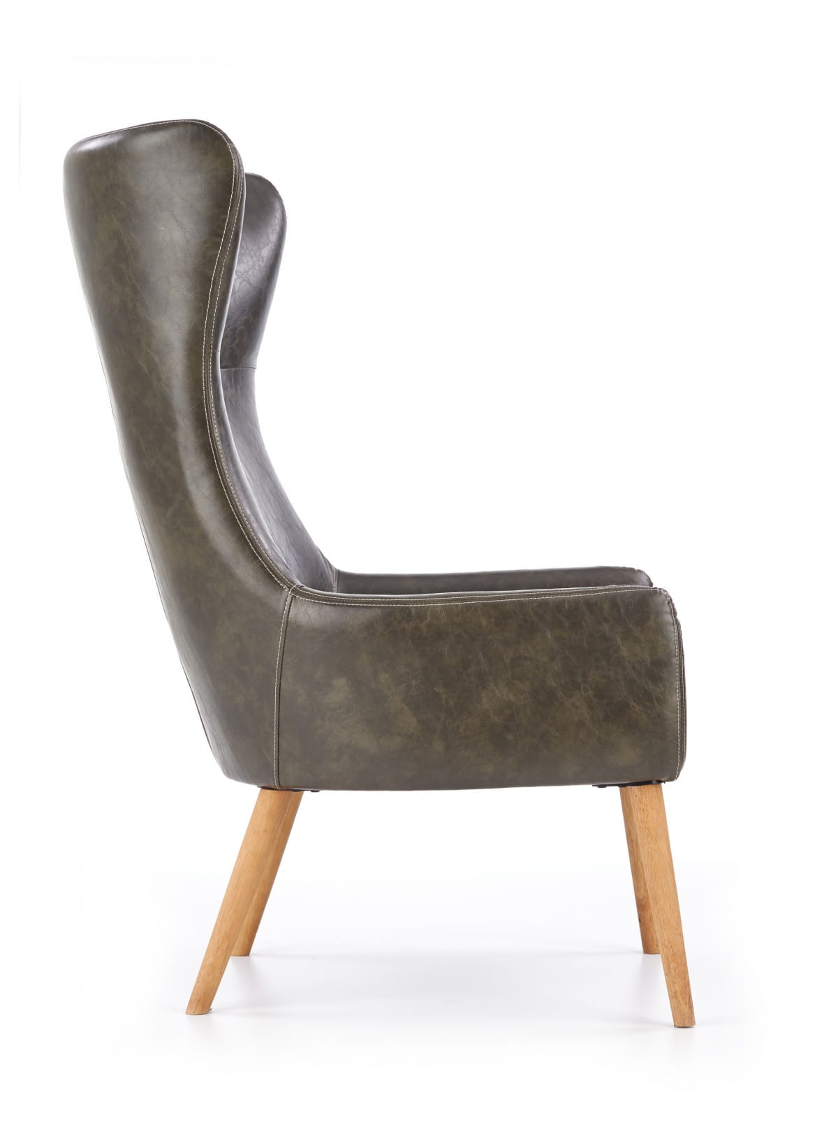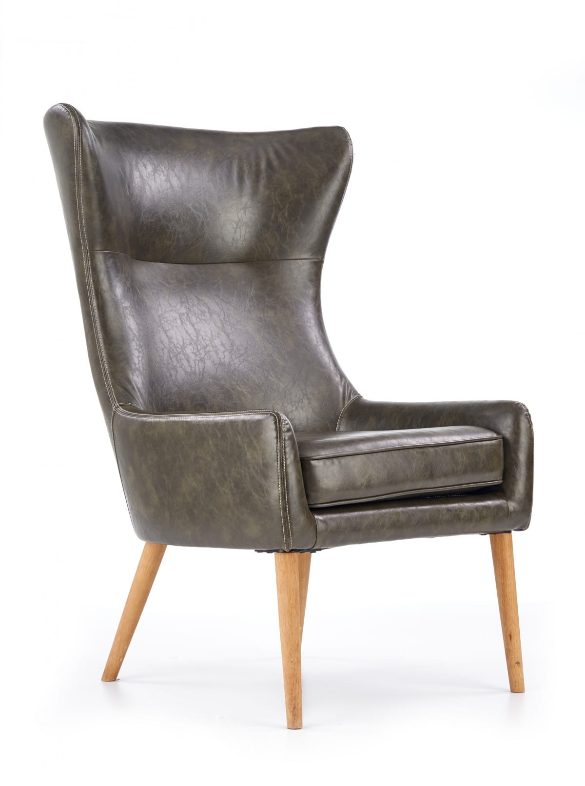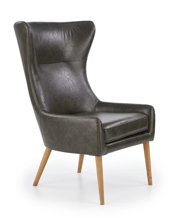 Fotel wypoczynkowy to dość masywna konstrukcja, która doskonale będzie się prezentowała w przestrzeni salonu zaaranżowanego w stylistyce nowoczesnej lub nieco bardziej klasycznej. Bryła z wysokim oparciem oraz dekoracyjnymi zaokrągleniami tapicerowana jest wysokogatunkową ekoskórą — charakteryzuje się ona zwiększoną odpornością na zabrudzenia oraz jest przyjemna w dotyku, dzięki czemu gwarantuje komfort codziennego wypoczynku z książką w ręku. Wyprofilowane oparcie idealnie komponuje się z siedziskiem, na którym umieszczona jest poduszka zwiększająca komfort użytkowania. Elegancki fotel utrzymuje się na czterech nóżkach wykonanych z litego drewna