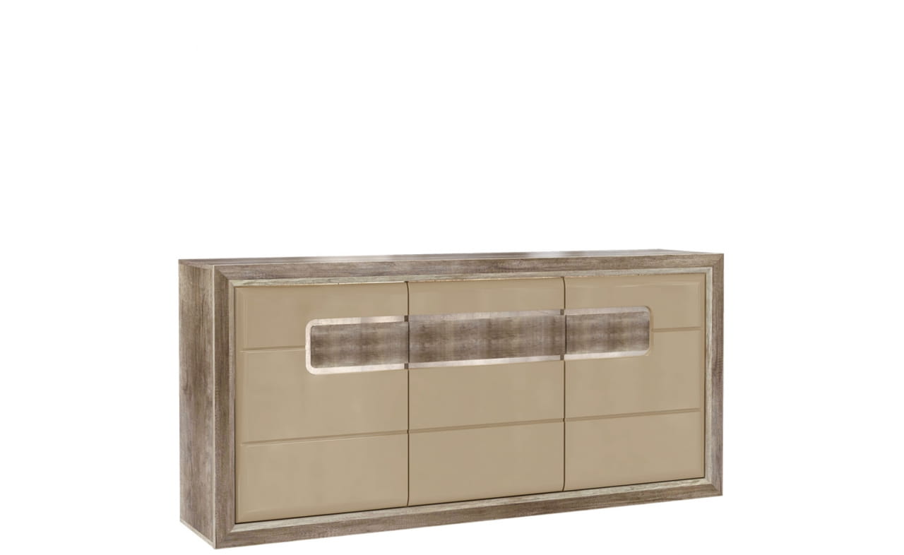 Uniwersalna komoda TIZIANO TZK23B w wybarwieniu dębu antycznego połączonego z beżowym połyskiem idealnie wtopi się do aranżacji Twojego salonu lub jadalni. Zaokrąglone krawędzie frontów osadzone są w szerokich listwach bocznych korpusów. Segmentowy układ frontów tworzą dekoracyjne frezowania. Uchwyty wykonane zostały w formie ryflowanych listew - podświetlonych w standardowym wyposażeniu. Komoda TZK228 znakomicie współgra z pozostałymi produktami kolekcji TIZIANO.