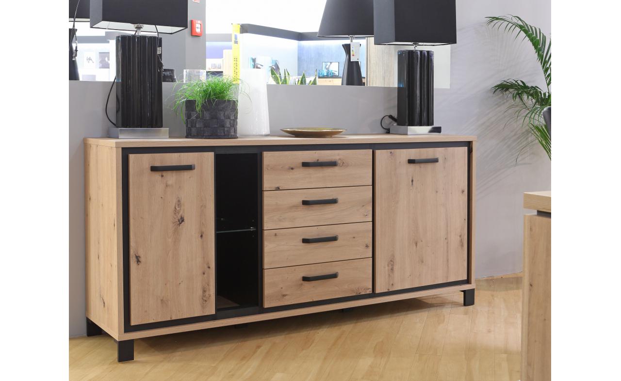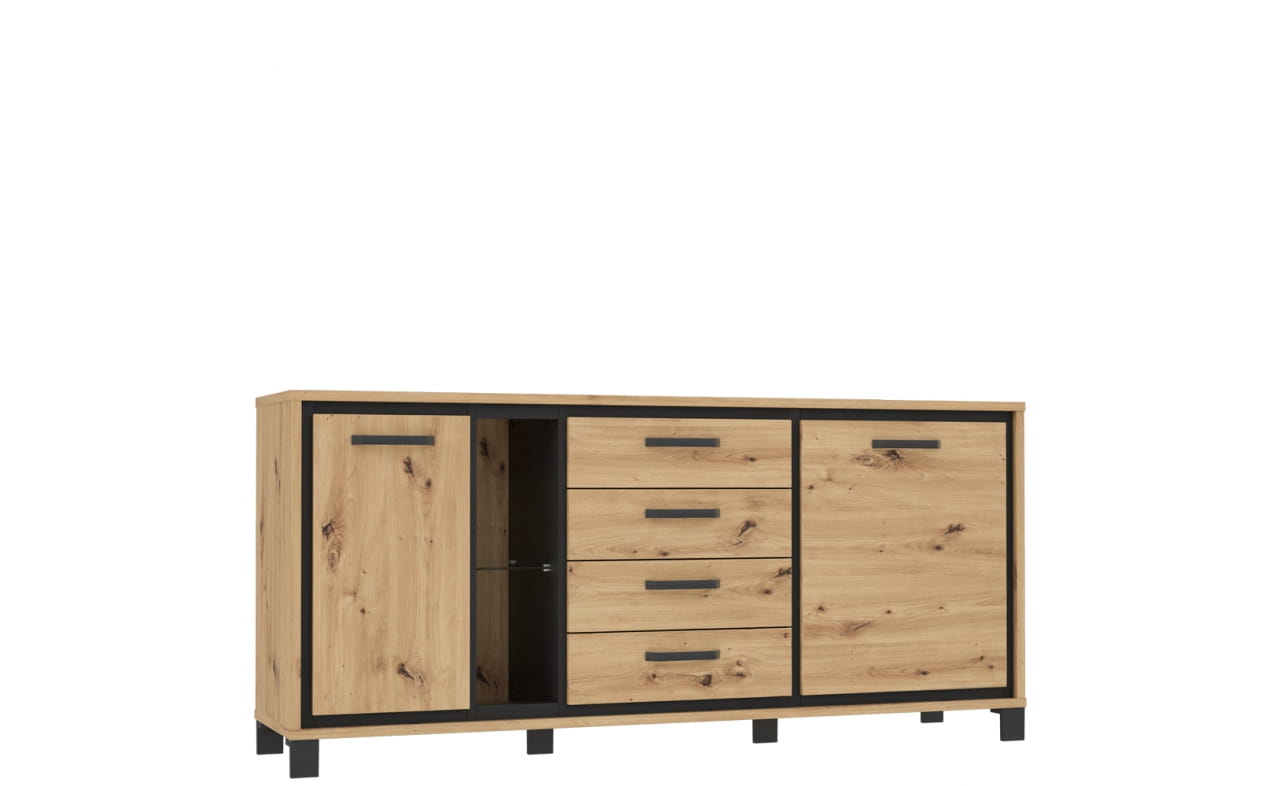 Uniwersalna komoda TRONDHEIM TDHK242L w wybarwieniu dębu Artisan połączonego z dębem czarnym idealnie wtopi się do aranżacji Twojego salonu lub jadalni. Pokaźny mebel posiada dwie zamykane szafki, i cztery szuflady dzięki czemu idealnie sprawdzi się w salonie, ale również w dużej garderobie. Subtelne barwy stworzą idealne tło dla odważnych, nasyconych kolorem dodatków. Komoda TRONDHEIM znakomicie współgra z innymi produktami z kolekcji.
