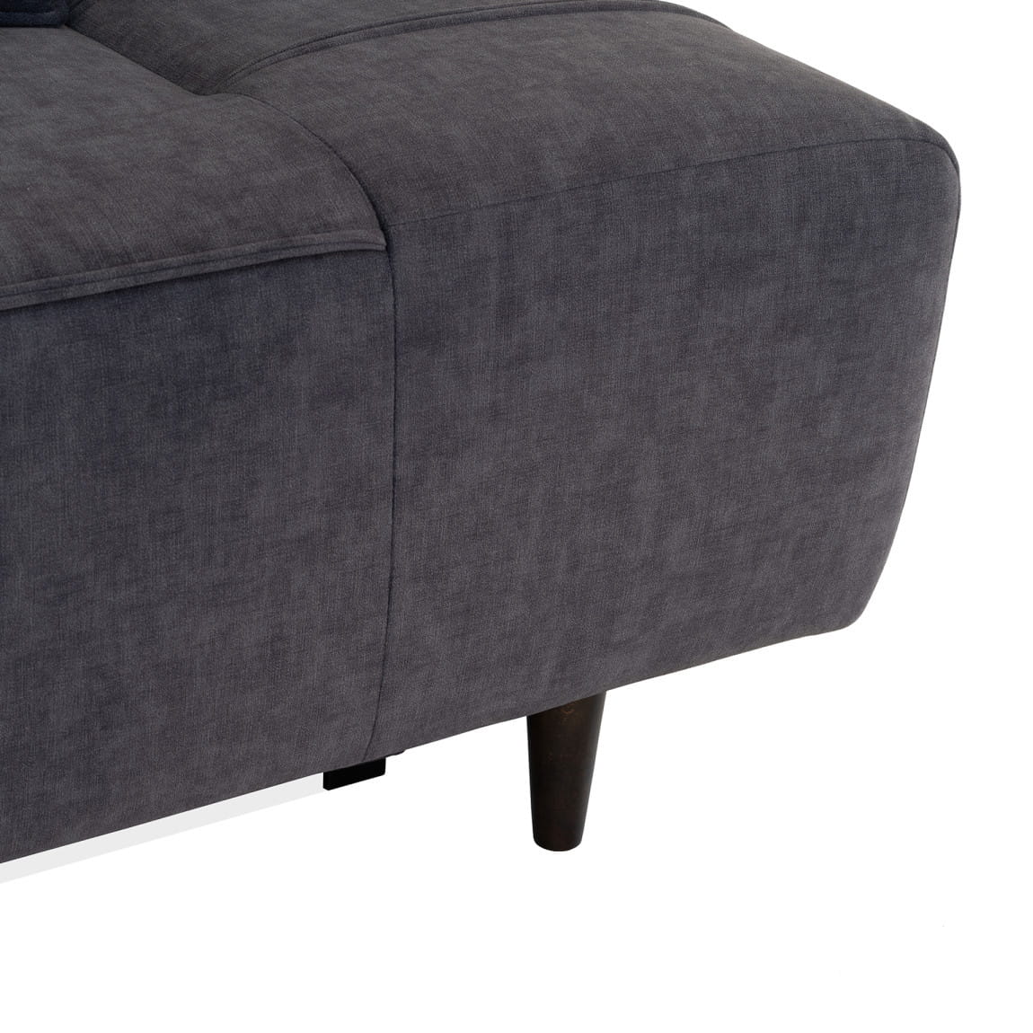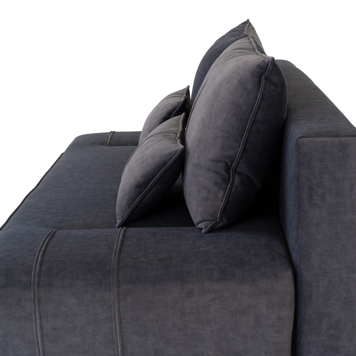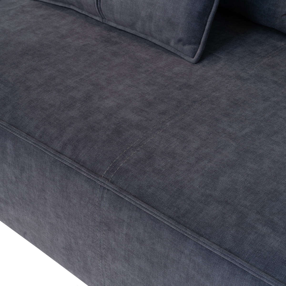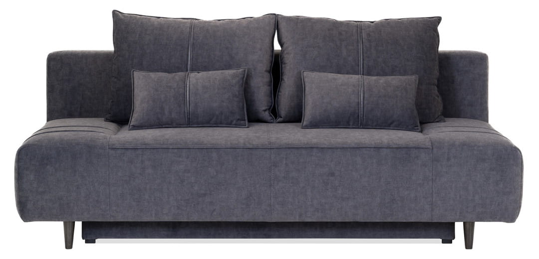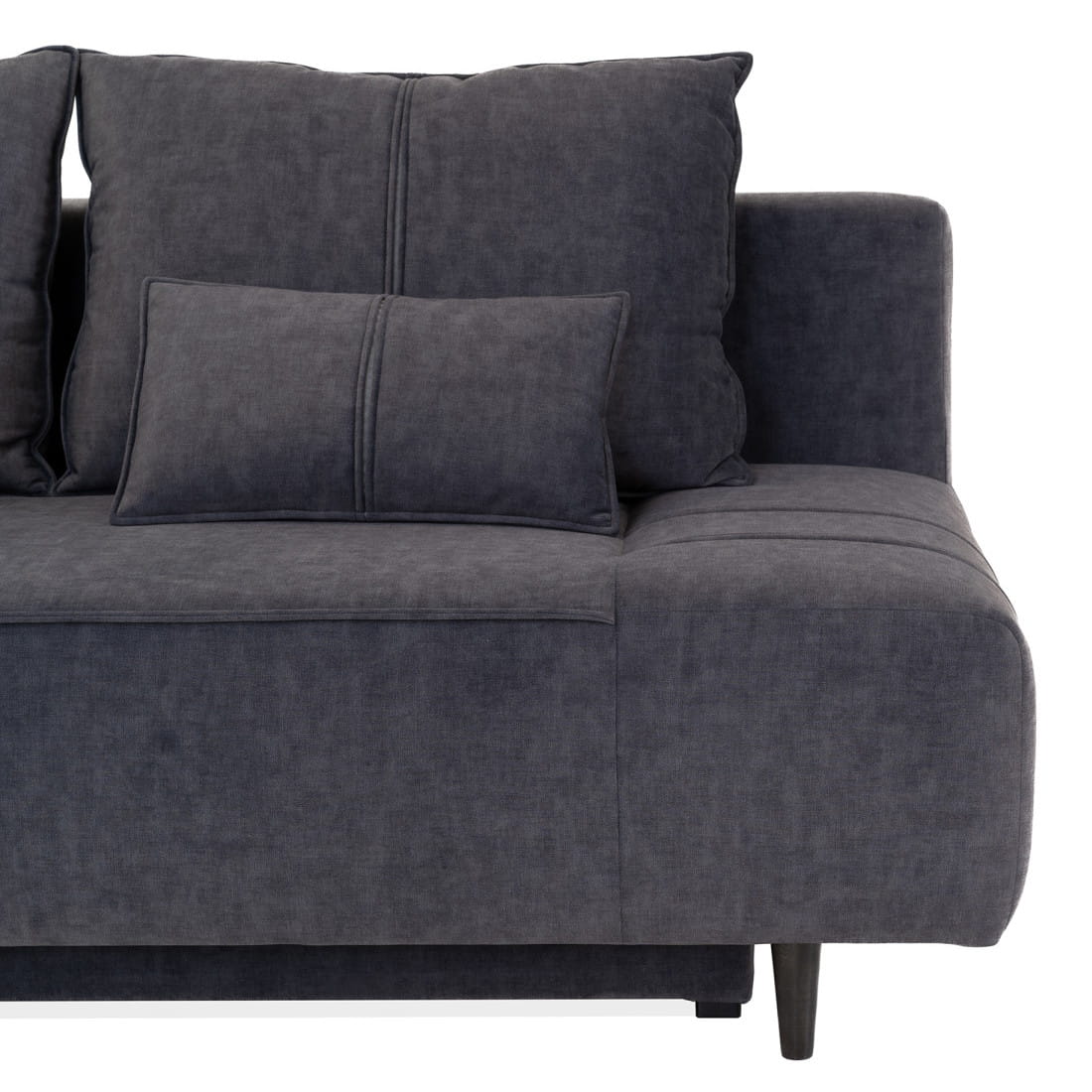 Na poduszkach i siedzisku kanapy znajdują się proste pionowe przeszycia z rozcięciami, które dodają meblowi elegancji oraz przełamują jego jednolitą bryłę. Wysokie, smukłe nóżki, a także lekko zaokrąglone boki nadają całości szyku i lekkości.