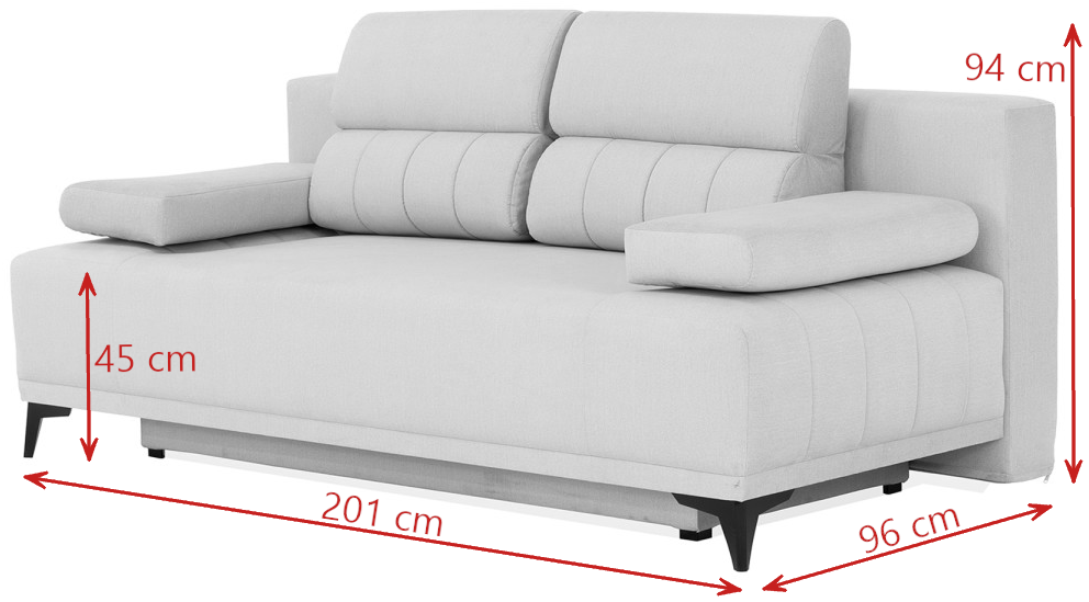 Jej dodatkową zaletą jest funkcja spania, która zapewnia wygodne miejsce do wypoczynku dla Twoich gości o powierzchni 200x150 cm. Kanapa rozkłada się prostym sposobem za pomocą mechanizmu wspomagającego rozkładanie. Wystarczy unieść i wysunąć siedzisko, a w jego miejsce położyć oparcie.