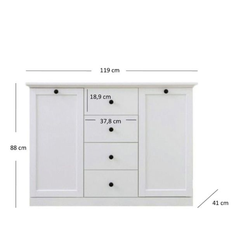 Komoda BRANDSON wyposażona jest w półki zamykane na fronty oraz szuflady. Idealnie sprawdzi się w aranżacji pomieszczeń takich jak: pokój dzienny, salon, przedpokój, sypialnia, gabinet lub pokój młodzieżowy. Prosty design kolekcji zapewnia mnóstwo wspaniałych aranżacji. Biel mebli została przełamana punktowymi, czarnymi uchwytami. Kolekcja BRANDSON zaprojektowana została tak, aby jej tradycyjny charakter był ponadczasowy, a przy tym funkcjonalny, ponieważ białe meble pasują do każdego wnętrza i każdego koloru ścian.