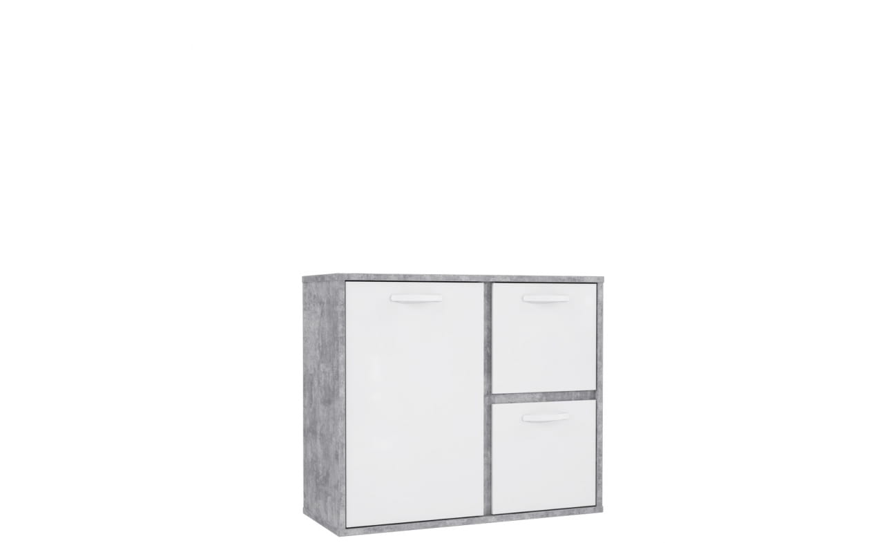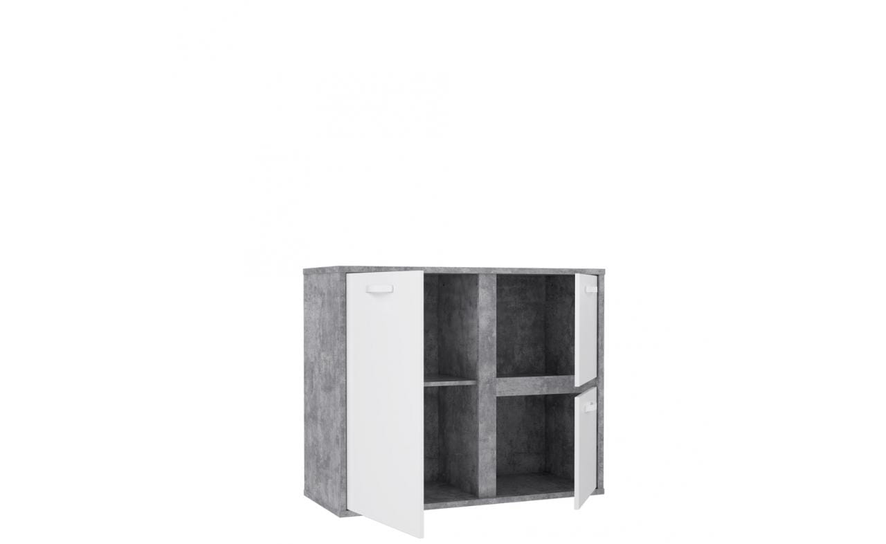 Komoda CANMORE CNMK 211-C273 w biało-szarej tonacji. Komoda posiada dwa boxy zamknięte drzwiczkami i dwie półki zamknięte drzwiczkami. Doskonale uzupełni każde pomieszczenie. Łagodne połączenie jasnoszarego betonu z bielą inspiruje do odkrywania tajemnic wyobraźni i głęboko ukrytych pokładów kreatywności.