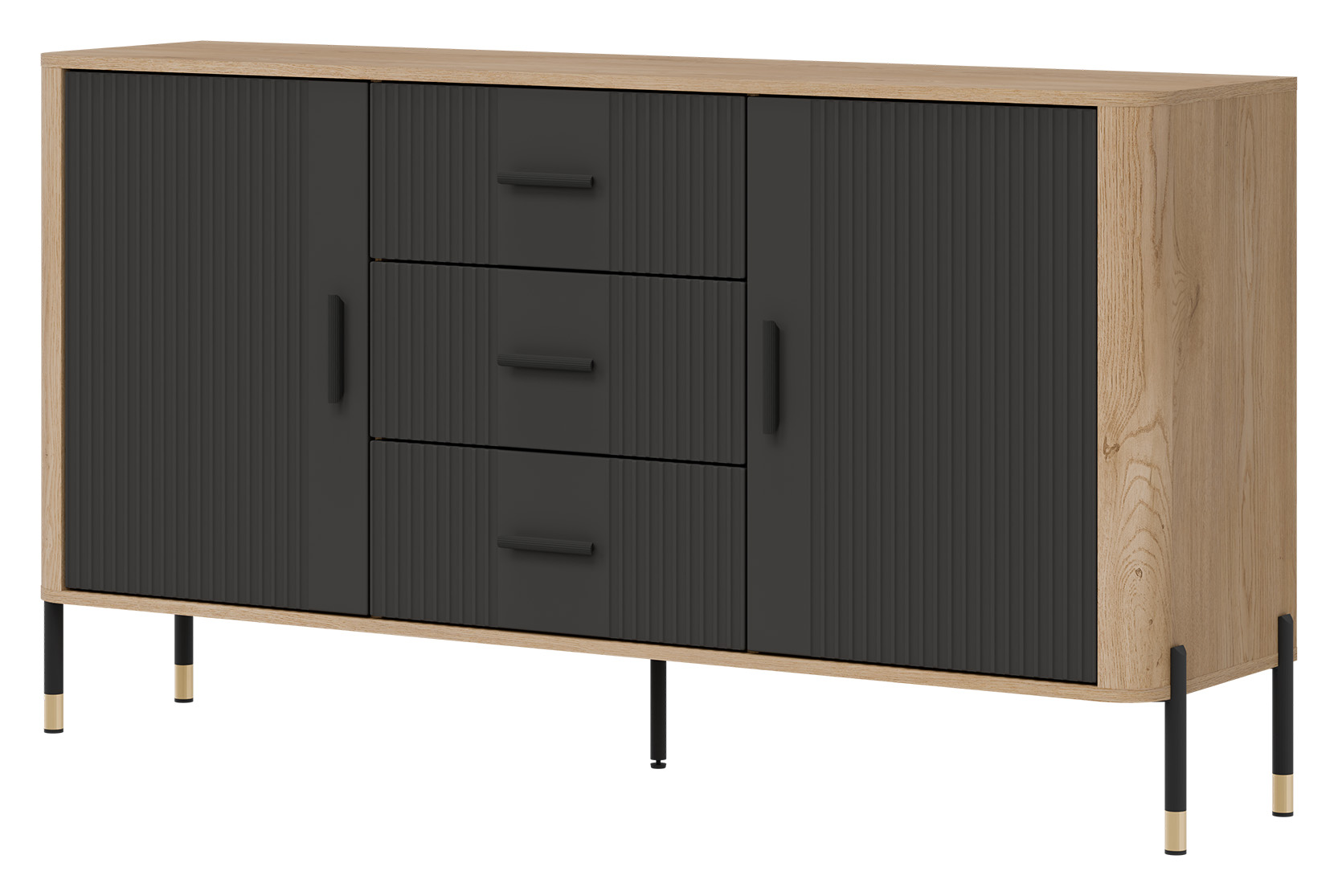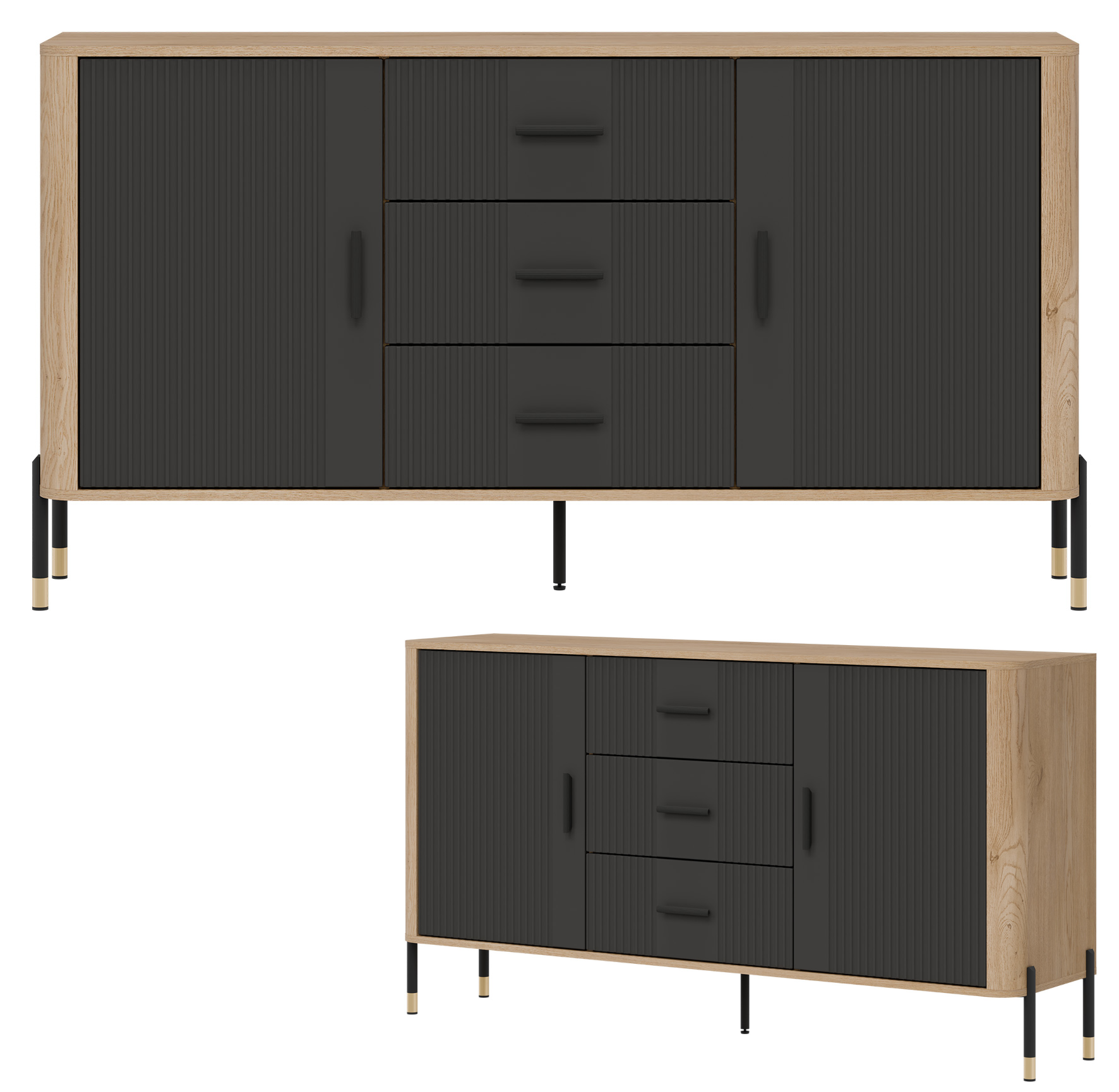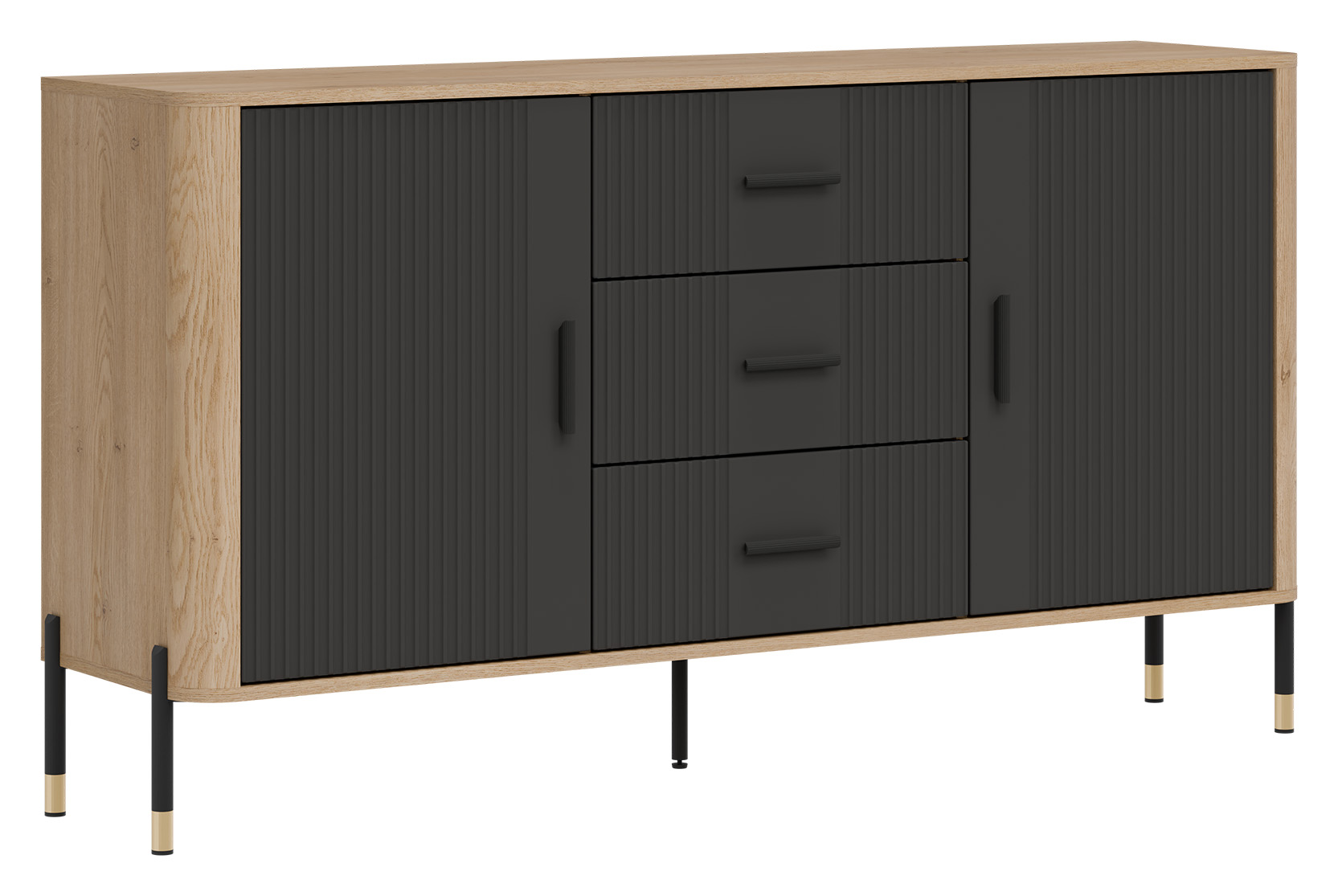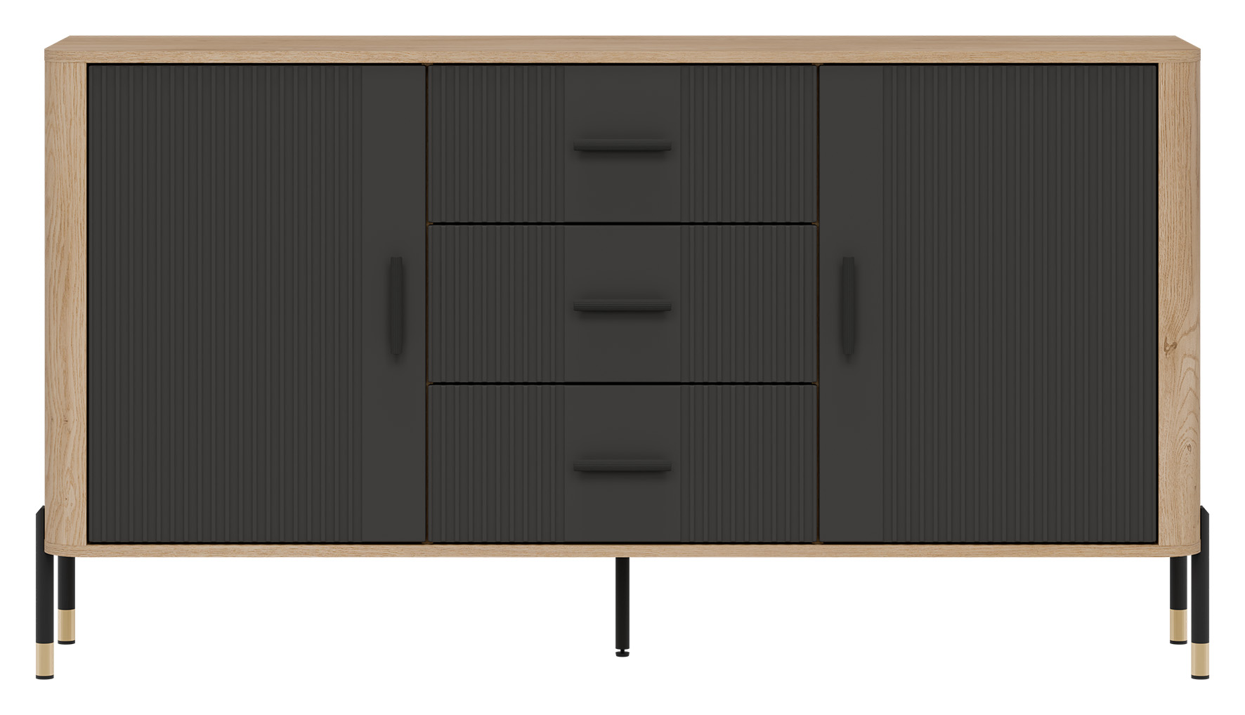 Korpus w kolorze naturalnego dębu cremona torro kontrastuje z ryflowanymi frontami w antracytowym kolorze o matowym wykończeniu, tworząc nowoczesne i eleganckie zestawienie. Czarne uchwyty i smukłe, metalowe nogi nadają meblowi lekkości i luksusowego charakteru, jednocześnie zapewniając jego stabilność. Dodatkowa środkowa noga zwiększa wytrzymałość całej konstrukcji.