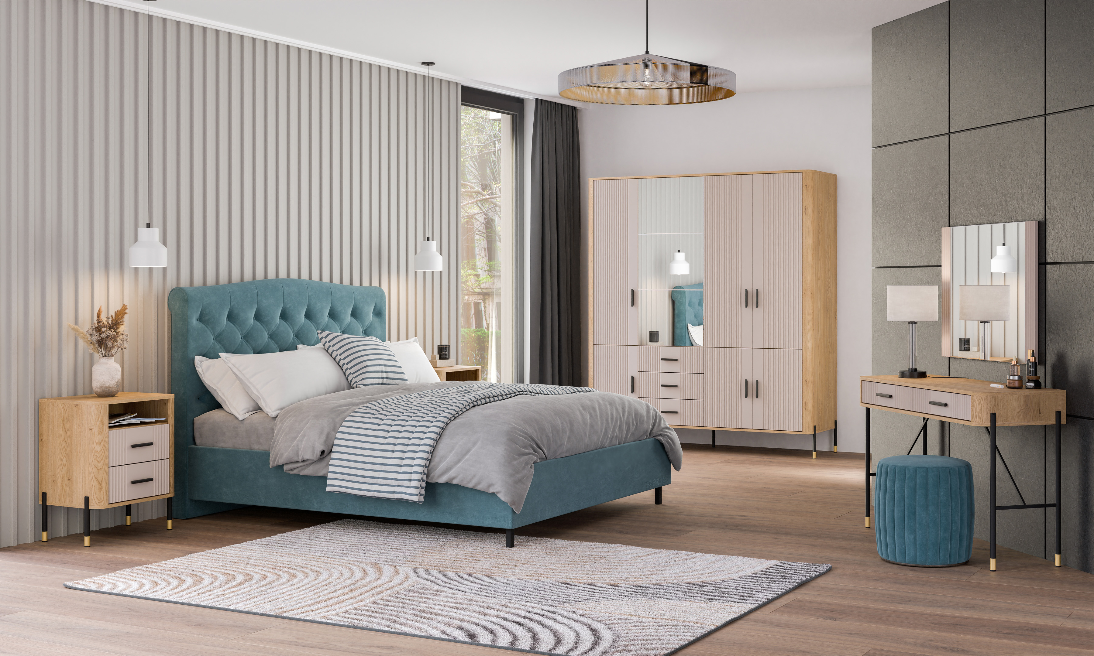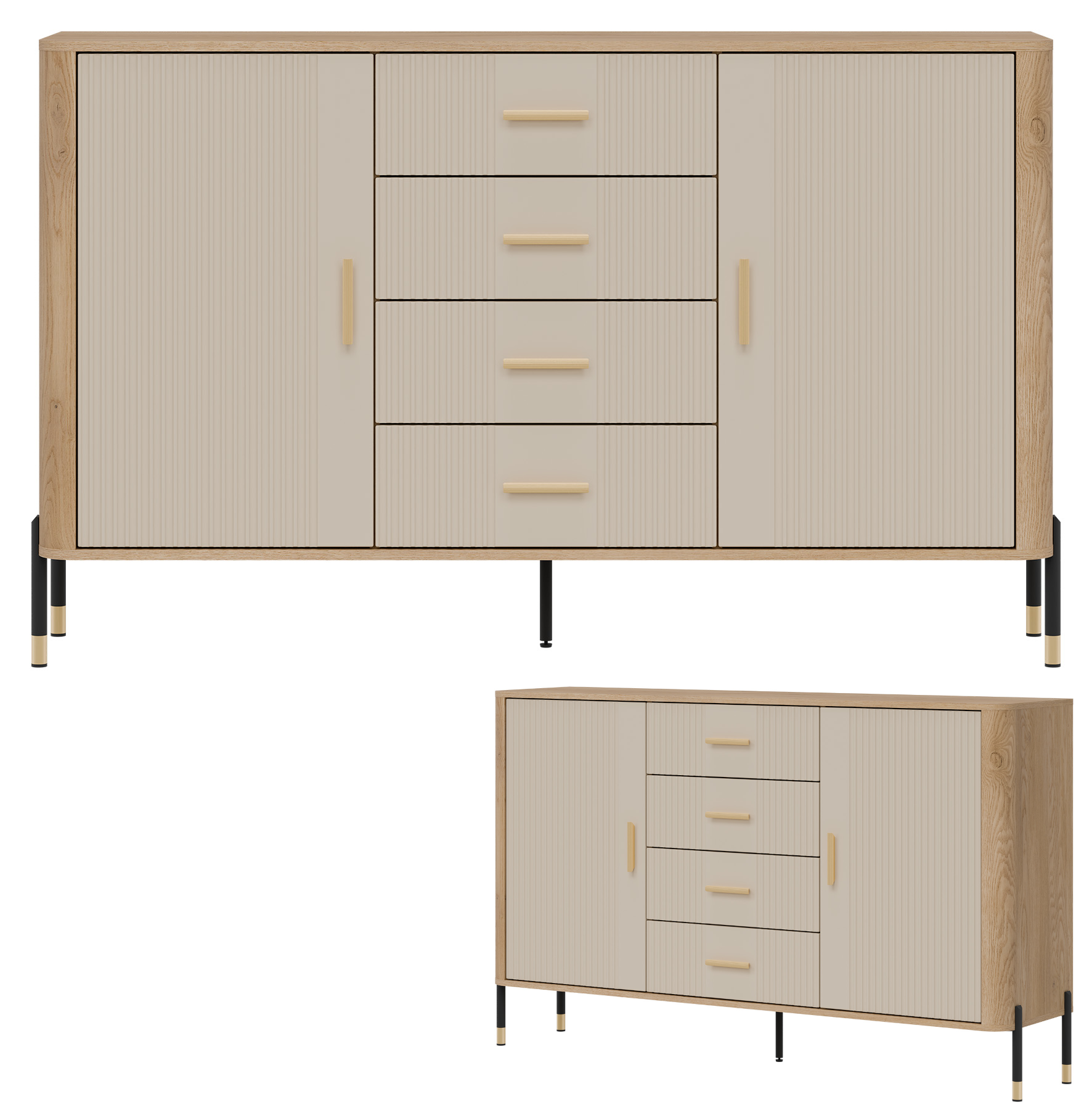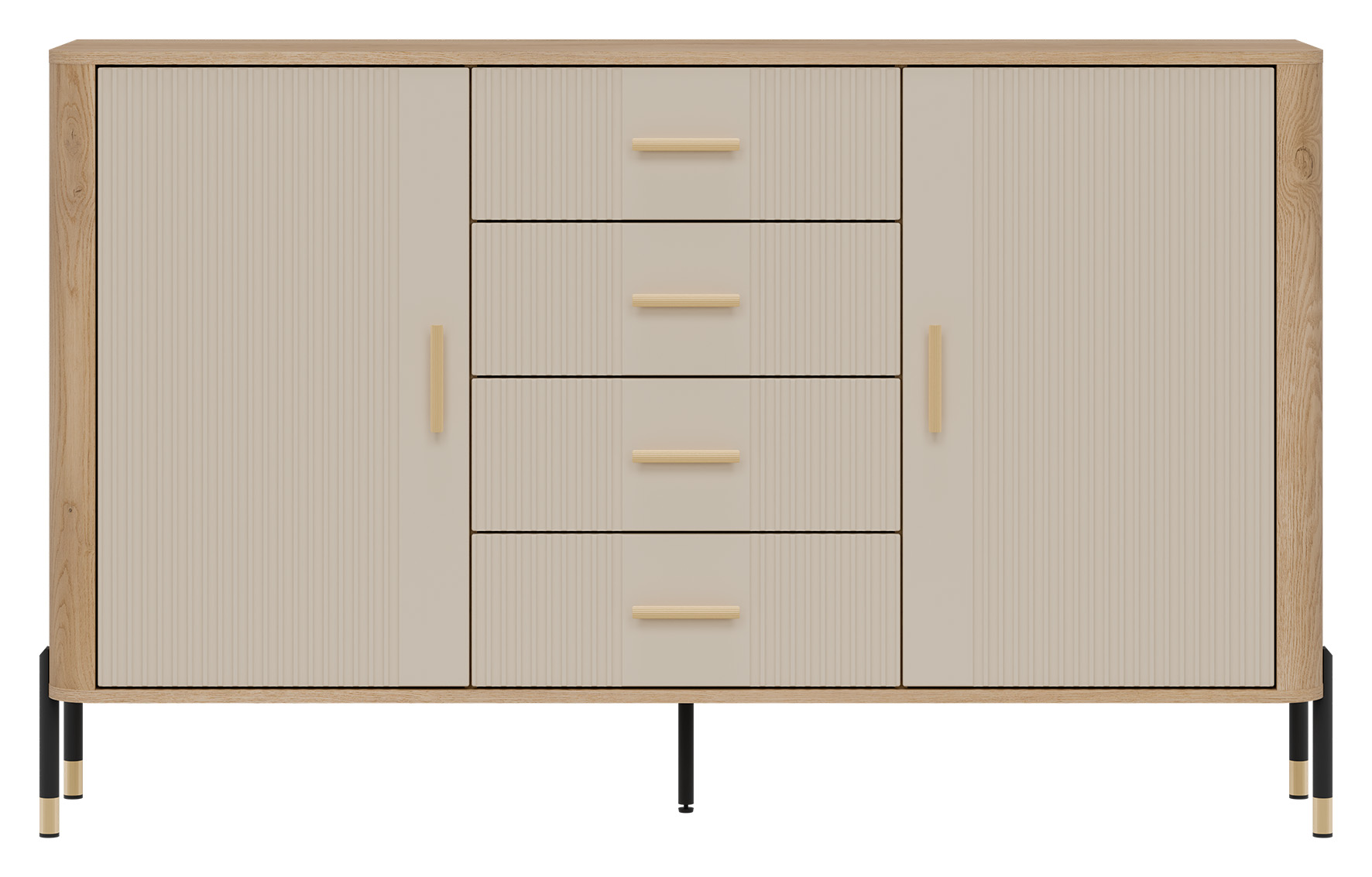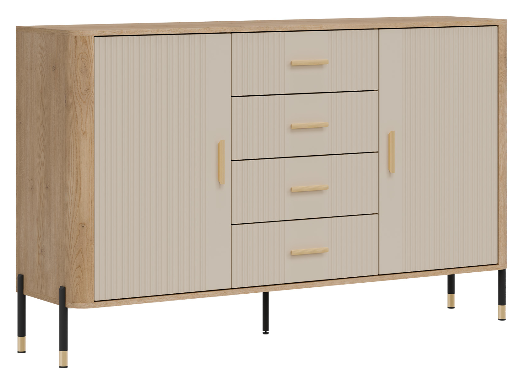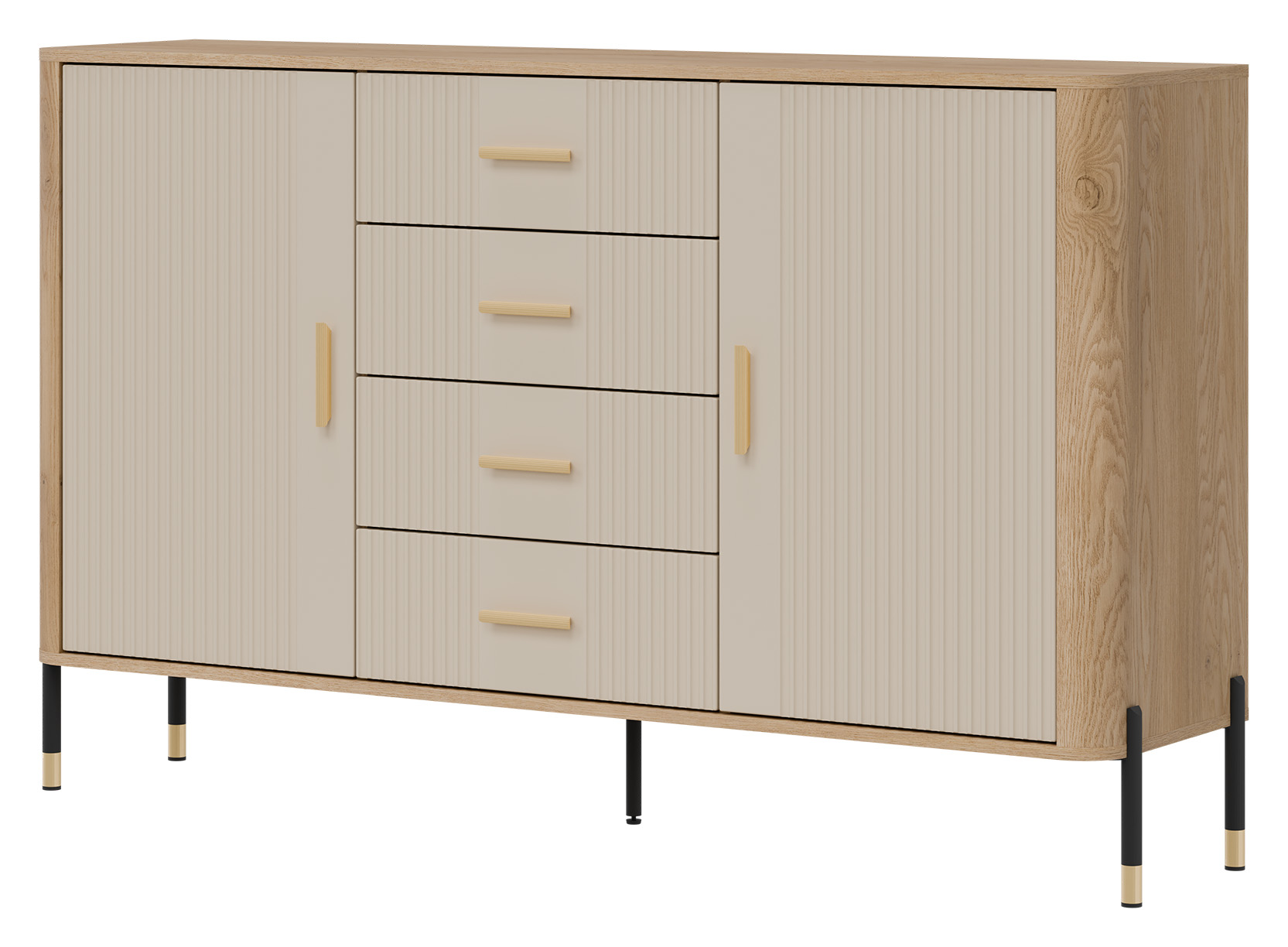 Estetykę komody podkreśla kontrastowy design – ryflowane fronty w kaszmirowym kolorze o matowym wykończeniu zestawione z korpusem w naturalnym odcieniu dębu cremona torro tworzą wyrafinowaną, a zarazem uniwersalną kompozycję kolorystyczną. Złote uchwyty w minimalistycznym stylu oraz metalowe nogi w czarno-złotym wykończeniu dopełniają całości, dodając meblowi subtelnej elegancji i lekkości.