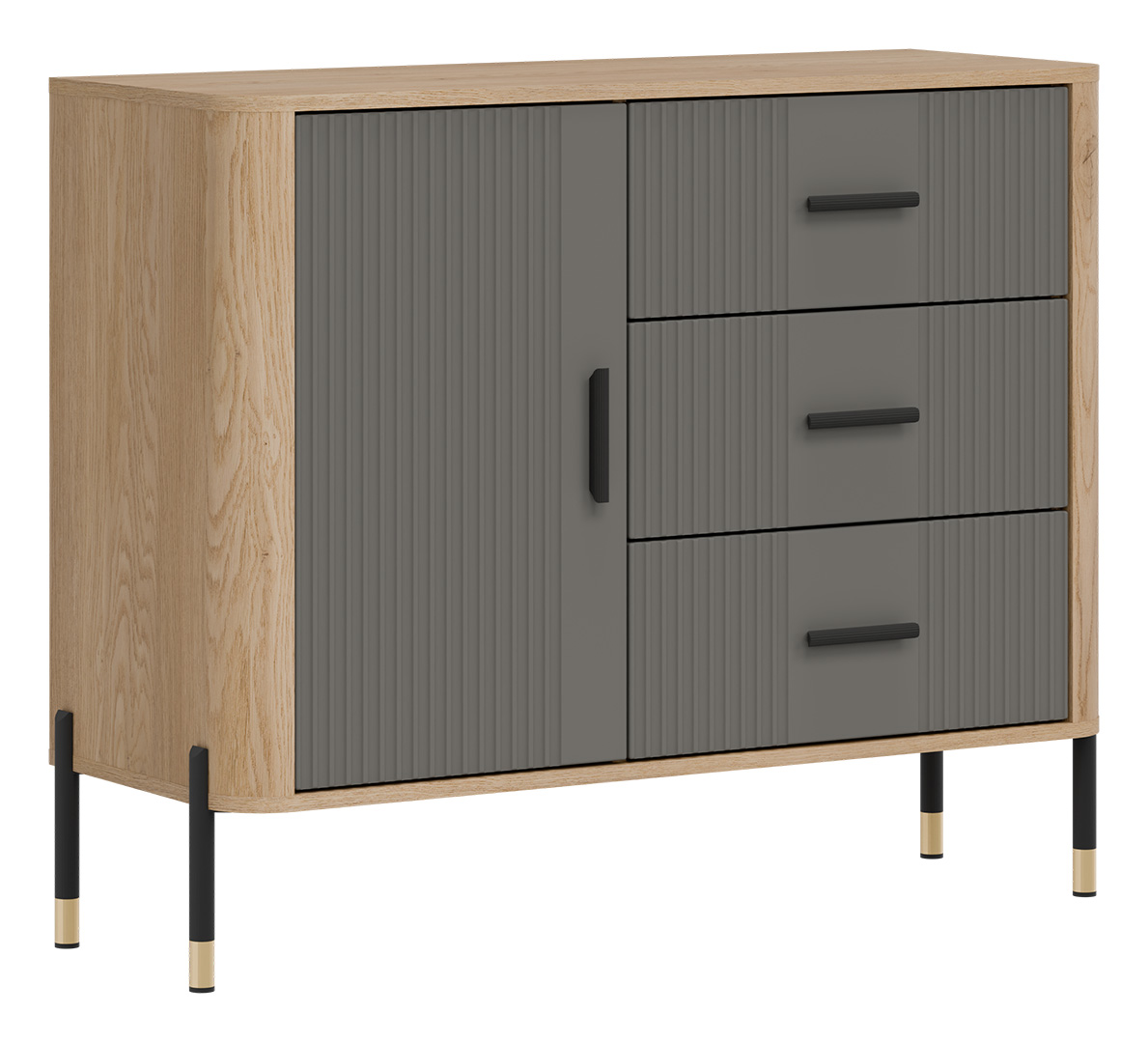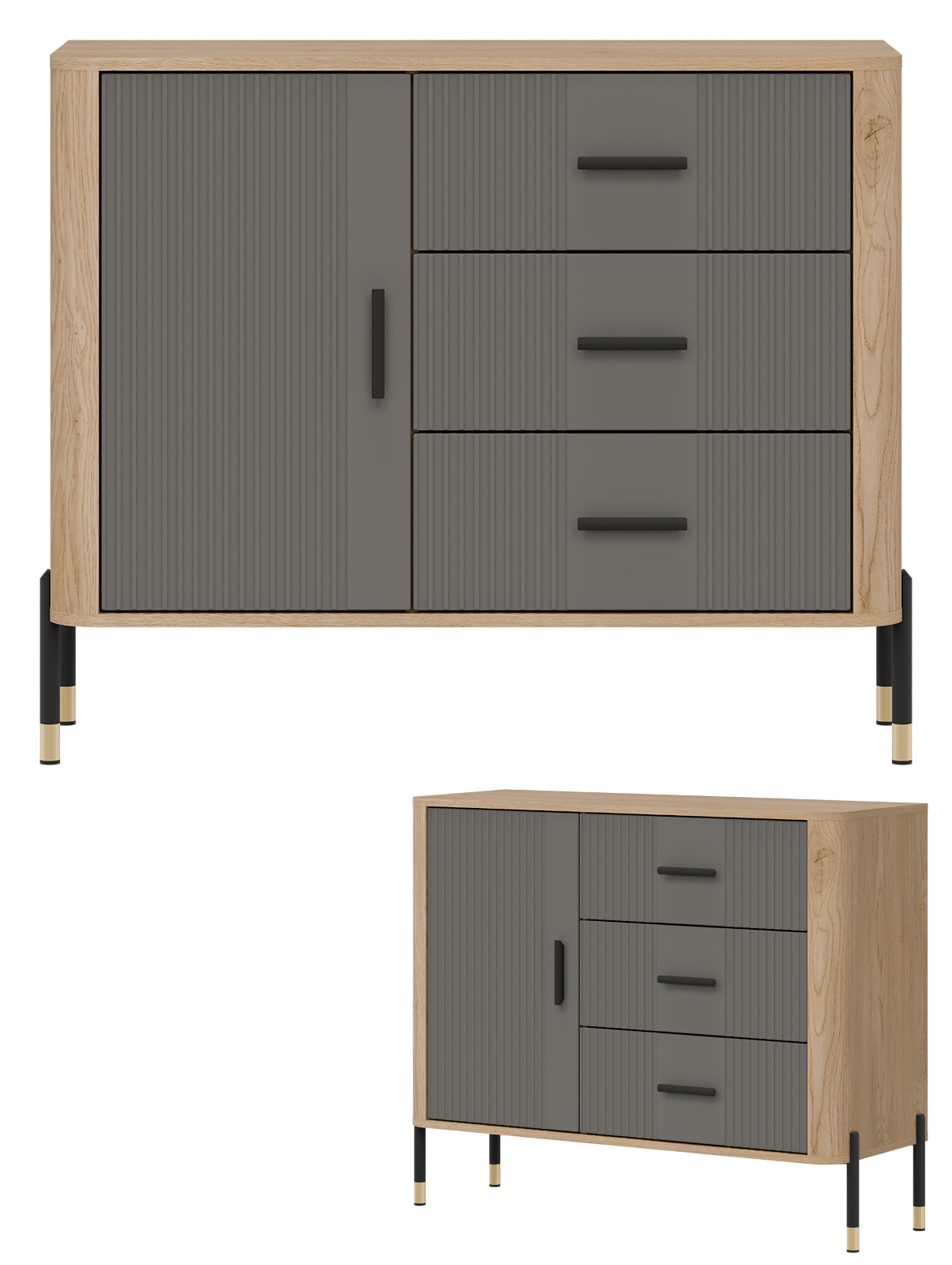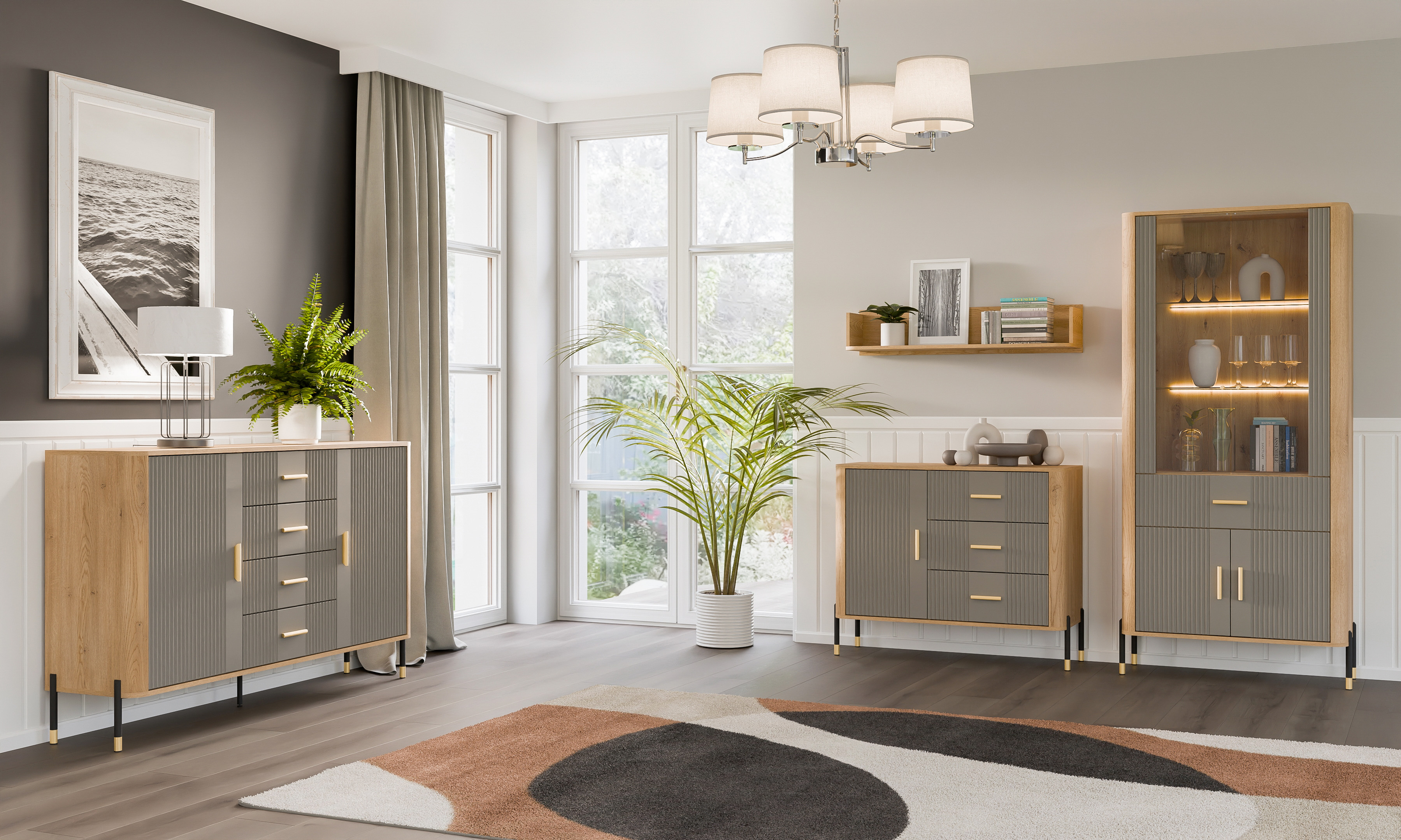 Komoda zachwyca starannie dobranym zestawieniem materiałów i wybarwienia. Ryflowane fronty w szarym kolorze o matowym wykończeniu współgrają z ciepłym odcieniem naturalnego dębu cremona torro, tworząc spójną i nowoczesną kompozycję. Przyciągające wzrok detale – w postaci smukłych czarnych uchwytów i subtelnych wykończeń nóg – dodają całości luksusowego sznytu, podkreślając elegancję formy bez przesadnej ekstrawagancji.