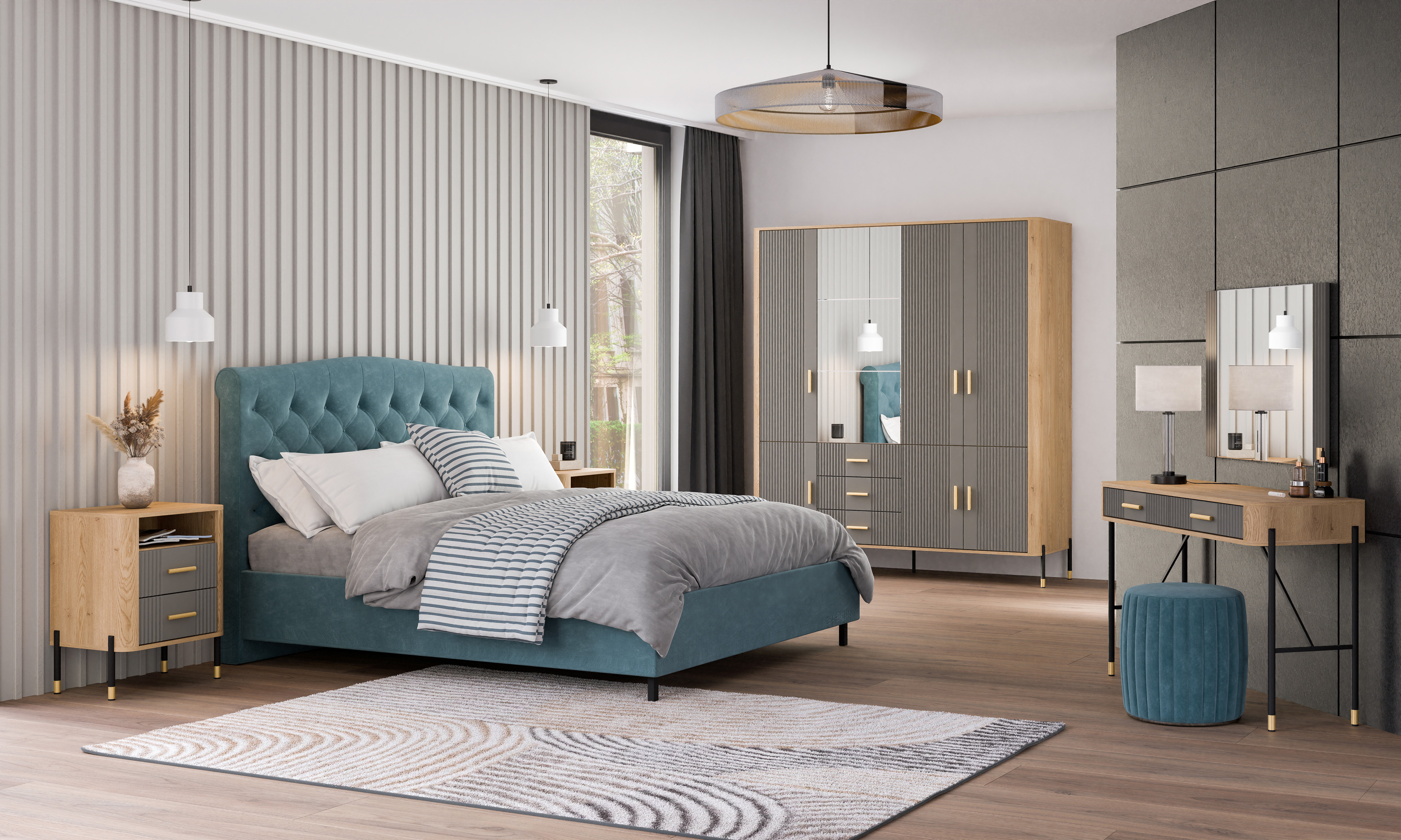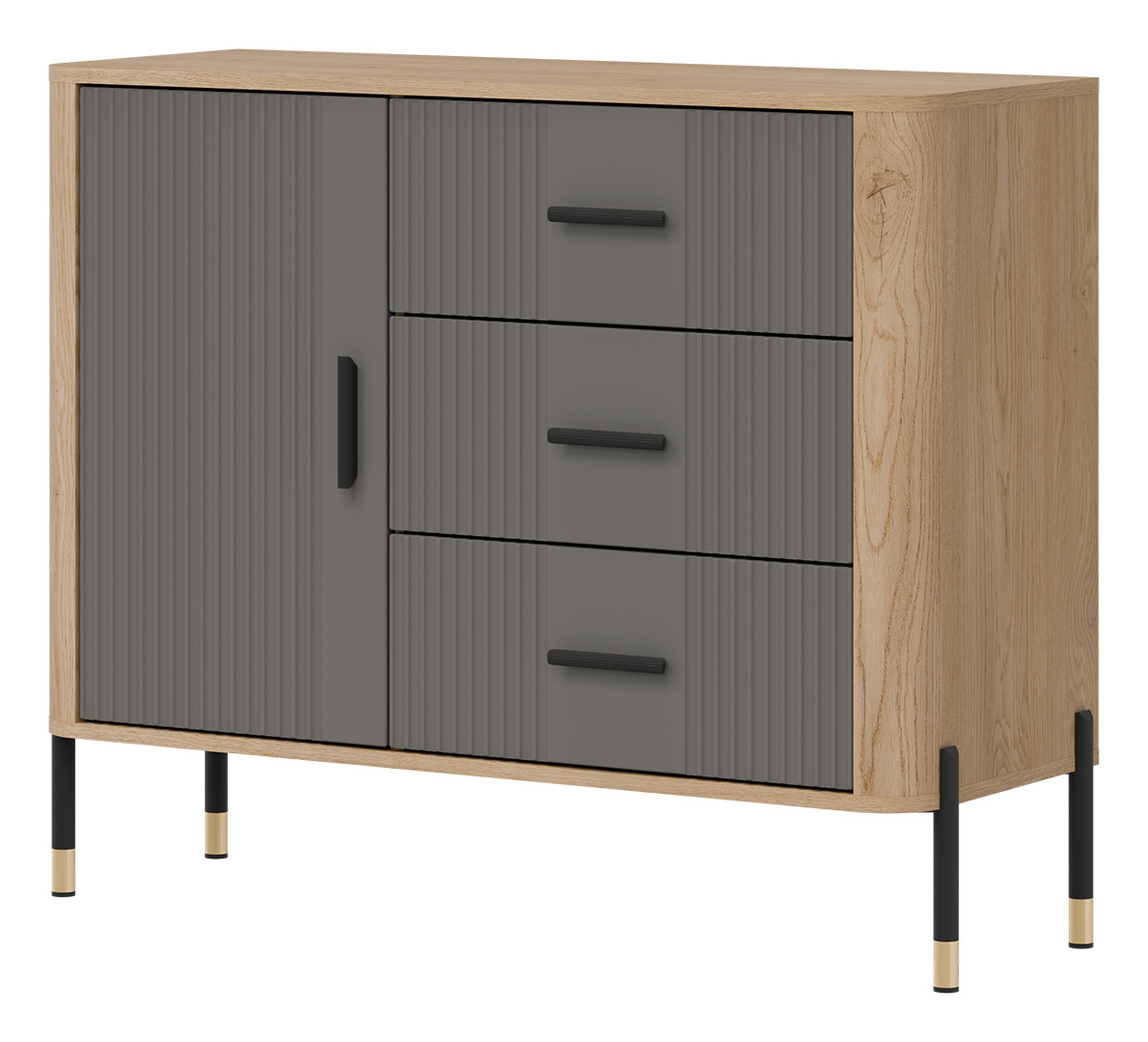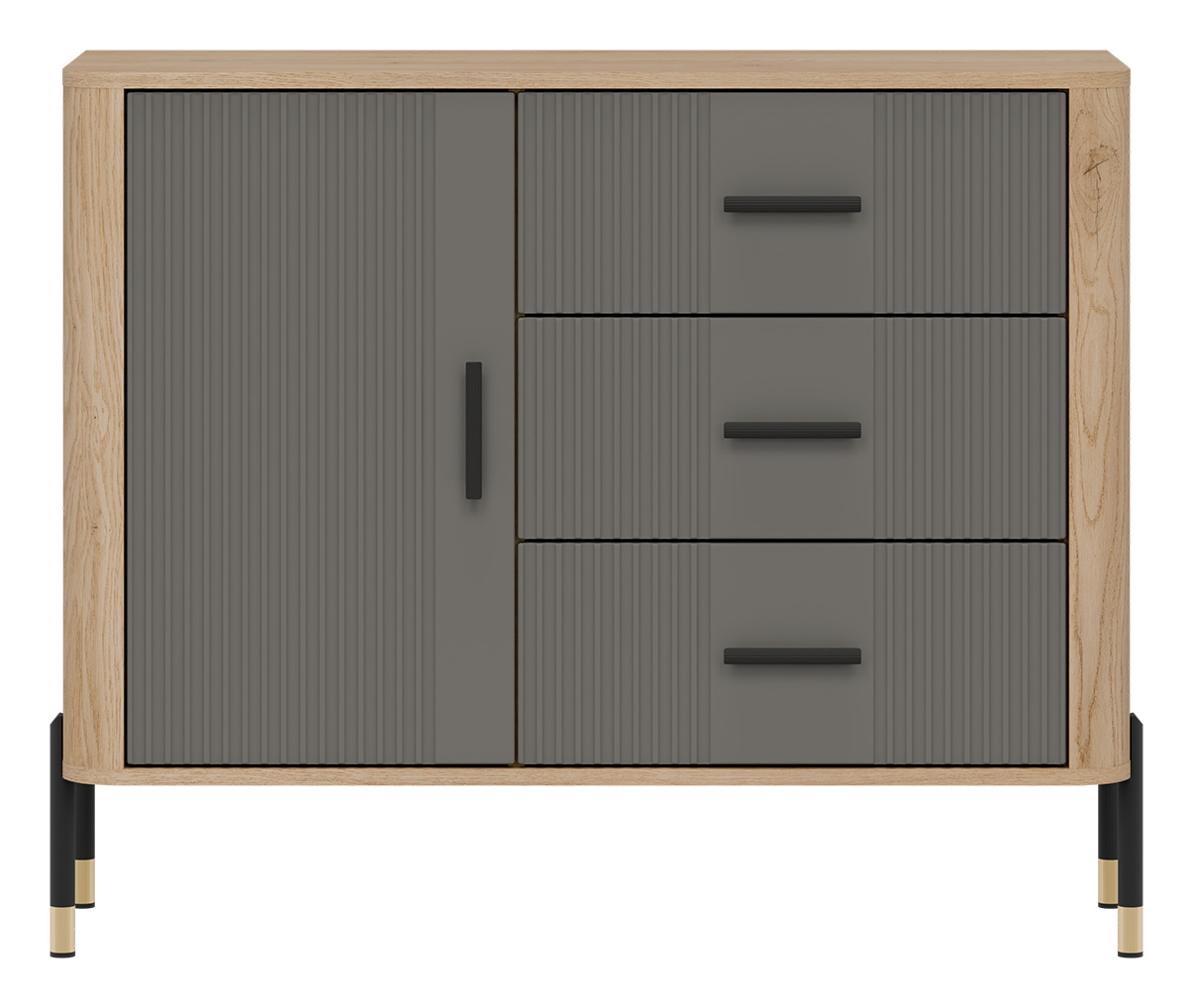 Komoda zachwyca starannie dobranym zestawieniem materiałów i wybarwienia. Ryflowane fronty w szarym kolorze o matowym wykończeniu współgrają z ciepłym odcieniem naturalnego dębu cremona torro, tworząc spójną i nowoczesną kompozycję. Przyciągające wzrok detale – w postaci smukłych czarnych uchwytów i subtelnych wykończeń nóg – dodają całości luksusowego sznytu, podkreślając elegancję formy bez przesadnej ekstrawagancji.