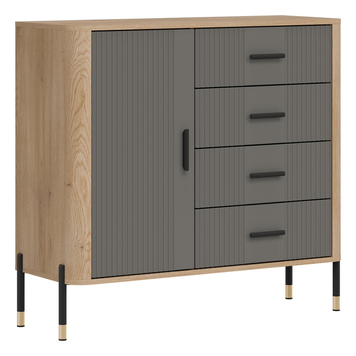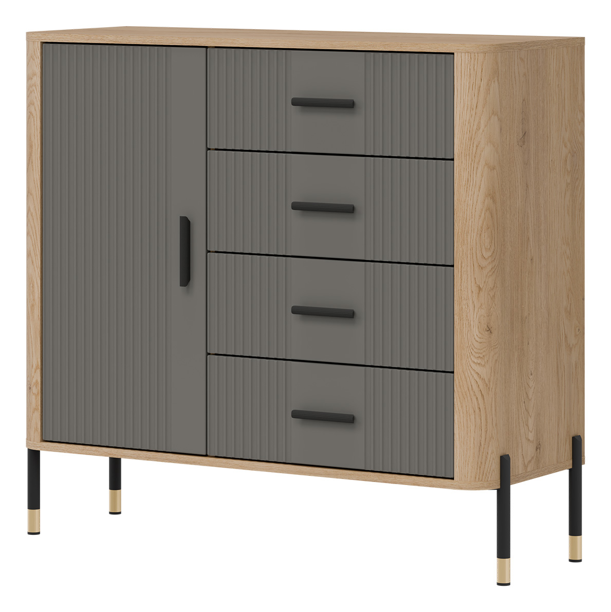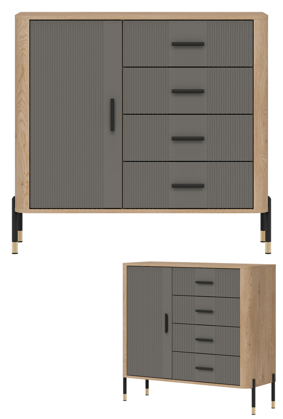Wizualnie mebel przyciąga wzrok kontrastowym zestawieniem kolorystycznym – głęboka kolorystyka ryflowanych frontów w szarym kolorze o matowym wykończeniu zestawiona z ciepłym odcieniem naturalnego dębu cremona torro, które tworzy subtelną ramę. Elegancji dodają smukłe, czarne uchwyty oraz nowoczesne metalowe nogi w czarno-złotym wykończeniu, które nadają konstrukcji lekkości i podkreślają jej loftowy charakter.