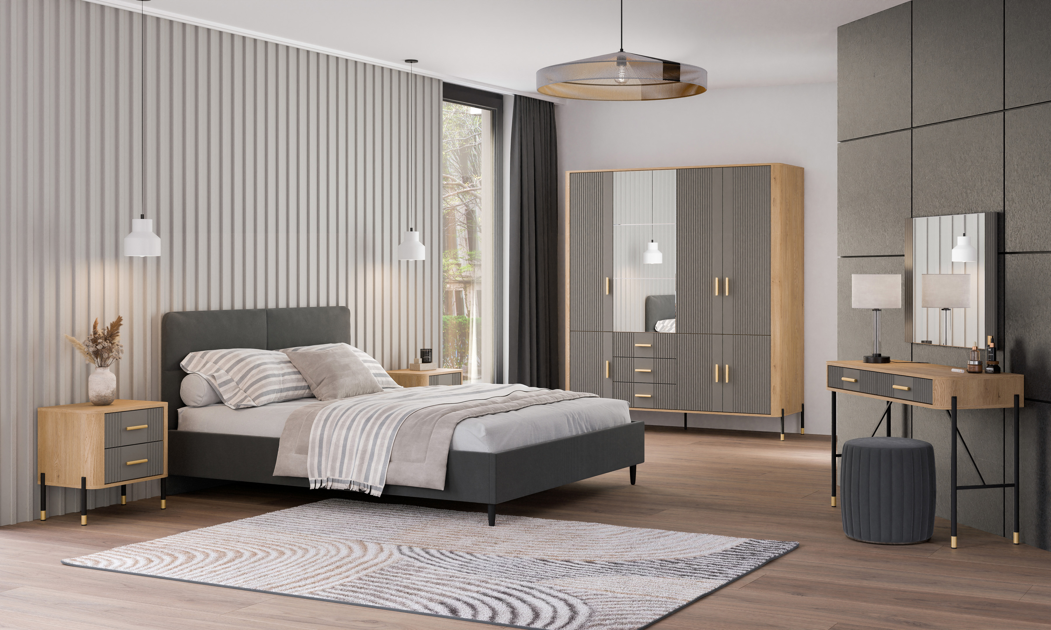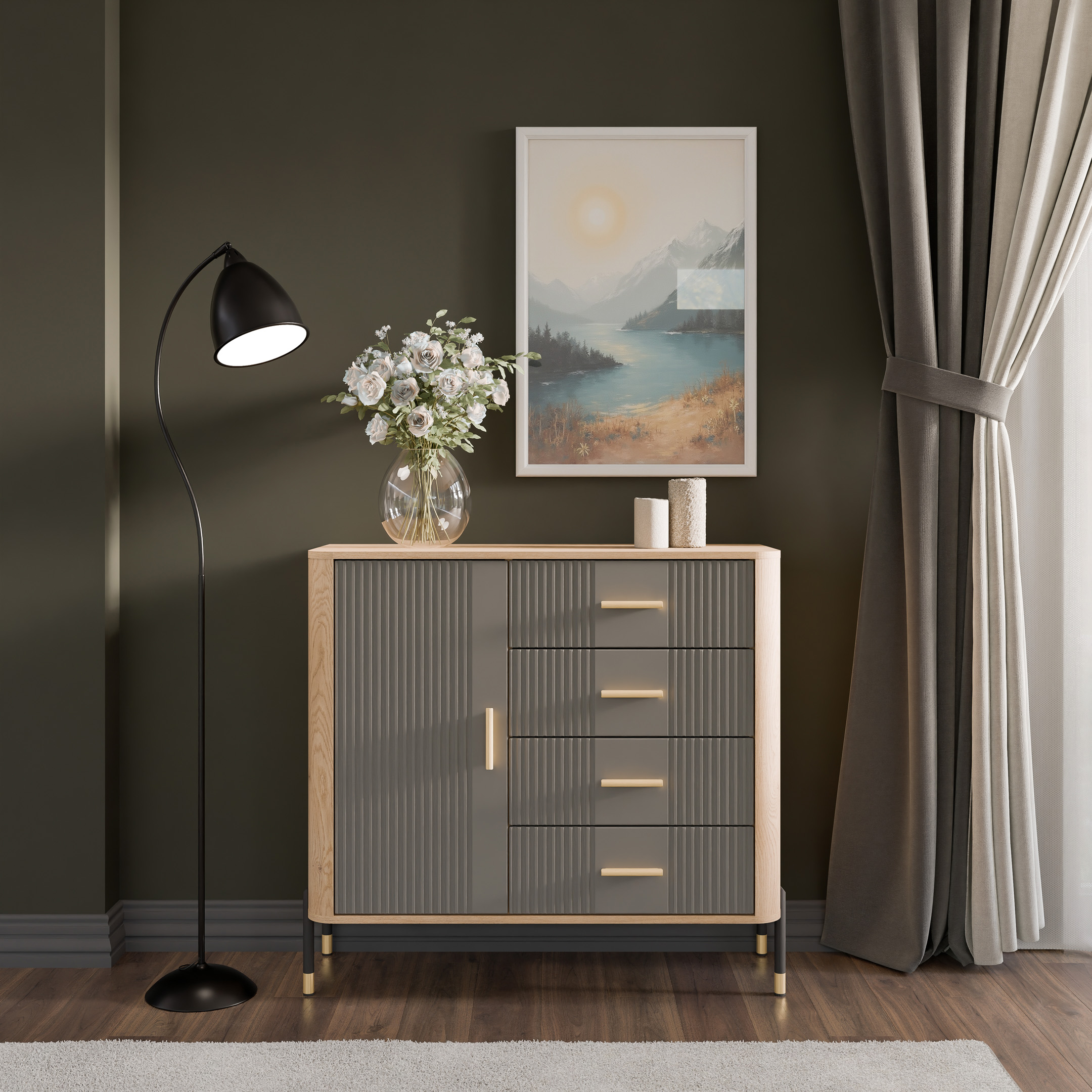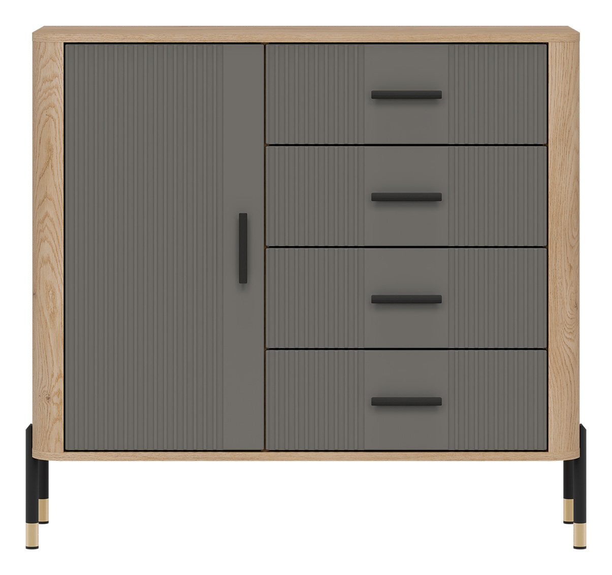 Wizualnie mebel przyciąga wzrok kontrastowym zestawieniem kolorystycznym – głęboka kolorystyka ryflowanych frontów w szarym kolorze o matowym wykończeniu zestawiona z ciepłym odcieniem naturalnego dębu cremona torro, które tworzy subtelną ramę. Elegancji dodają smukłe, czarne uchwyty oraz nowoczesne metalowe nogi w czarno-złotym wykończeniu, które nadają konstrukcji lekkości i podkreślają jej loftowy charakter.