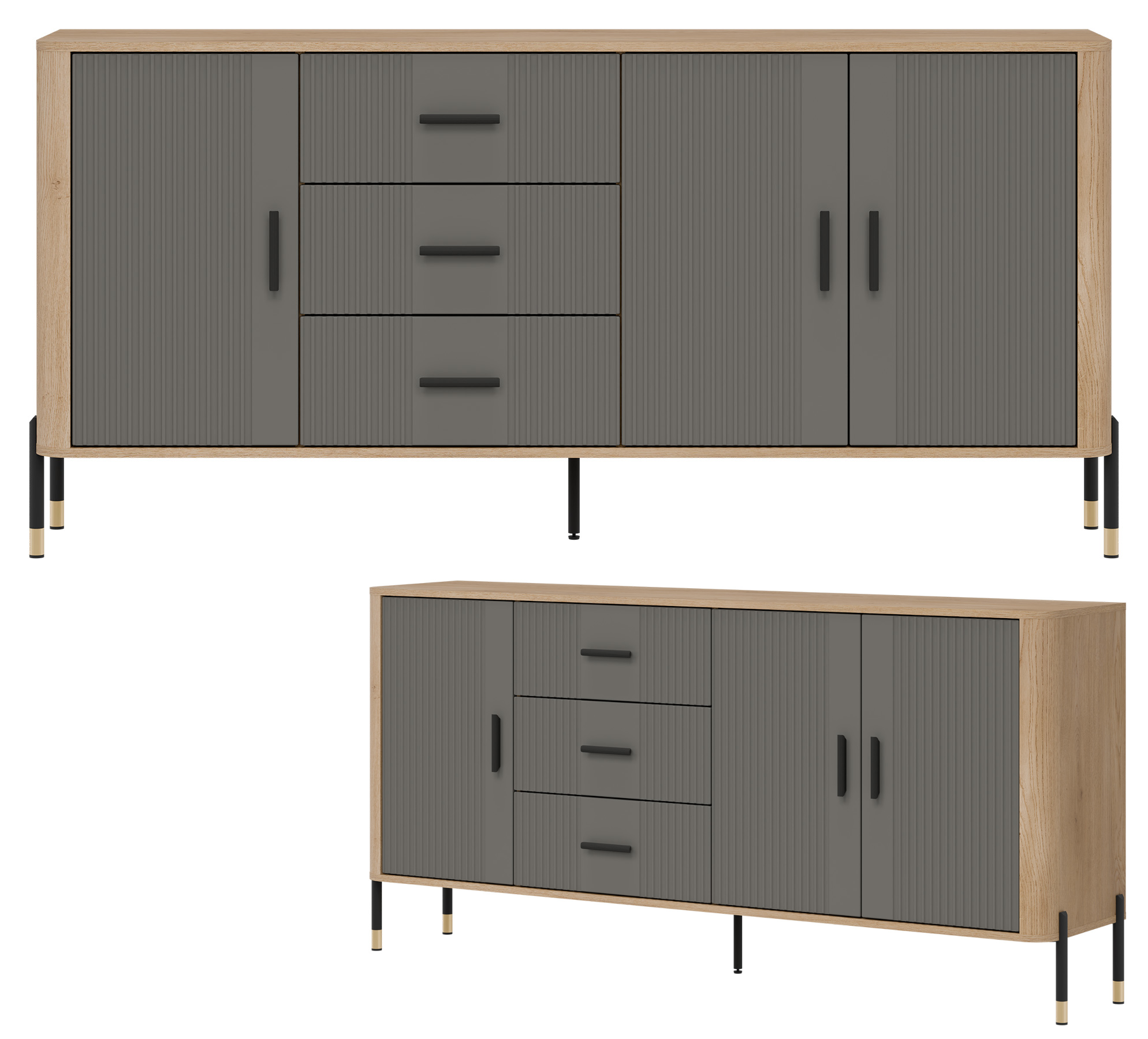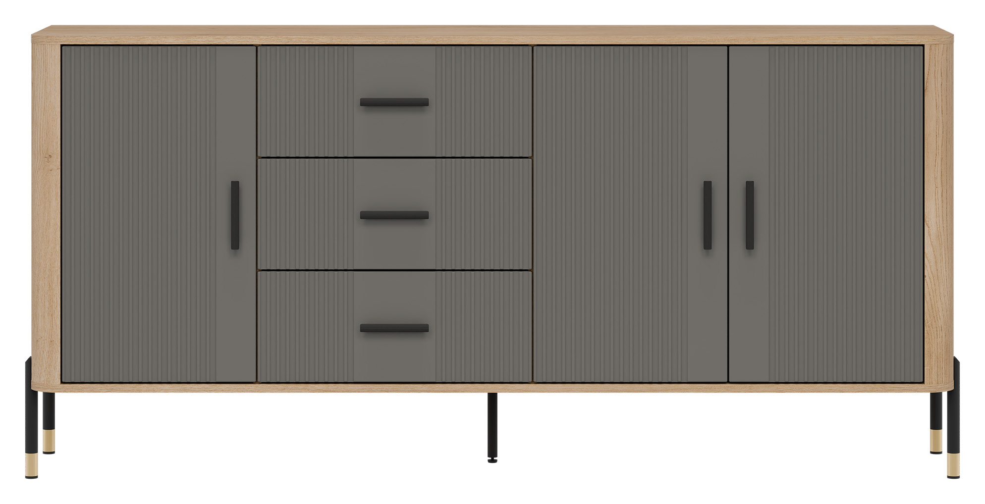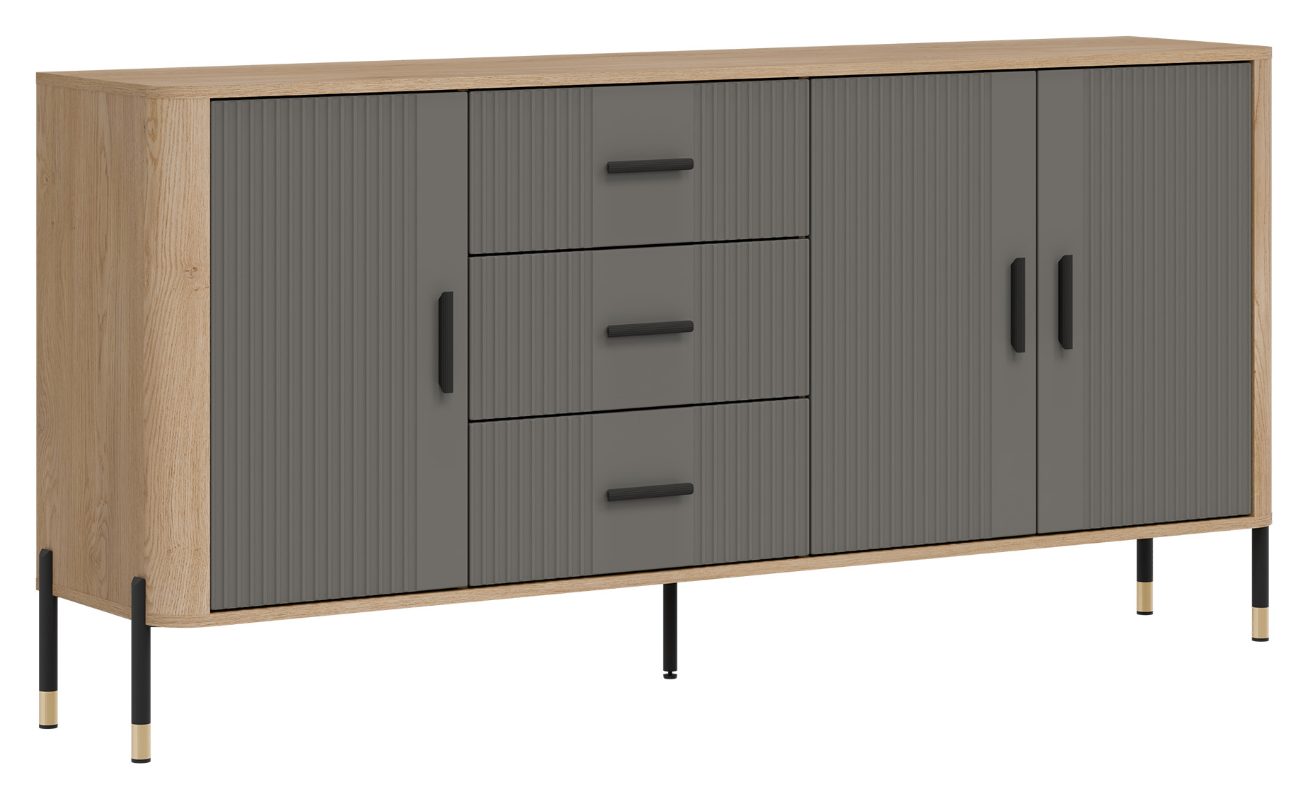 Wizualnie komoda zachwyca kontrastowym połączeniem kolorów: ryflowanych frontów dostępnych w szarym kolorze o matowym wykończeniu i ciepłego odcienia naturalnego dębu cremona torro, który tworzy korpus mebla. Całość dopełniają do wyboru czarne uchwyty oraz metalowe nogi wykończone w eleganckim, czarno-złotym stylu, co dodaje meblowi nowoczesnego szyku i wizualnej lekkości. Środkowa dodatkowa noga wzmacnia stabilność, co podkreśla wysoką jakość wykonania.