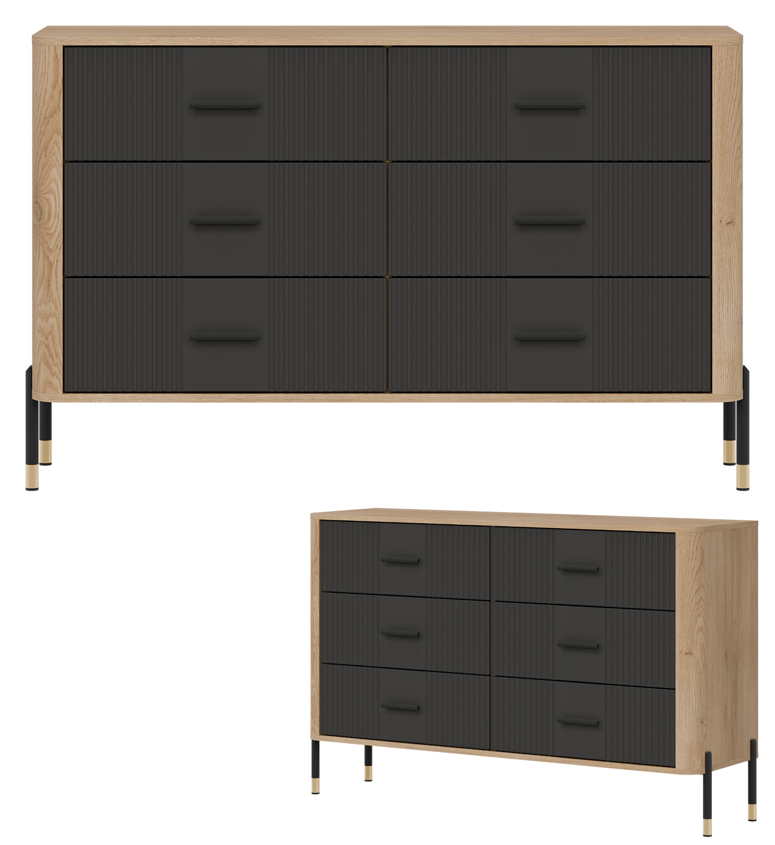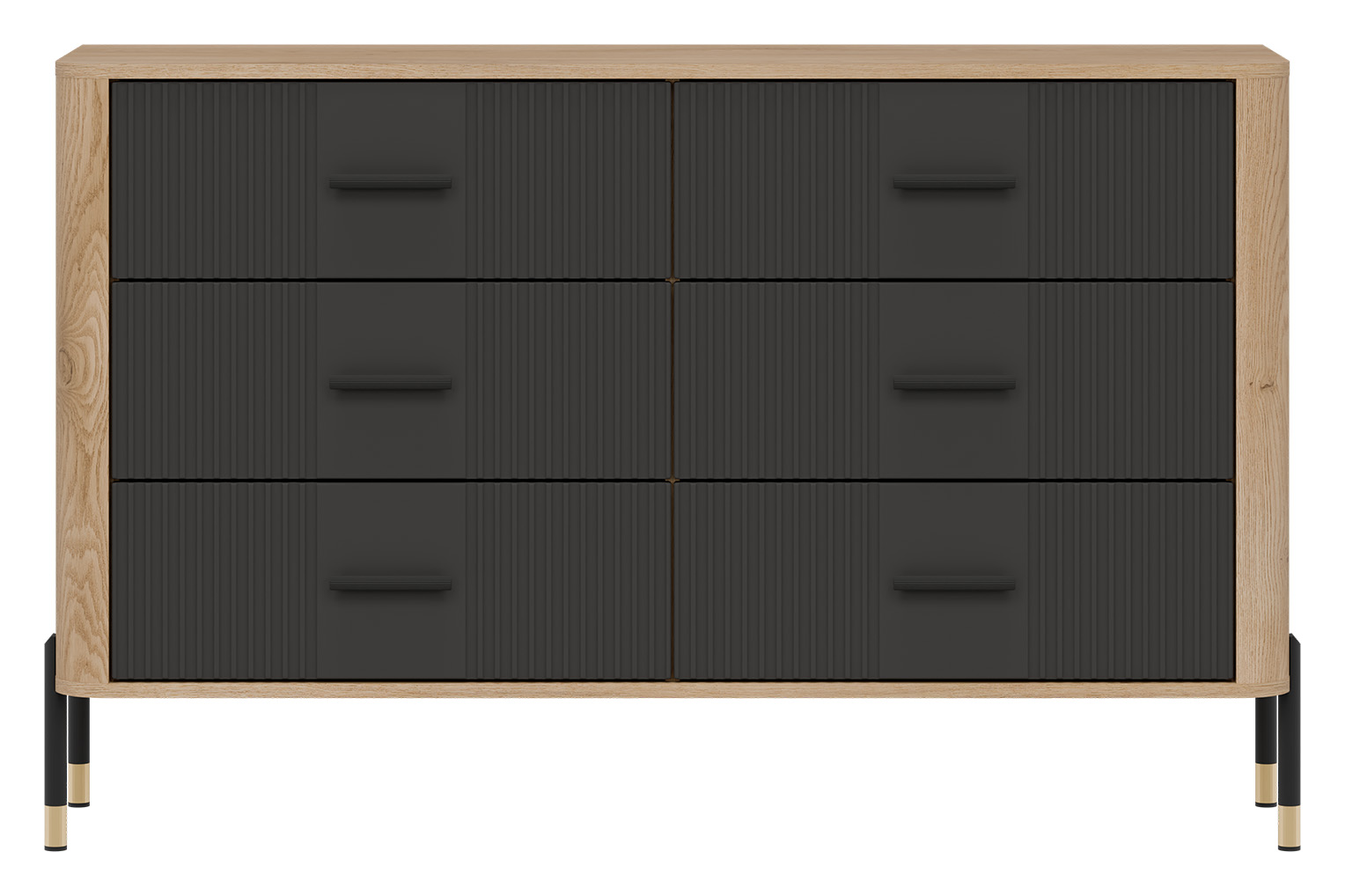 Ryflowane fronty sześciu równomiernie rozmieszczonych szufladach w antracytowym wybarwieniu o matowej strukturze tworzą elegancki rytm wizualny, podkreślony przez czarne uchwyty i delikatne wykończenia. Korpus w kolorze naturalnego dębu cremona torro dodaje meblowi ciepła i kontrastu, tworząc unikalną kompozycję, która pasuje zarówno do wnętrz loftowych, jak i skandynawskich czy nowoczesnych.