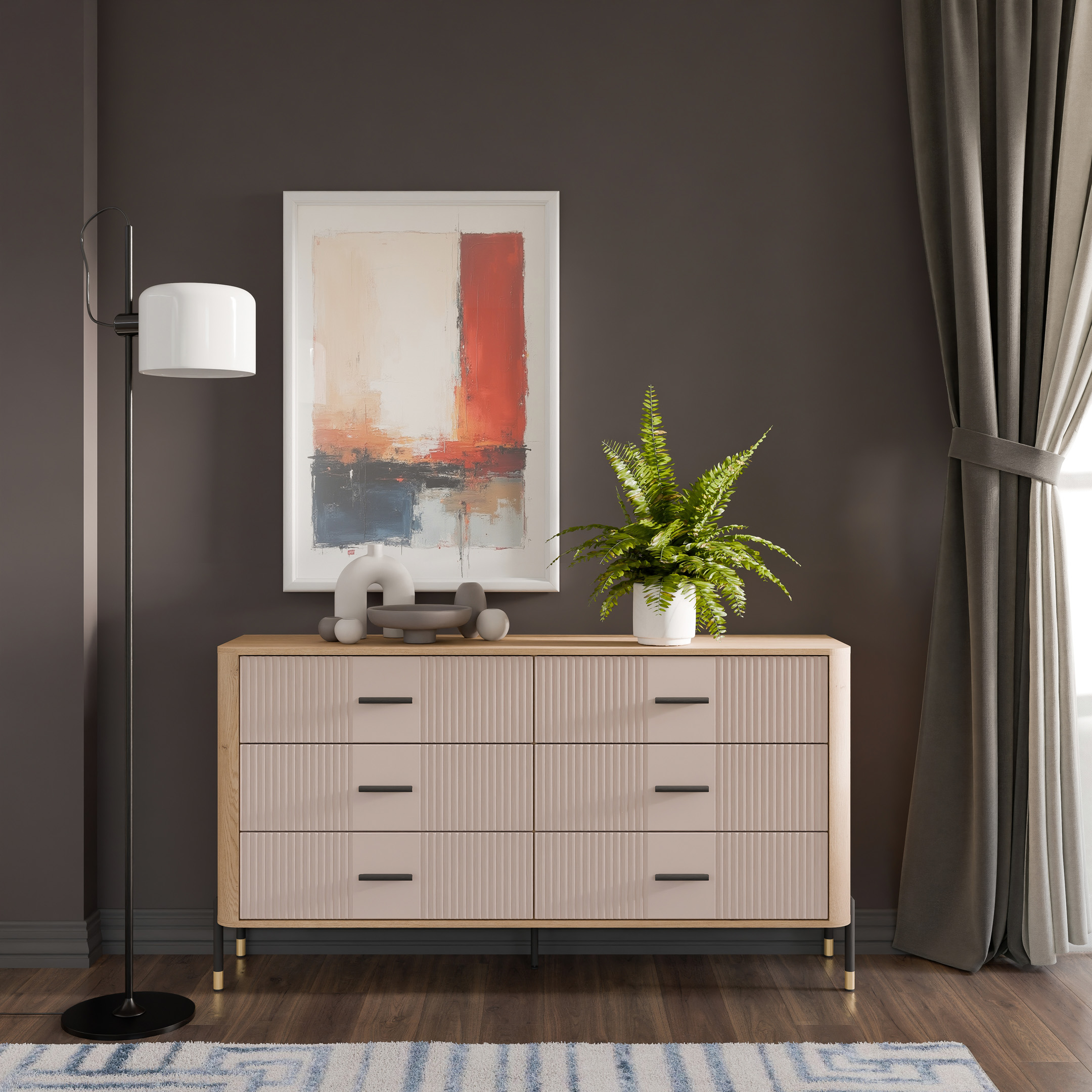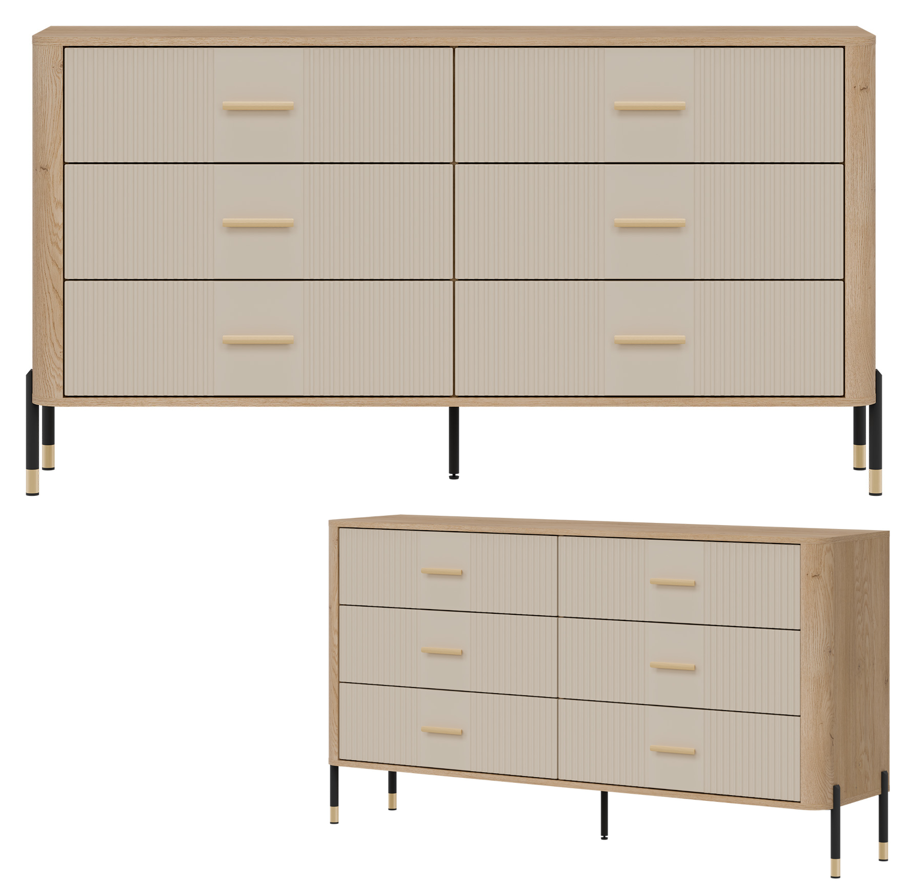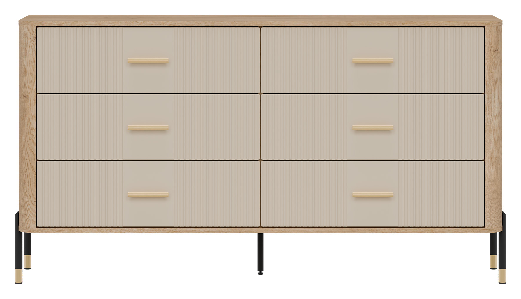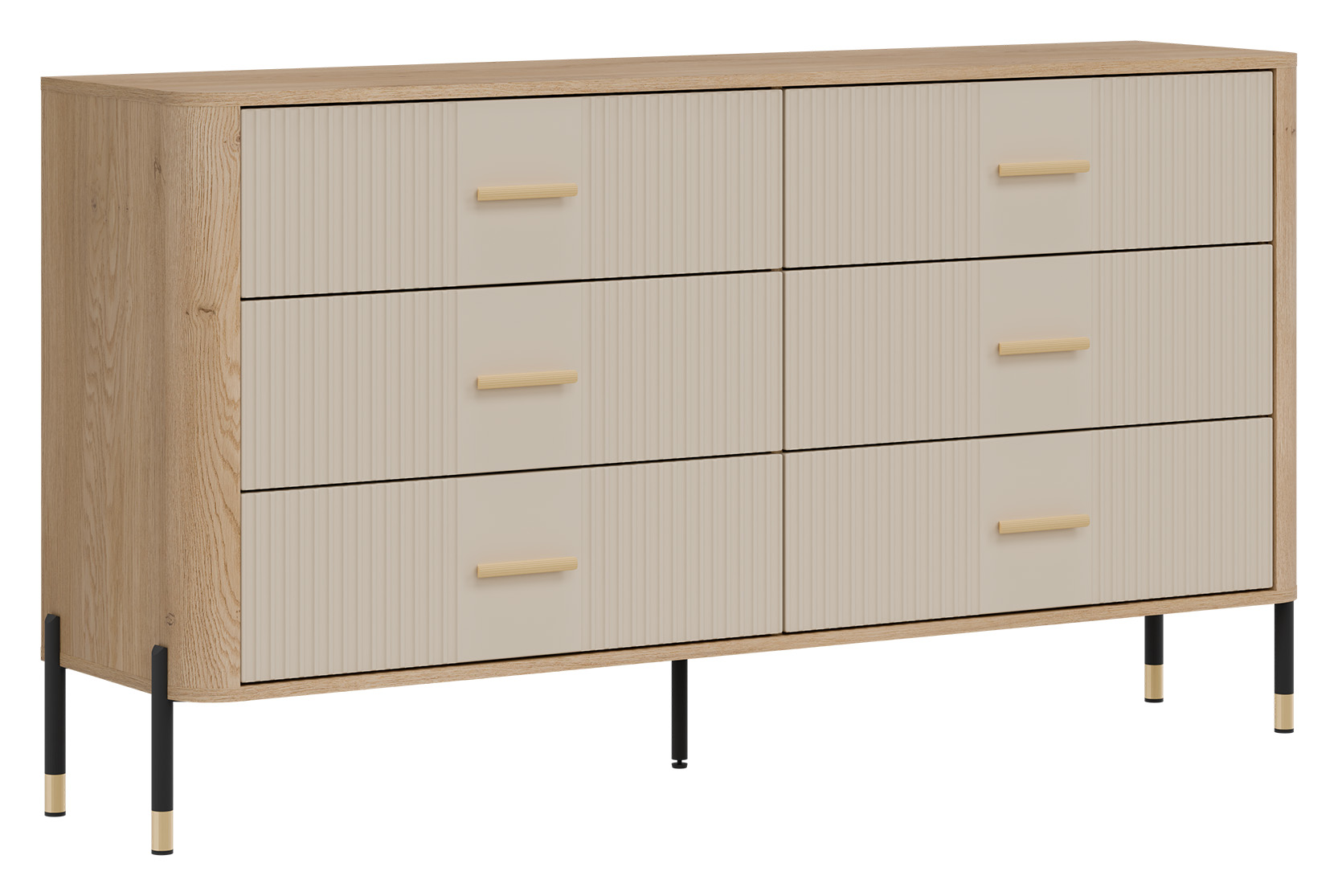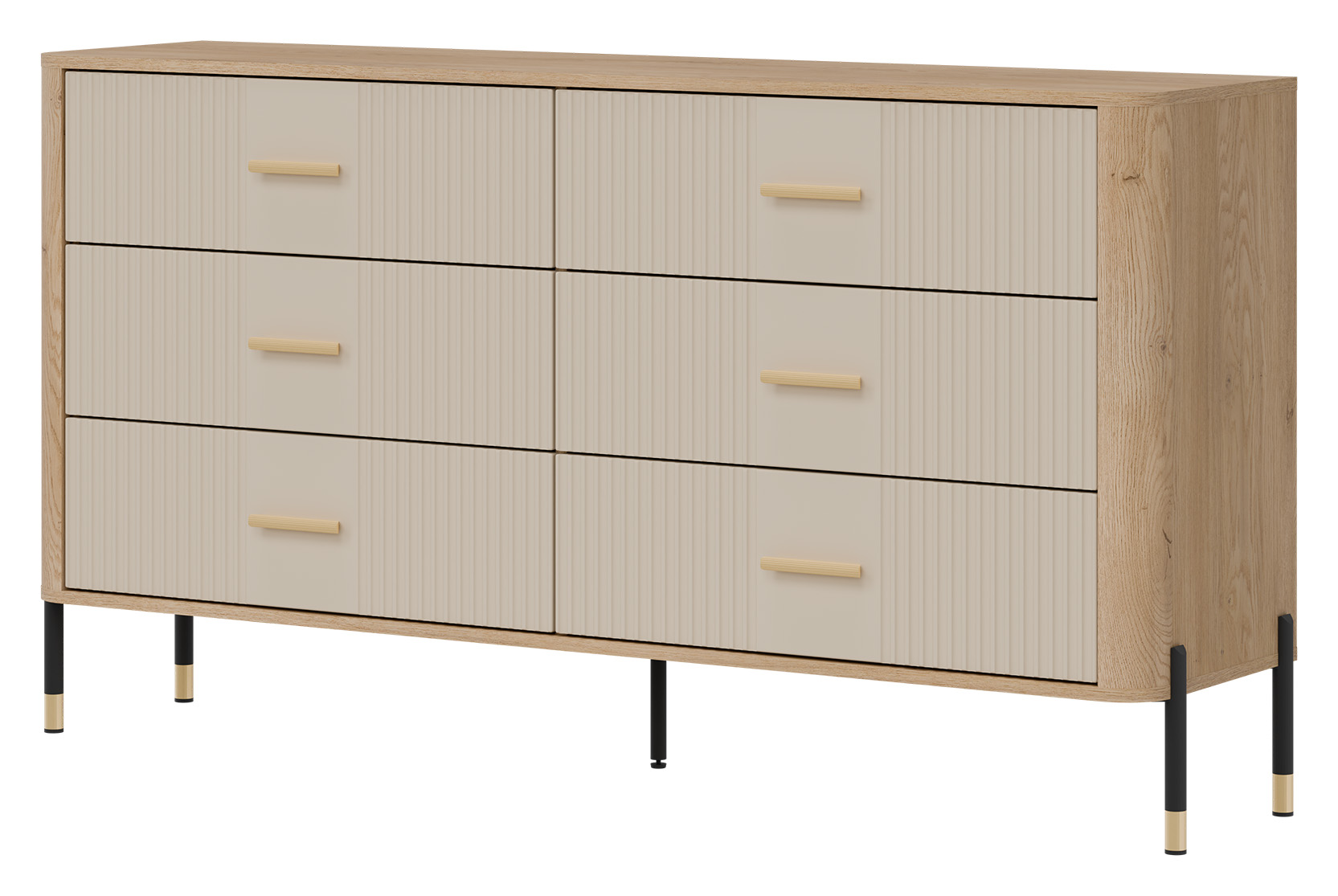 Ryflowane fronty szuflad w kaszmirowym wybarwieniu o matowej strukturze, kontrastują z ciepłym korpusem w kolorze naturalnego dębu cremona torro, tworząc efektowną i jednocześnie stonowaną kompozycję. Smukłe złote uchwyty i metalowe nogi w czarno-złotym wykończeniu dodają całości elegancji oraz wizualnej lekkości. Centralnie umieszczona dodatkowa noga wzmacnia konstrukcję, zapewniając stabilność nawet przy intensywnym użytkowaniu.
