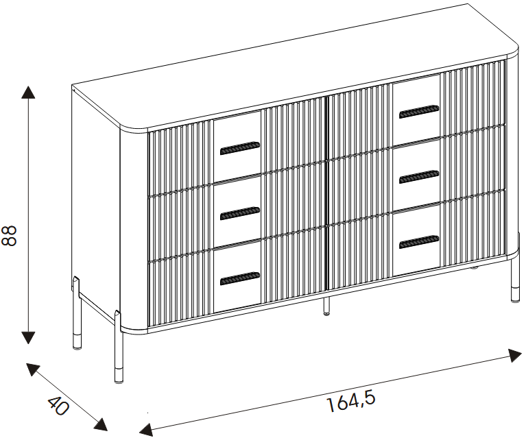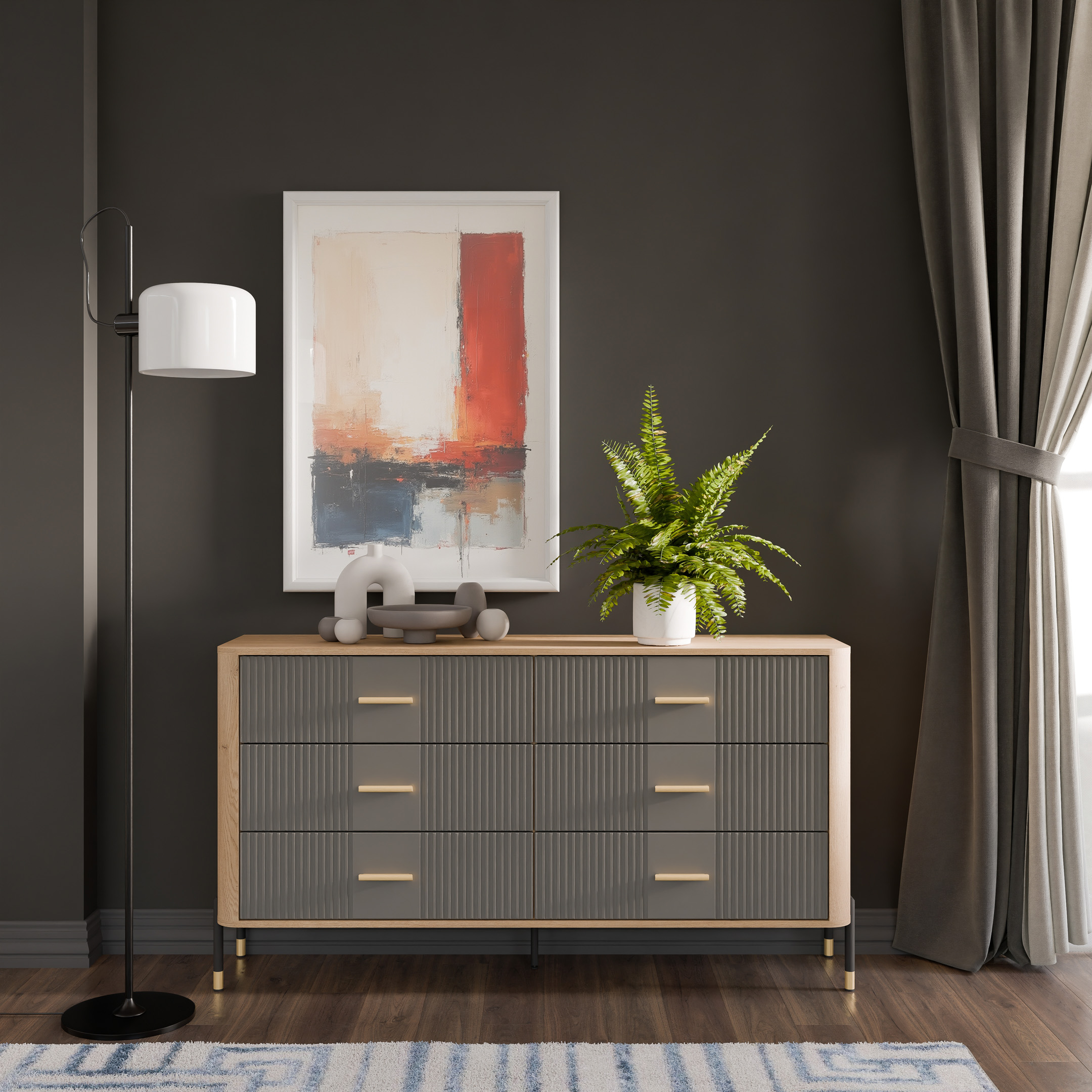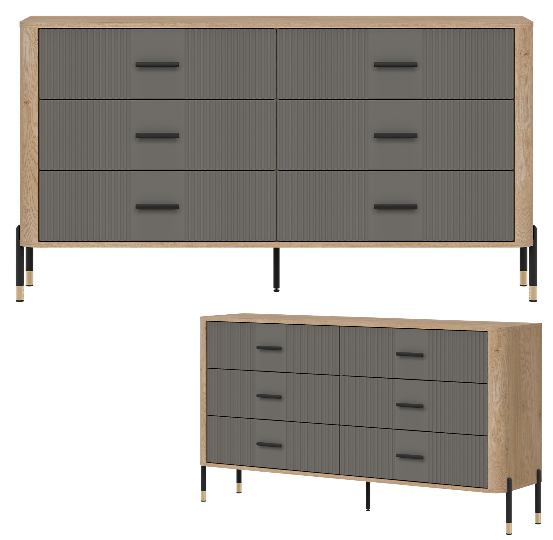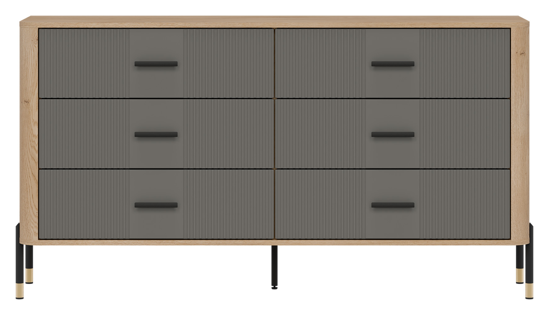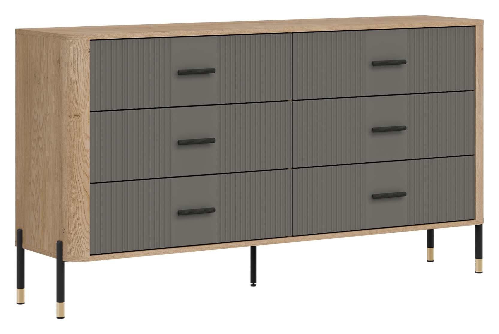 Ryflowane fronty szuflad w szarym wybarwieniu o matowej strukturze, kontrastują z ciepłym korpusem w kolorze naturalnego dębu cremona torro, tworząc efektowną i jednocześnie stonowaną kompozycję. Smukłe czarne uchwyty i metalowe nogi w czarno-złotym wykończeniu dodają całości elegancji oraz wizualnej lekkości. Centralnie umieszczona dodatkowa noga wzmacnia konstrukcję, zapewniając stabilność nawet przy intensywnym użytkowaniu.