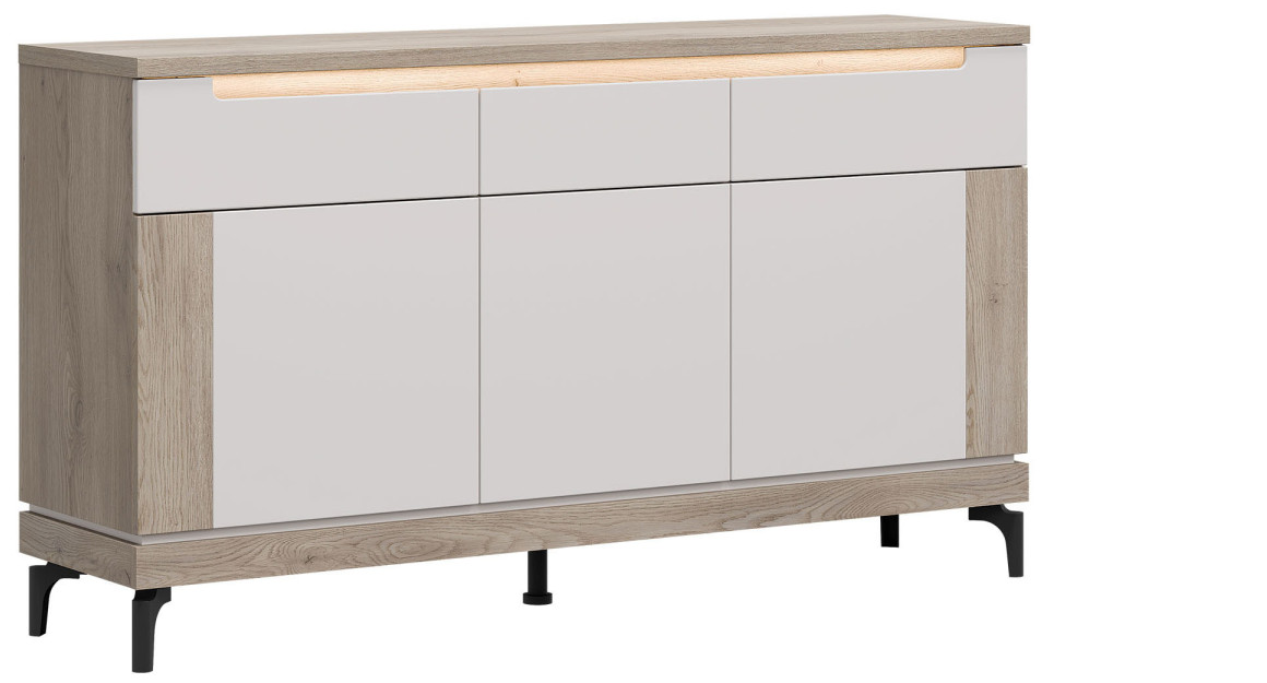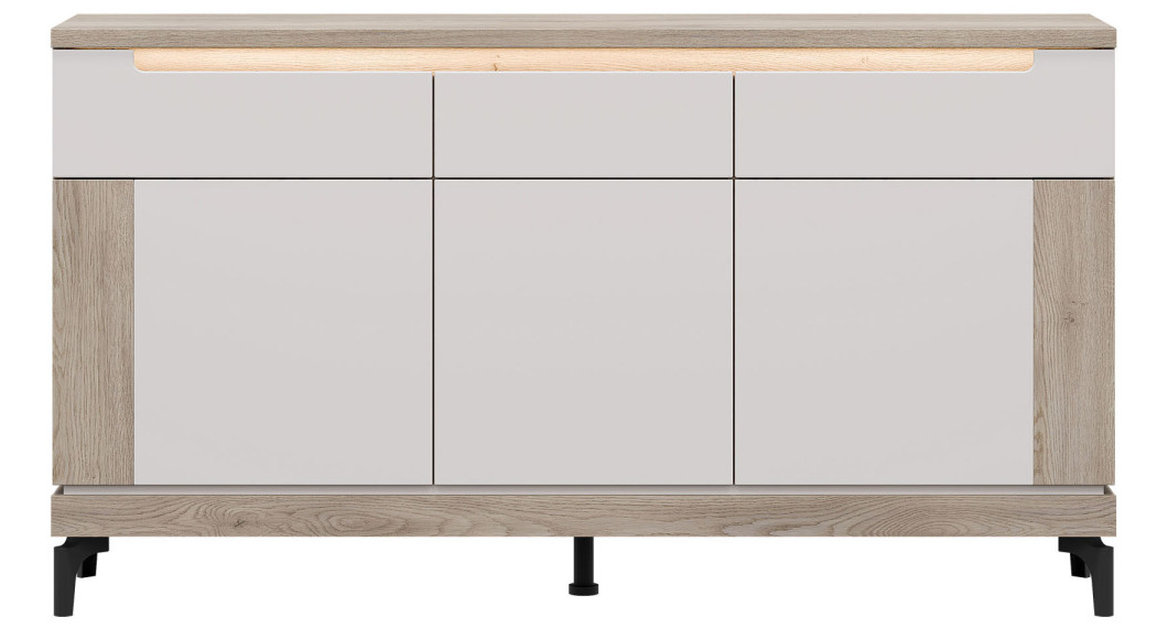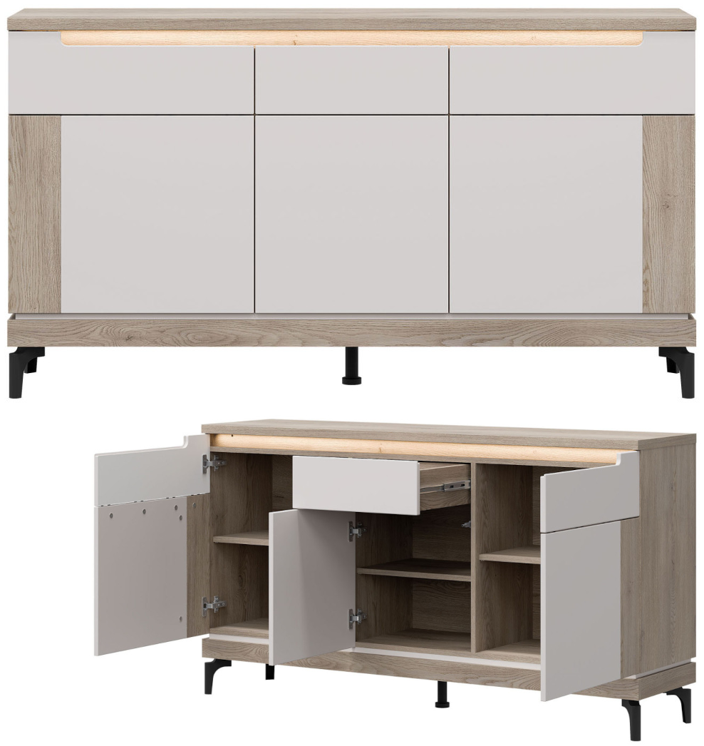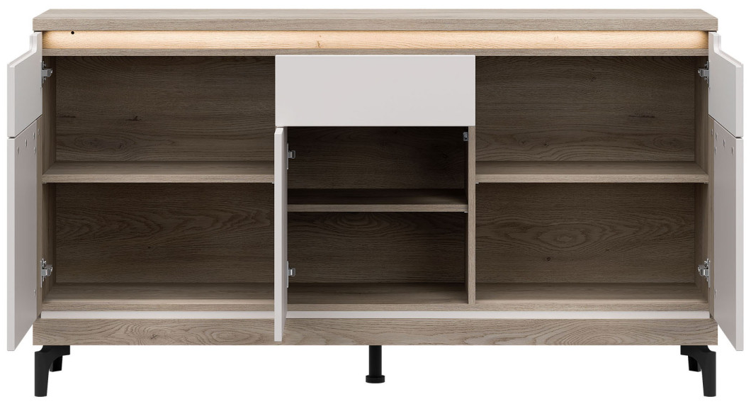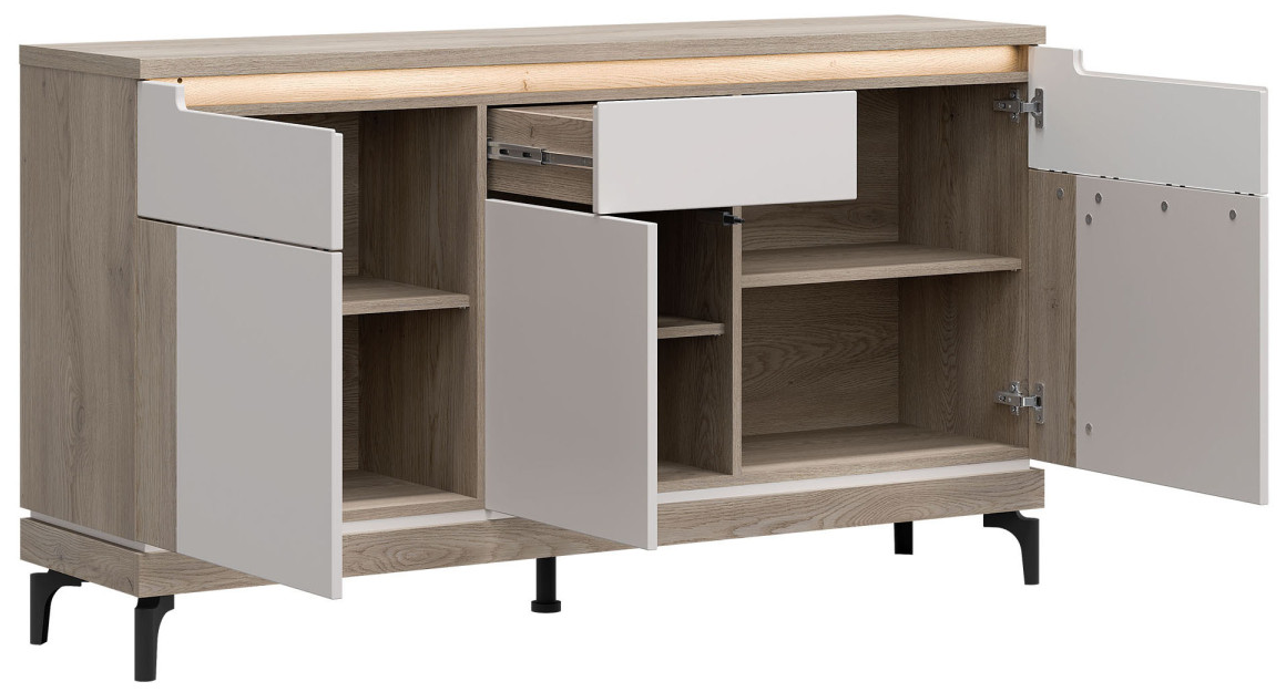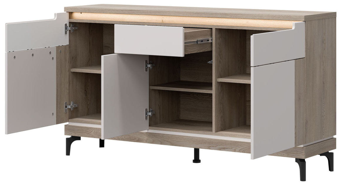 Aston AN03 oferuje podstawowe wyposażenie umożliwiające w prosty sposób uporządkować ubrania, akcesoria, dokumenty, czy inne niezbędne przedmioty. Komoda wyposażona jest w jedną szufladę z prowadnicami kulkowymi GTV z pełnym wysuwem, a także w troje drzwiczek, za którymi znajdują się sześć wnęk.