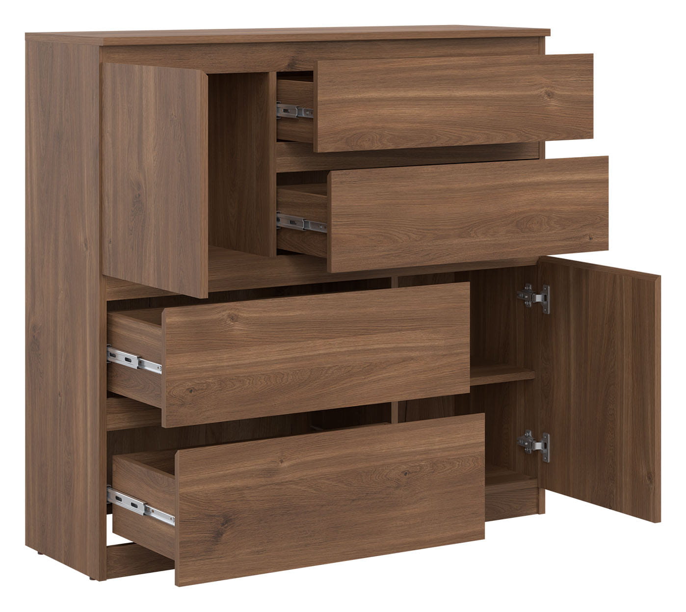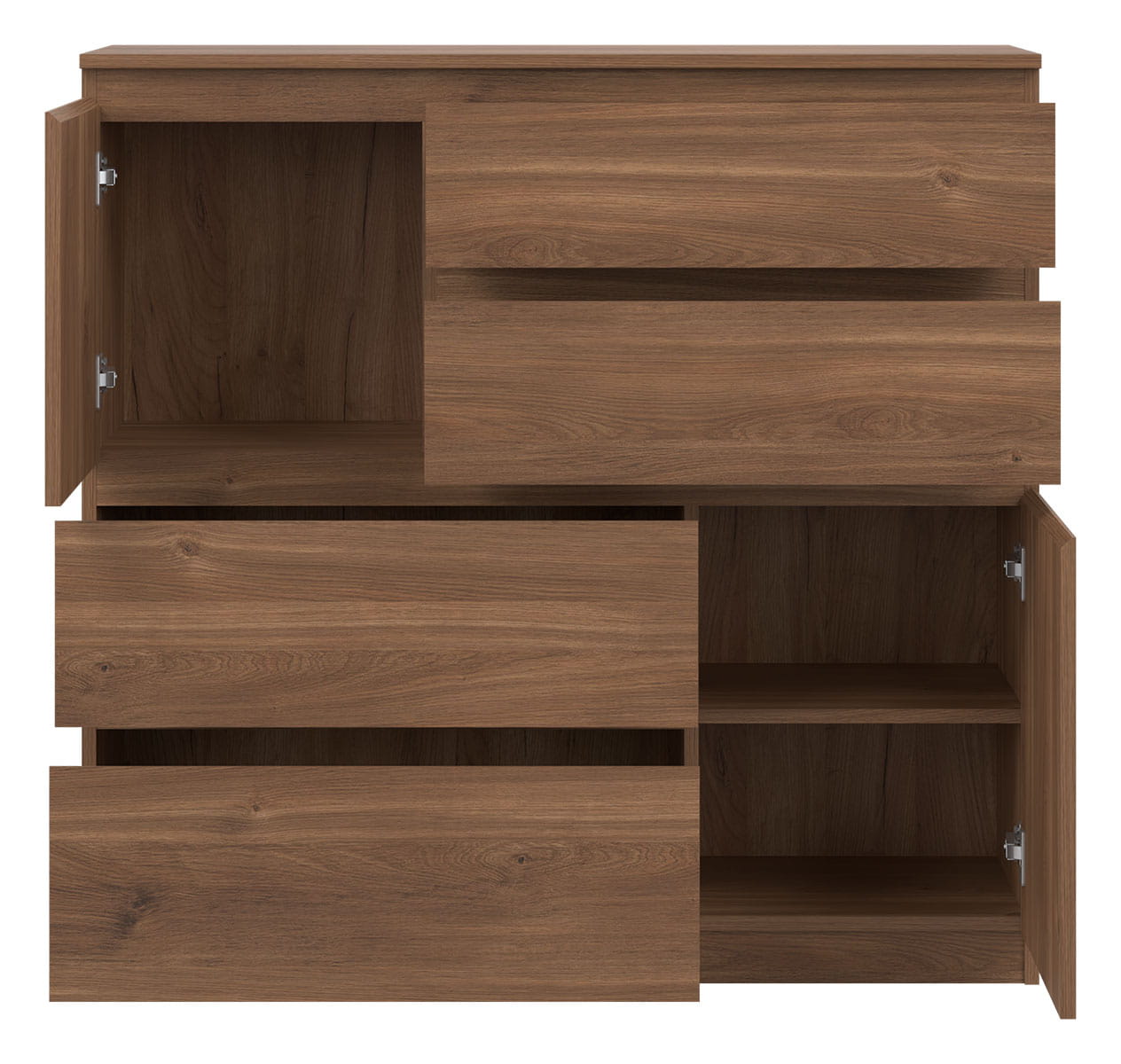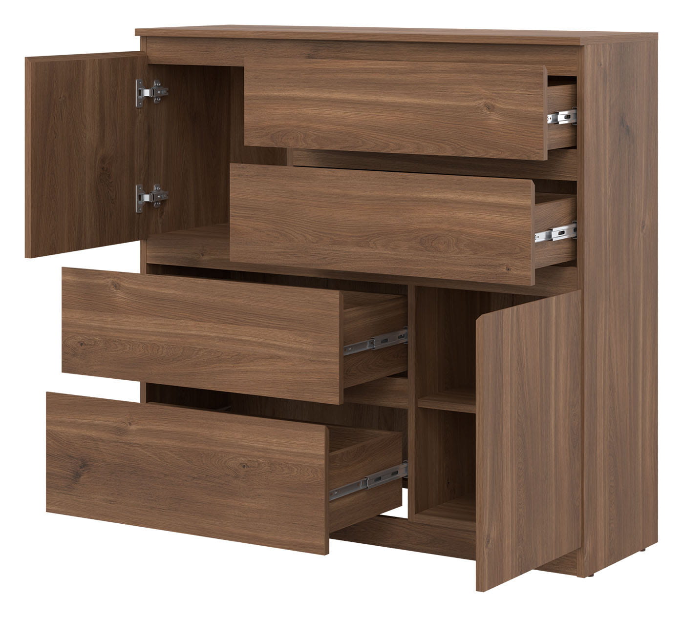 Mebel wyposażono w cztery szuflady wysuwane na solidnych prowadnicach kulkowych gwarantujących długotrwałą i bezawaryjną pracę oraz trzy wnęki zamknięte za dwoma drzwiczkami.