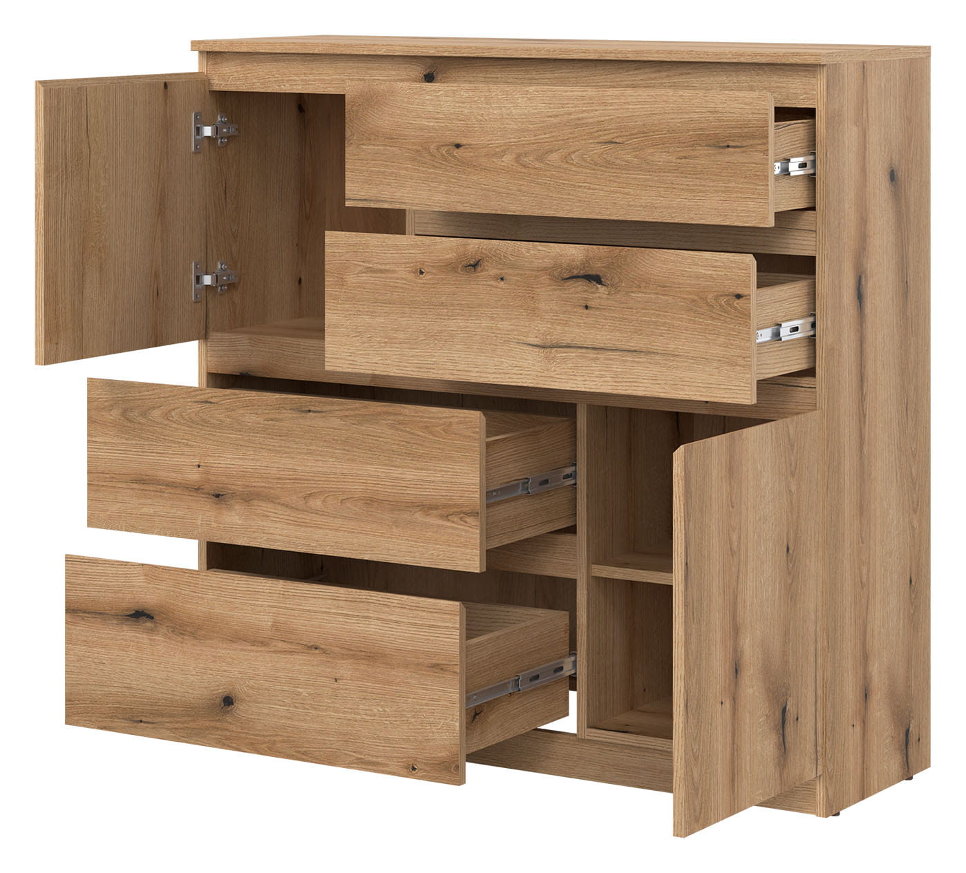 Mebel wyposażono w cztery szuflady wysuwane na solidnych prowadnicach kulkowych gwarantujących długotrwałą i bezawaryjną pracę oraz trzy wnęki zamknięte za dwoma drzwiczkami.
