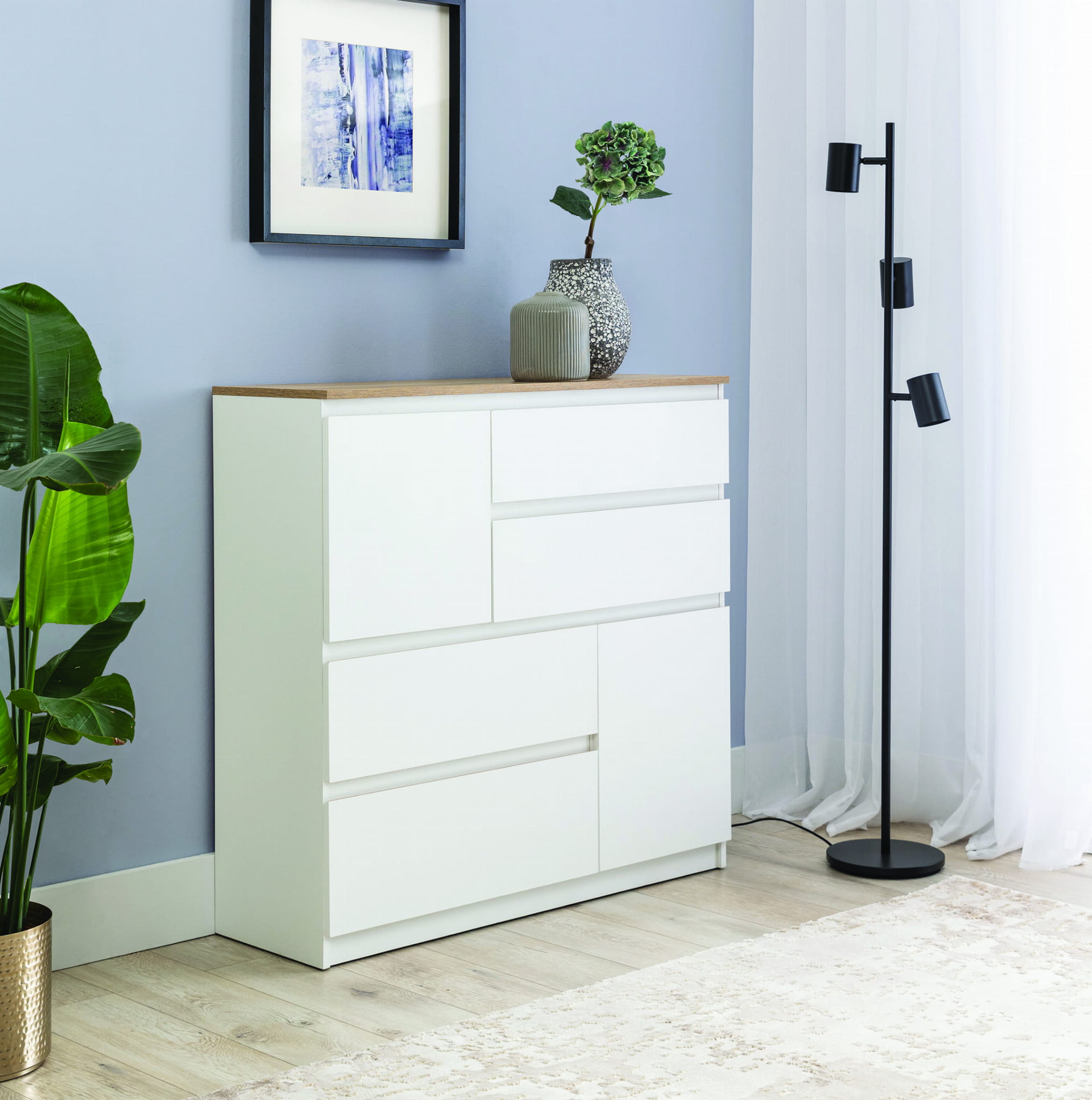 Komoda REMI RM06 znajdzie zastosowanie zarówno w salonie, gabinecie, pokoju dziennym, jak i młodzieżowym. Praktyczne wnętrze pomoże w posegregowaniu potrzebnych rzeczy codziennego użytku. Powierzchnia blatu posłuży do ekspozycji rodzinnej galerii zdjęć lub stylowych dodatków dekoracyjnych.