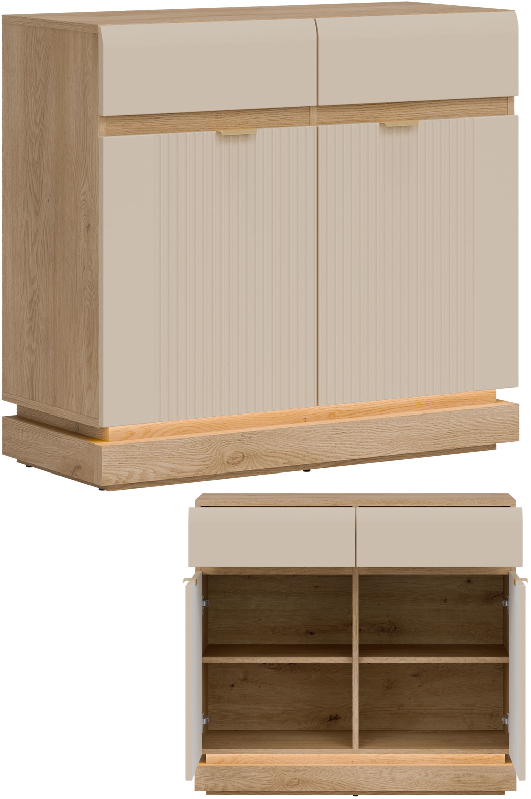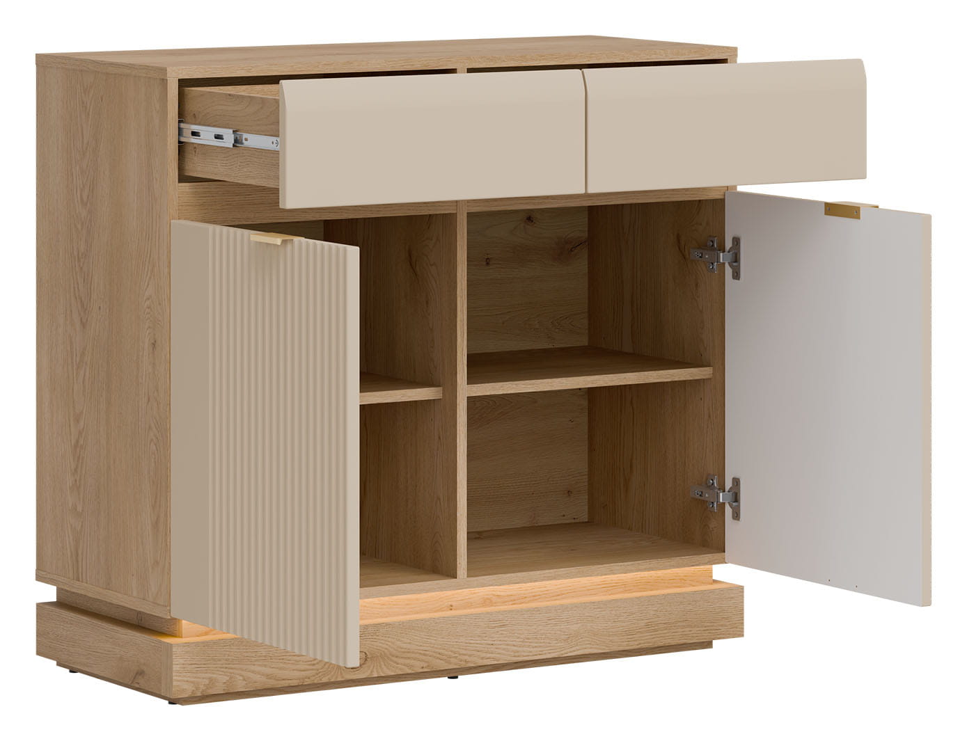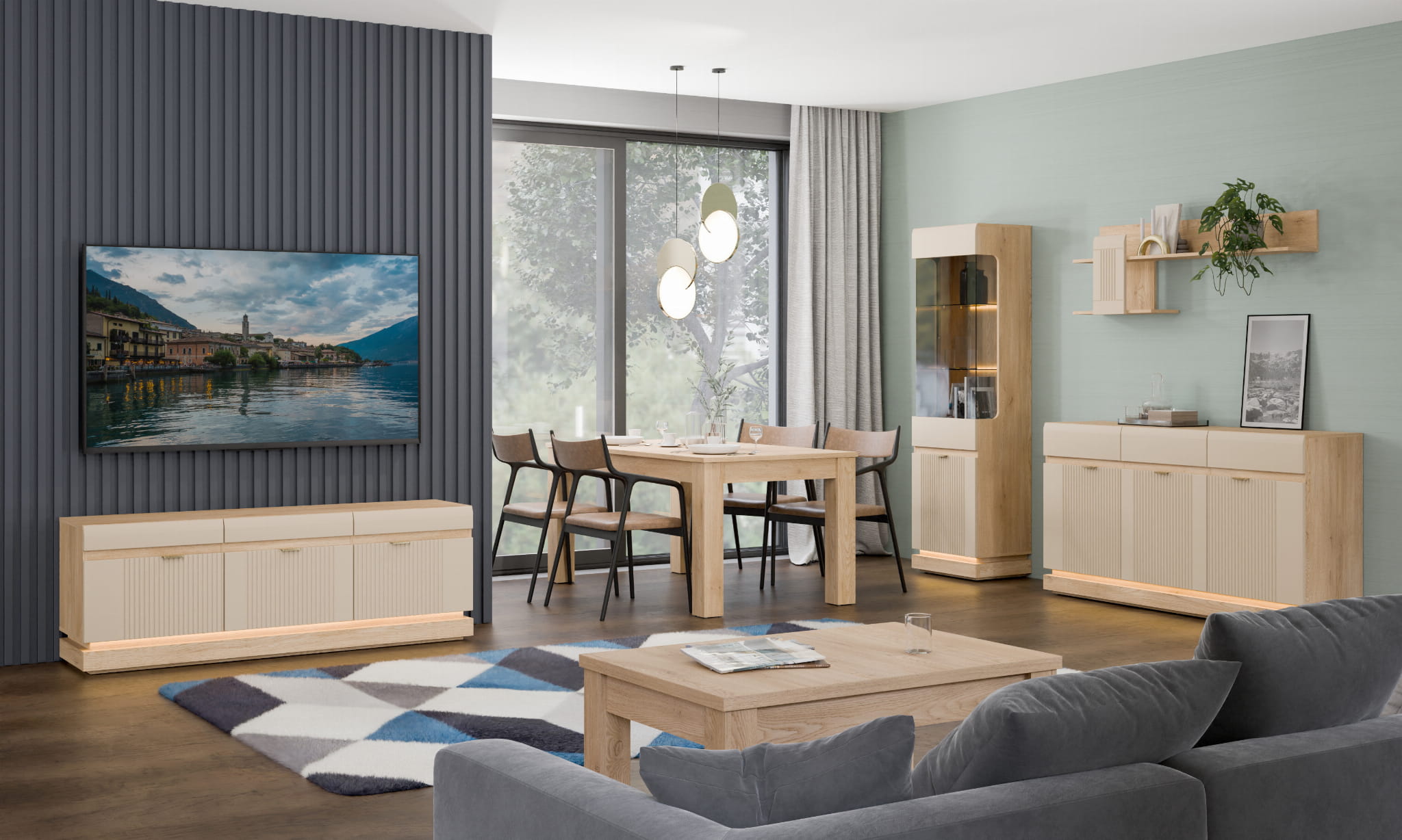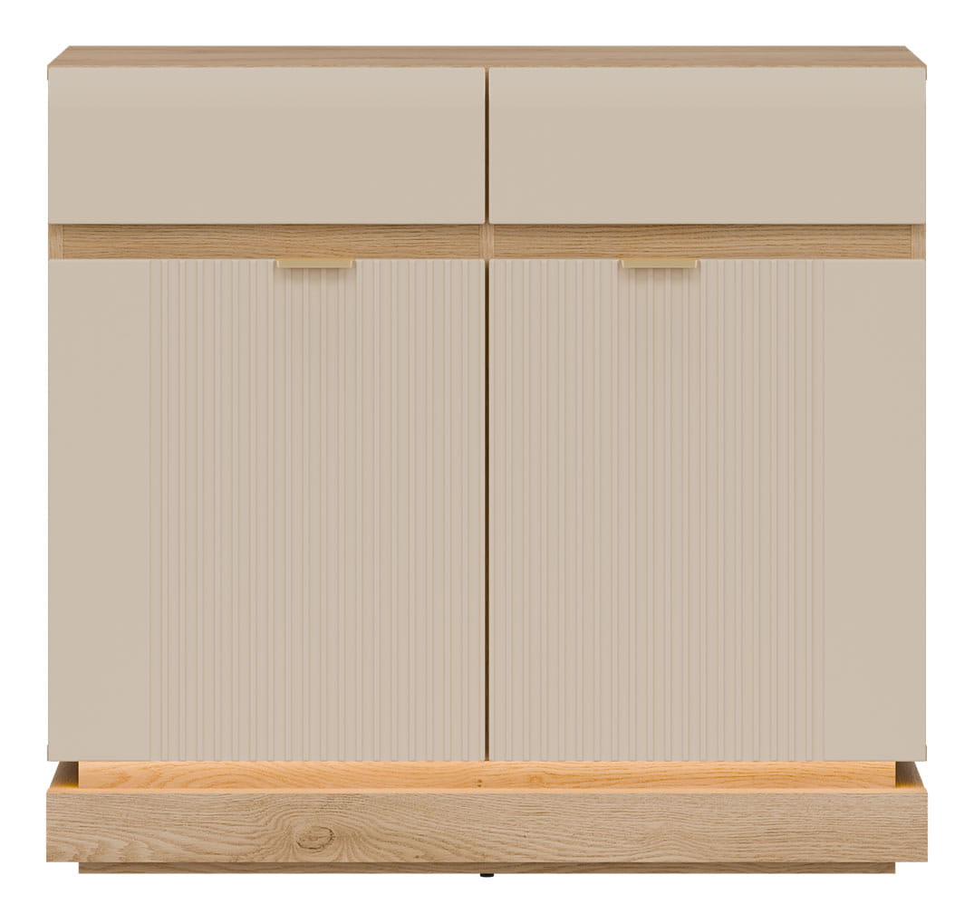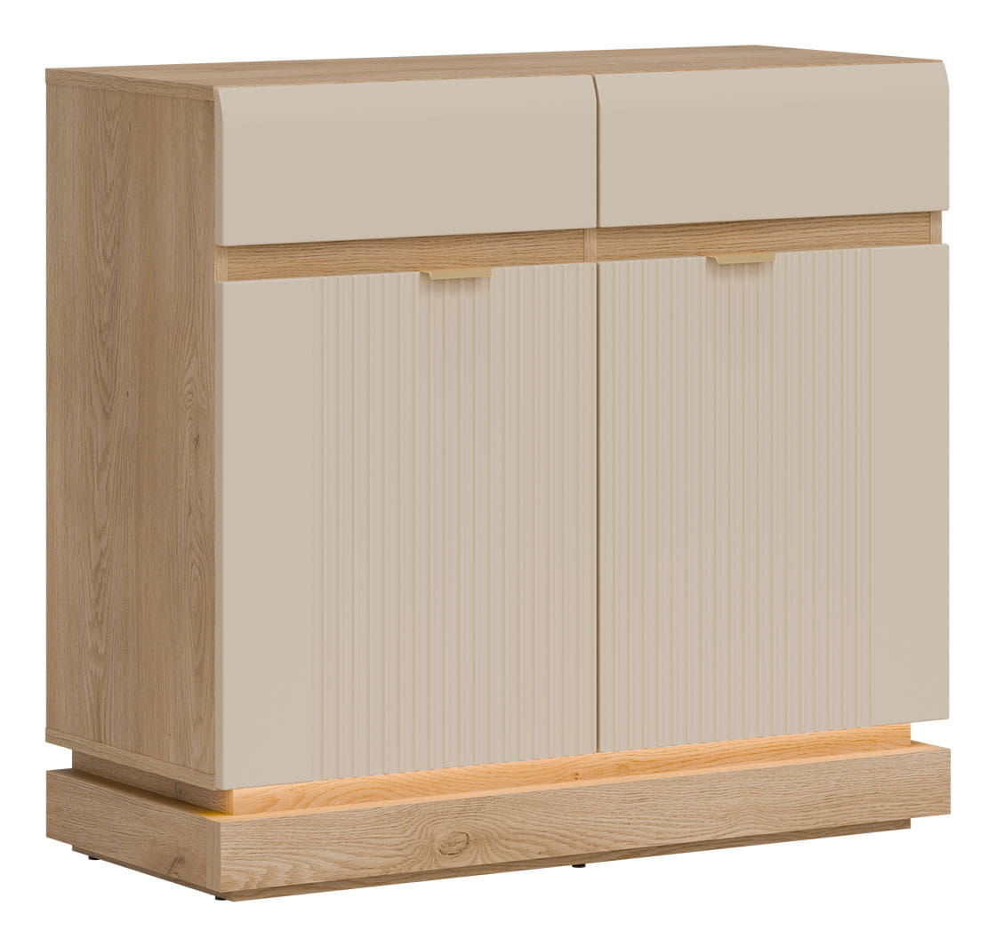 Model ML02 wyróżnia się ponadczasowym designem, łączącym eleganckie fronty w kaszmirowym kolorze o matowym wykończeniu z korpusem wykonanym w naturalnym i ciepłym dekorze dąb cremona torro. Uwagę przyciągnie pionowe frezowanie zdobiące drzwiczki, które nadaje meblowi subtelnej dynamiki i wyrafinowanego charakteru. Minimalistyczne uchwyty o złotym wybarwieniu stanowią ciekawy akcent, a opcjonalne oświetlenie LED umieszczone w części dolnej wprowadza nastrojowy klimat i podkreśla lekkość formy. Takie połączenia tworzy spójną i stylową kompozycję, która doskonale odnajdzie się zarówno w nowoczesnych, jak i bardziej klasycznych wnętrzach.