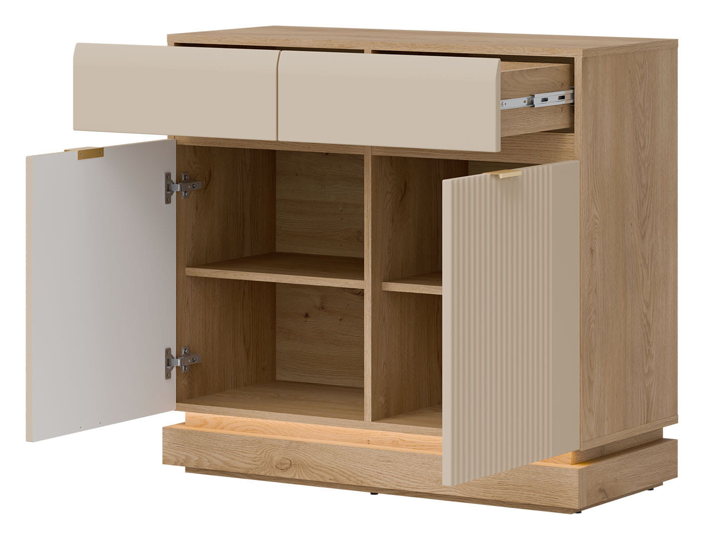 Korpus został starannie wykonany z wysokogatunkowej płyty wiórowej pokrytej laminatem w dekorze dąb cremona torro, natomiast fronty MDF z dekoracyjnymi ryflowaniami wykończono w matowym kaszmirze. Użyte materiały są solidne i odporne na czynniki zewnętrzne, a także łatwe w utrzymaniu czystości, co gwarantuje bezpieczeństwo podczas codziennego użytkowania mebla i jego trwałość na lata.