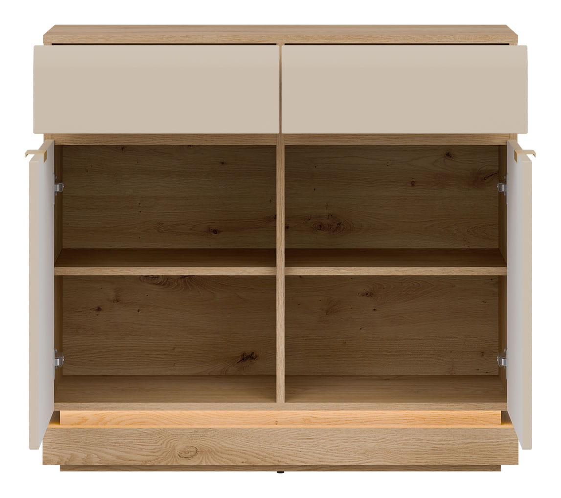 Mniejsza komoda ML02 pochodząca z kolekcji Milton to propozycja łącząca funkcjonalność, wygodę i estetykę na najwyższym poziomie, która znakomicie sprawdzi się w nowoczesnej i minimalistycznej aranżacji salonu, jadalni, pokoju dziennego, przedpokoju, sypialni, a nawet gabinetu. Wnętrze mebla skrywa praktyczne półki oraz pojemne szuflady – oferując miejsce do przechowywania tekstyliów, zastawy stołowej czy drobiazgów domowego użytku.