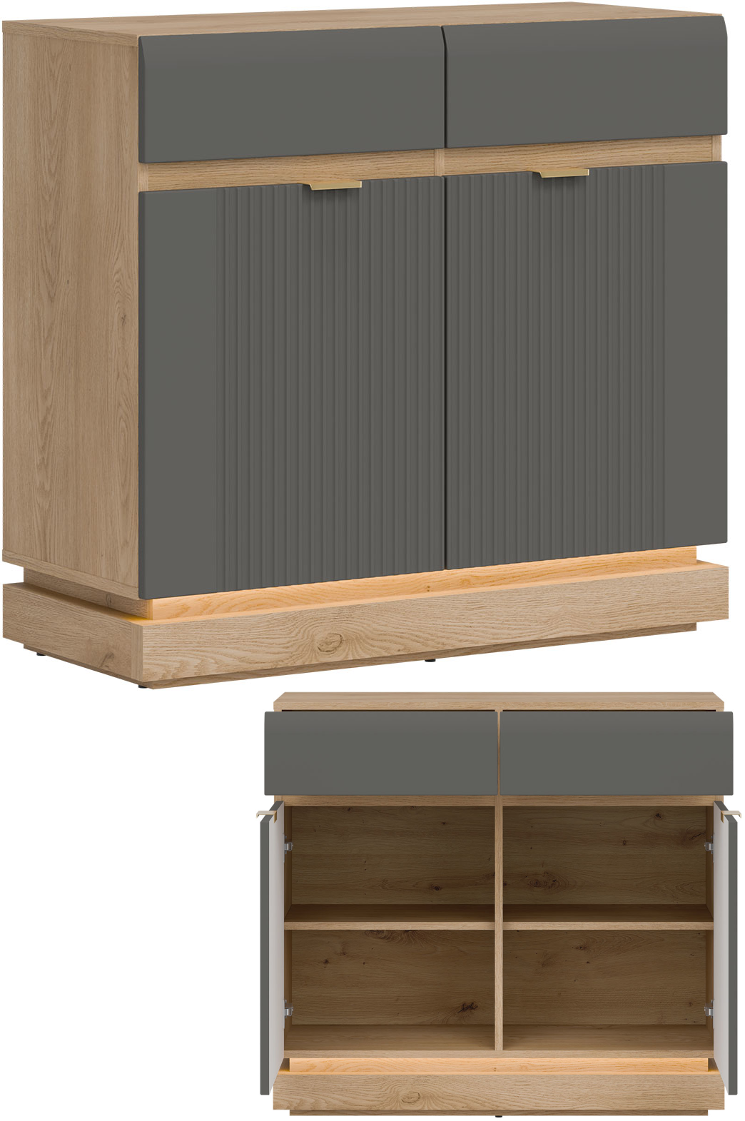 Model ML02 wyróżnia się ponadczasowym designem, łączącym eleganckie fronty w szarym kolorze o matowym wykończeniu z korpusem wykonanym w naturalnym i ciepłym dekorze dąb cremona torro. Uwagę przyciągnie pionowe frezowanie zdobiące drzwiczki, które nadaje meblowi subtelnej dynamiki i wyrafinowanego charakteru. Minimalistyczne uchwyty o złotym wybarwieniu stanowią ciekawy akcent, a opcjonalne oświetlenie LED umieszczone w części dolnej wprowadza nastrojowy klimat i podkreśla lekkość formy. Takie połączenia tworzy spójną i stylową kompozycję, która doskonale odnajdzie się zarówno w nowoczesnych, jak i bardziej klasycznych wnętrzach.
