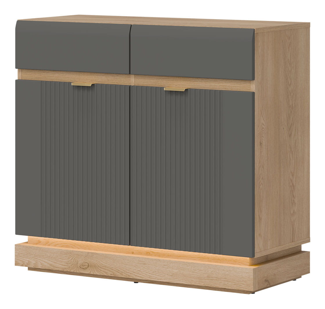 Korpus został starannie wykonany z wysokogatunkowej płyty wiórowej pokrytej laminatem w dekorze dąb cremona torro, natomiast fronty MDF z dekoracyjnymi ryflowaniami wykończono w matowej szarości. Użyte materiały są solidne i odporne na czynniki zewnętrzne, a także łatwe w utrzymaniu czystości, co gwarantuje bezpieczeństwo podczas codziennego użytkowania mebla i jego trwałość na lata.