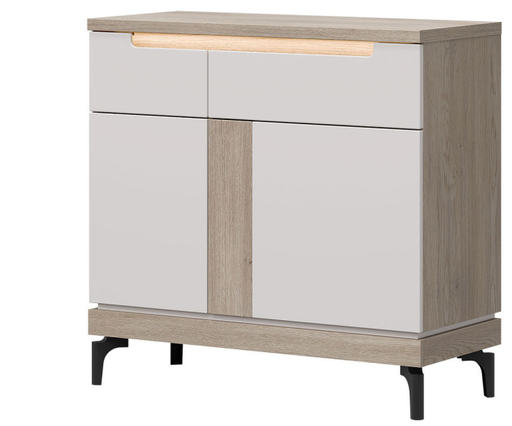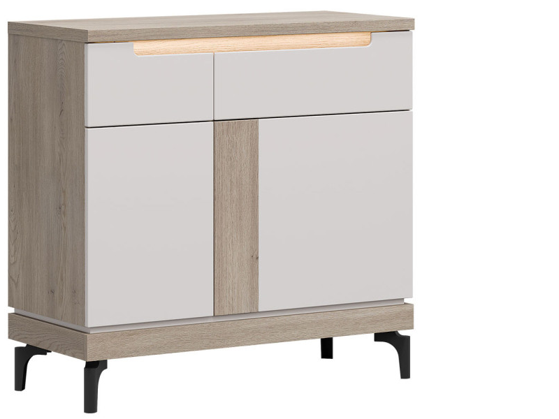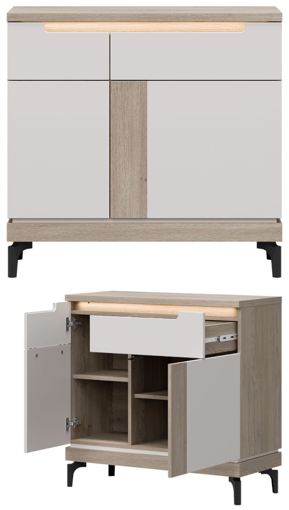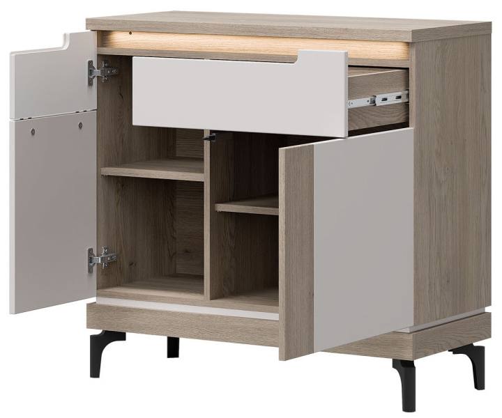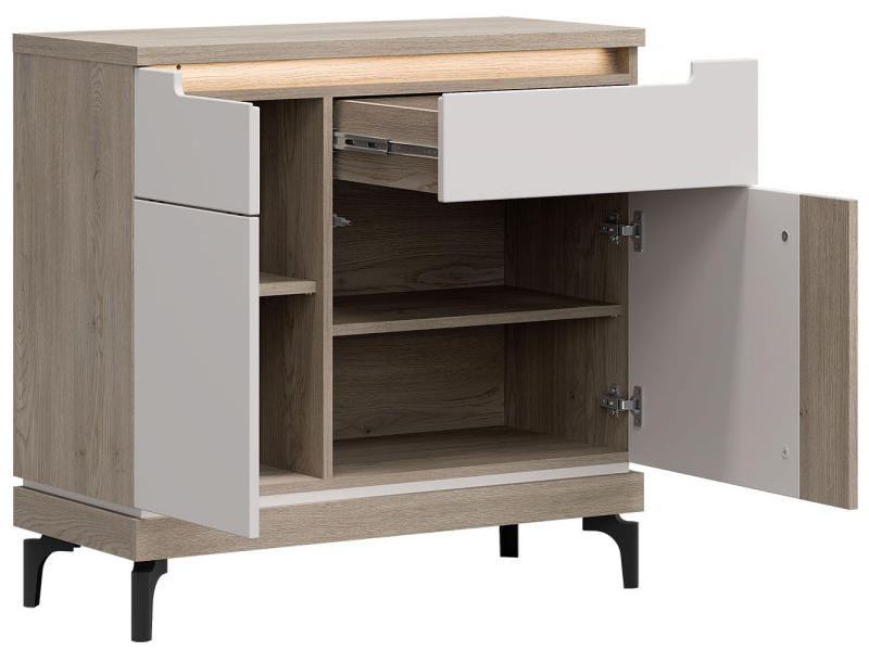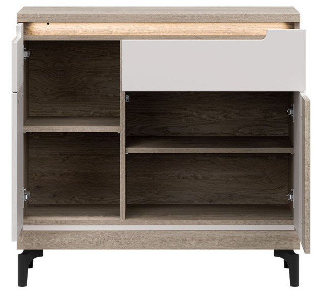 Aston AN02 oferuje podstawowe wyposażenie umożliwiające w prosty sposób uporządkować ubrania, akcesoria, dokumenty, czy inne niezbędne przedmioty. Komoda wyposażona jest w jedną szufladę z prowadnicami kulkowymi GTV z pełnym wysuwem, a także w dwoje drzwiczek, za którymi znajdują się cztery wnęki.