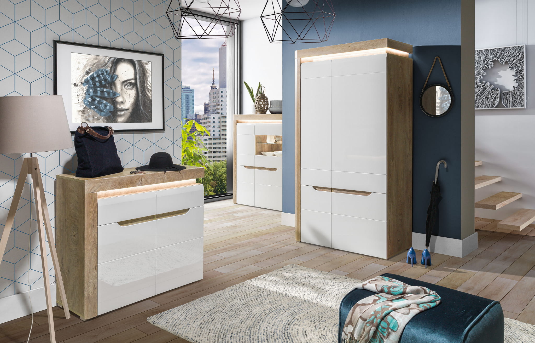 IRMA IM3 wyróżnia się nowoczesnym designem oraz modną kolorystyką efektownie łączącą wybarwienie matowej bieli z wykończonym na biały połysk frontem. Uwagę skupia na sobie wyrazista wstawka podkreślająca elegancki styl i masywność formy. Bezpośrednio nad drzwiami umieszczona jest ledowa listwa oświetleniowa, która nie tylko nada wnętrzu luksusowego charakteru, ale również wprowadzi niepowtarzalny klimat.