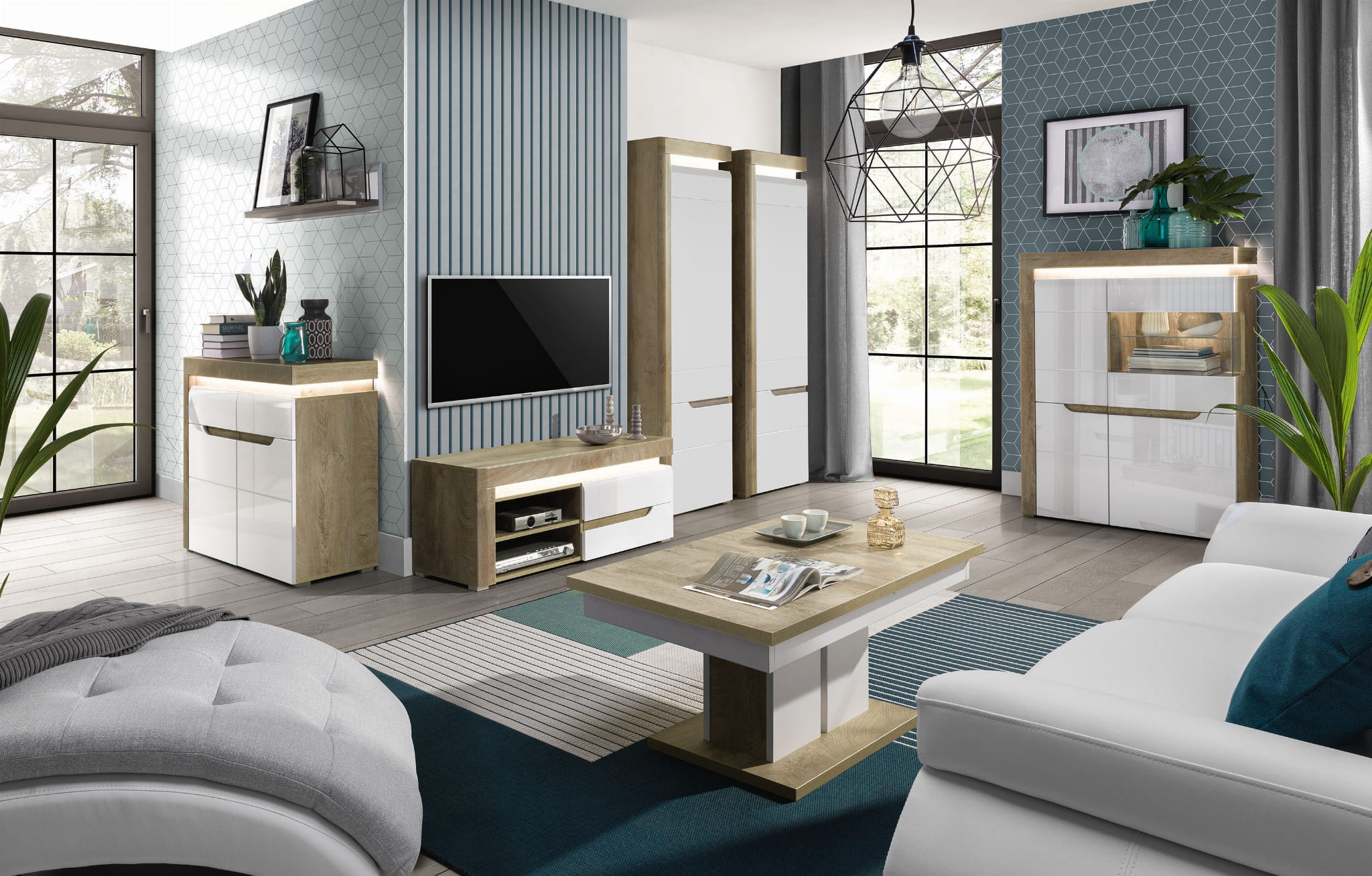 IRMA IM3 wyróżnia się nowoczesnym designem oraz modną kolorystyką efektownie łączącą wybarwienie dębu z wykończonym na biały połysk frontem. Uwagę skupia na sobie wyrazista wstawka podkreślająca elegancki styl i masywność formy. Bezpośrednio nad drzwiami umieszczona jest ledowa listwa oświetleniowa, która nie tylko nada wnętrzu luksusowego charakteru, ale również wprowadzi niepowtarzalny klimat.