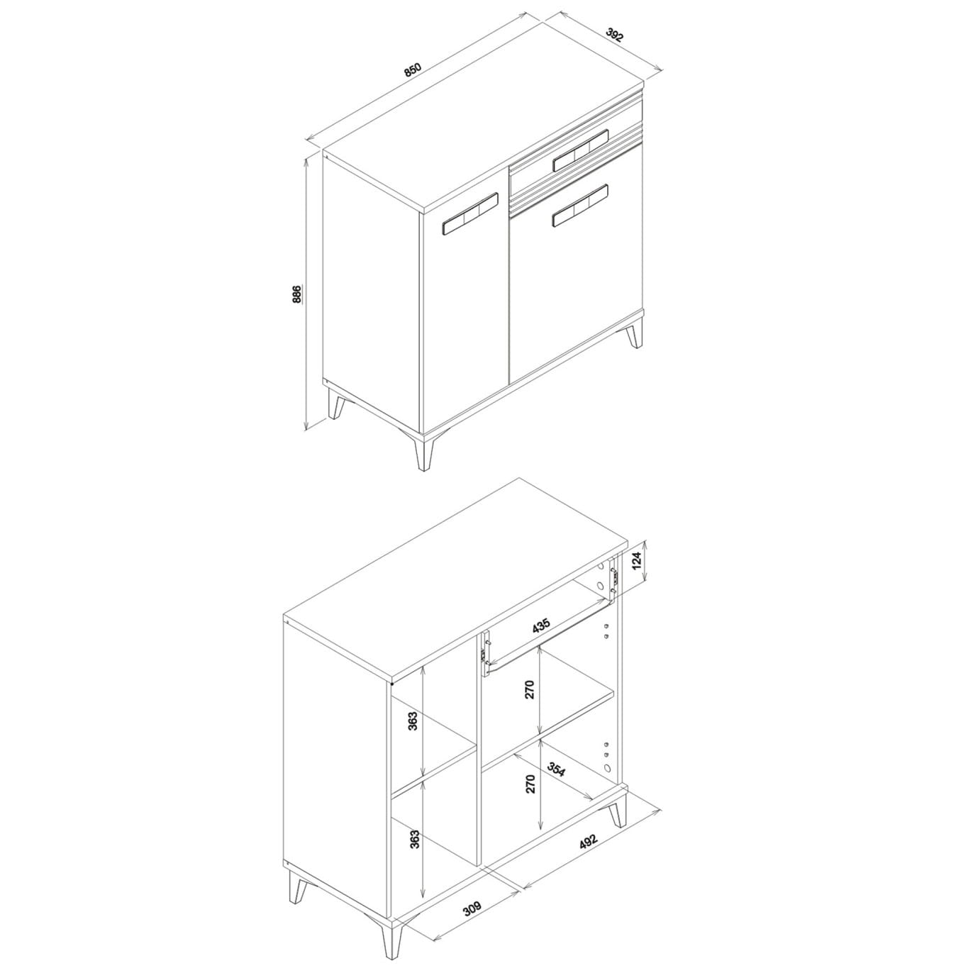 Mebel składa się z szuflady wyposażonej w wysokogatunkowe prowadnice kulkowe GTV z pełnym wysuwem oraz dwóch drzwi, za którymi znajdują się cztery wnęki.