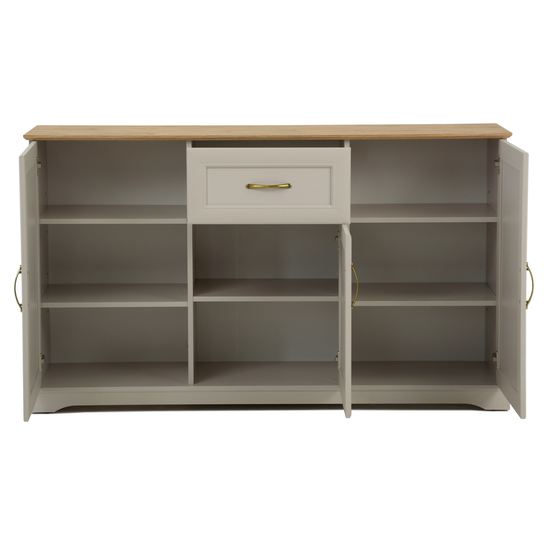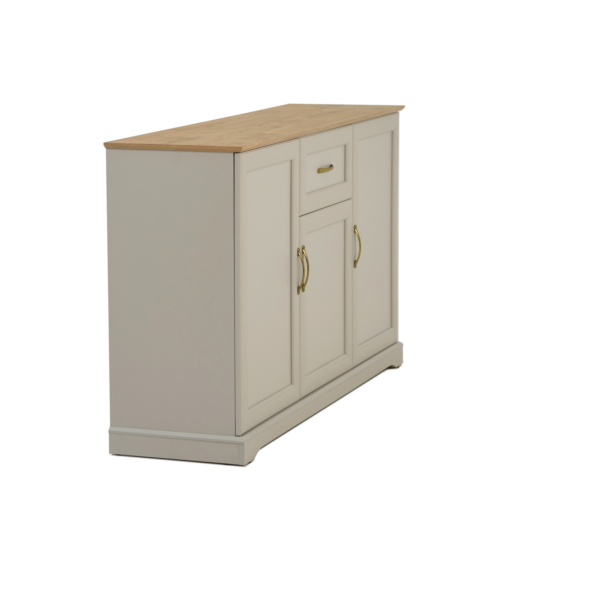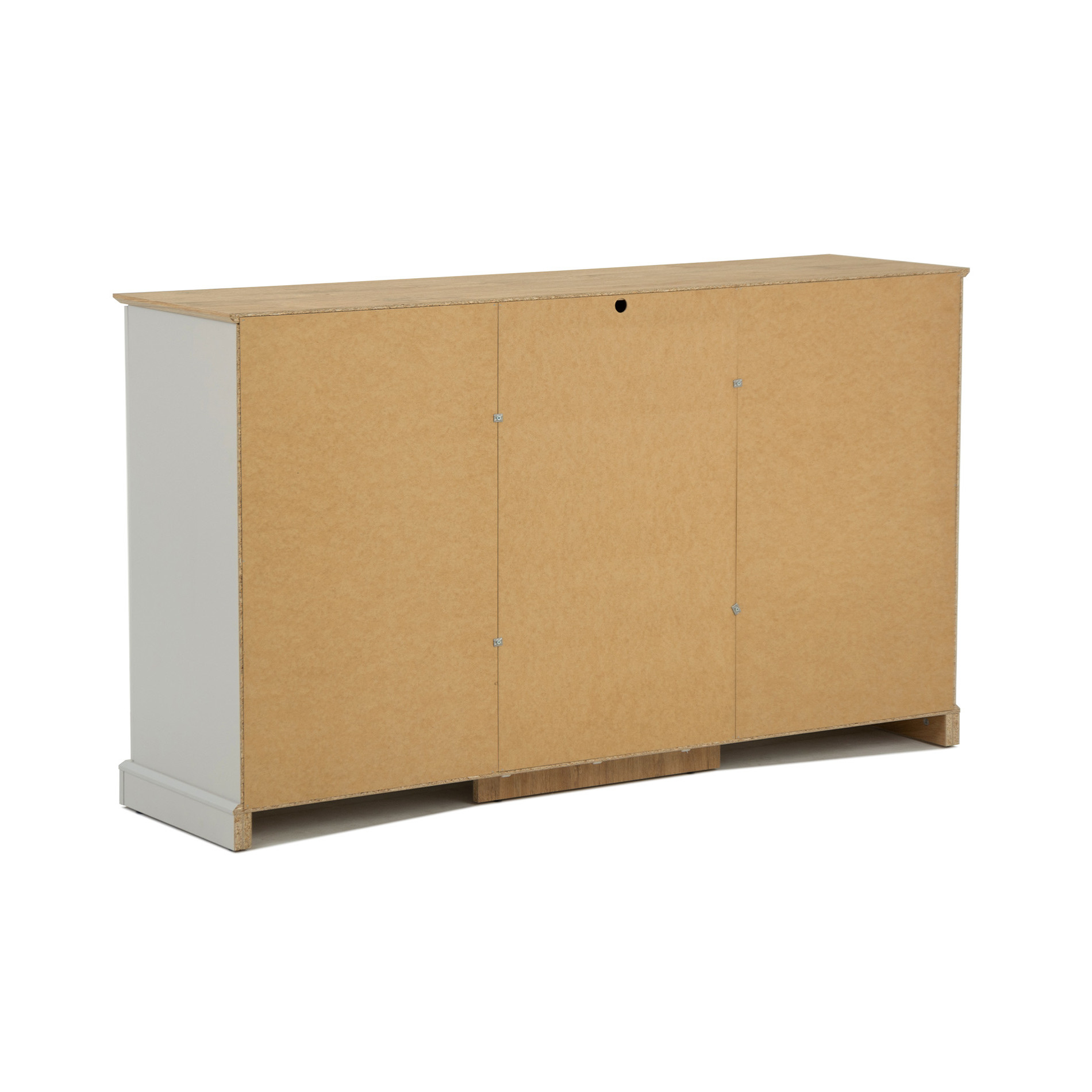 Trzydrzwiowy mebel wyposażony jest w szufladę z pełnym wysuwem oraz osiem zamykanych wnęk. Otwierany jest za pomocą wygodnych metalowych uchwytów.