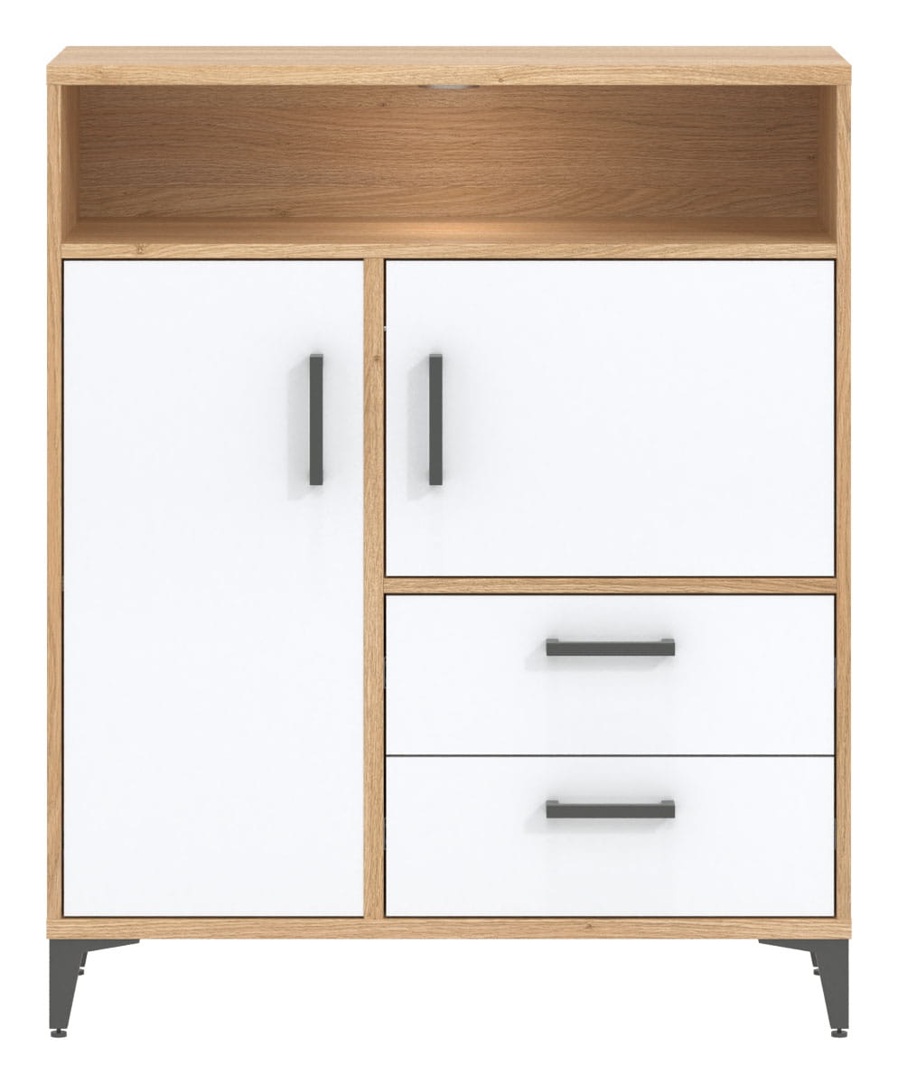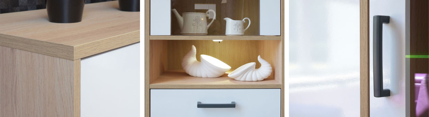 Charakterystyczną cechą COLIN CN4 jest zestawienie korpusu w kolorze dąb nagano z frontami w białym połysku, które sprawią, że wnętrze zyskuje niepowtarzalny styl. Dodatkowo mebel osadzono na solidnych wysokich nóżkach, a poziome czarne uchwyty doskonale komponują się z całością bryły.