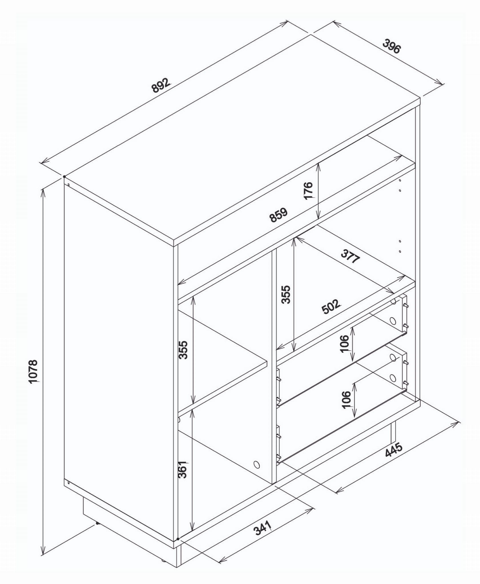 Mebel złożony jest z otwartej wnęki przeznaczonej na drobiazgi, dwóch szuflad wyposażonych w wysokogatunkowe prowadnice kulkowe GTV z pełnym wysuwem oraz dwóch zamykanych szafek, gdzie swobodnie uporządkujesz osobiste przedmioty. Za wąskimi drzwiczkami znajdują się dwie wnęki.