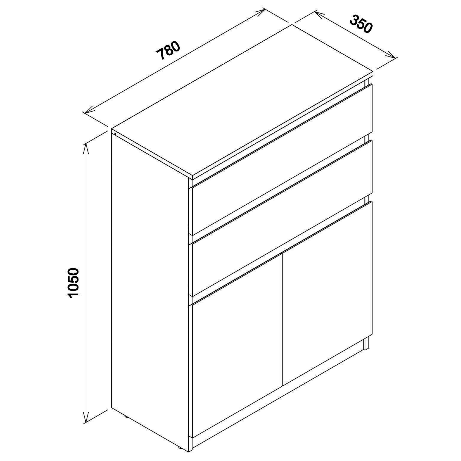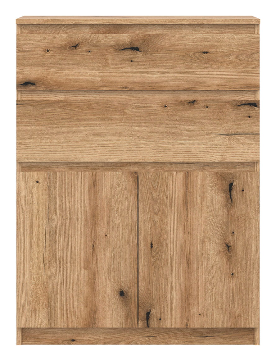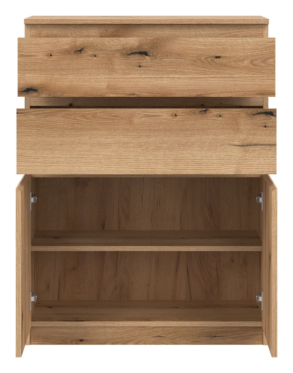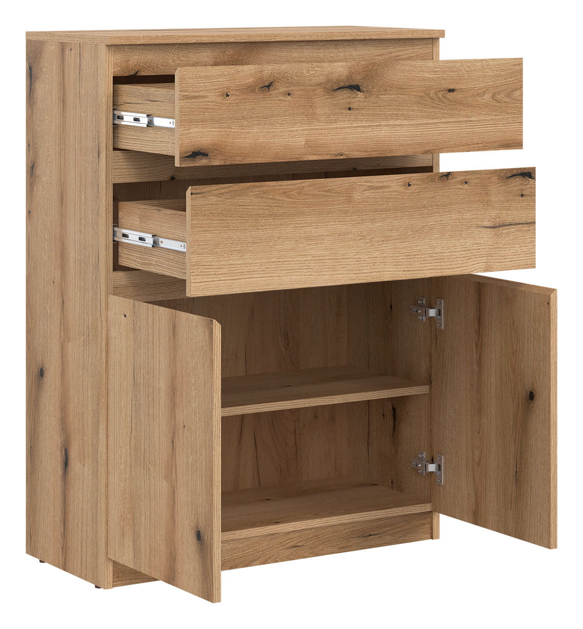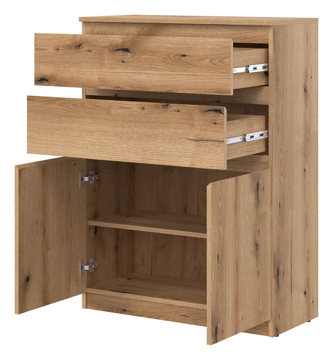 Mebel wyposażono w dwie szuflady wysuwane na solidnych prowadnicach kulkowych gwarantujących długotrwałą i bezawaryjną pracę oraz dwie wnęki zamknięte za dwoma drzwiczkami.