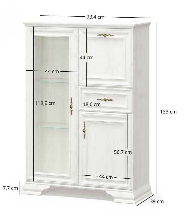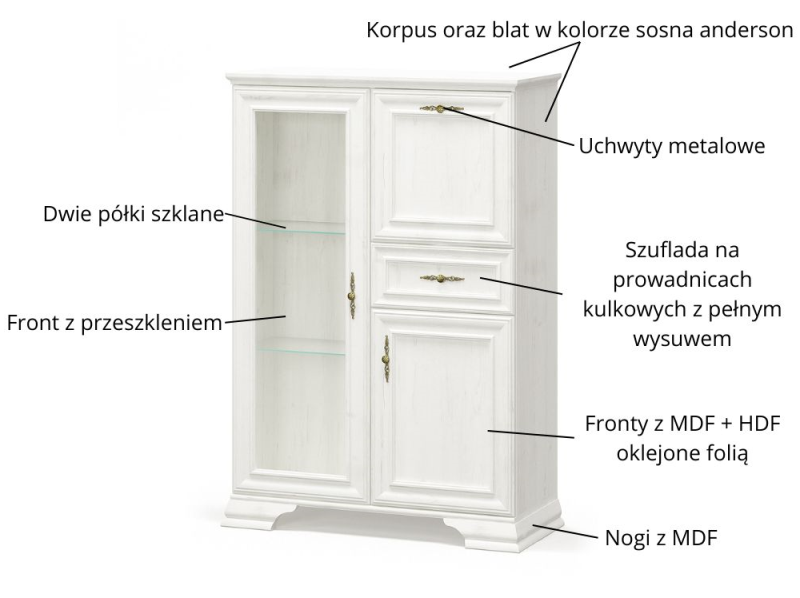 w kolorze Sosny Anderson to elegancki mebel łączący styl z praktycznością. Lewa strona komody wyposażona jest w przeszklone drzwiczki, za którymi można efektownie wyeksponować szkło, zastawę lub dekoracyjne akcesoria. Prawa część to przestronna strefa do przechowywania, idealna na różnorodne przedmioty codziennego użytku. Jasne wybarwienie w połączeniu z ozdobnymi uchwytami dodaje całości subtelnej elegancji. Solidna konstrukcja oraz przemyślany układ czynią komodę z barkiem doskonałym wyborem zarówno do salonu, jak i jadalni, wprowadzając ciepły i stylowy akcent.