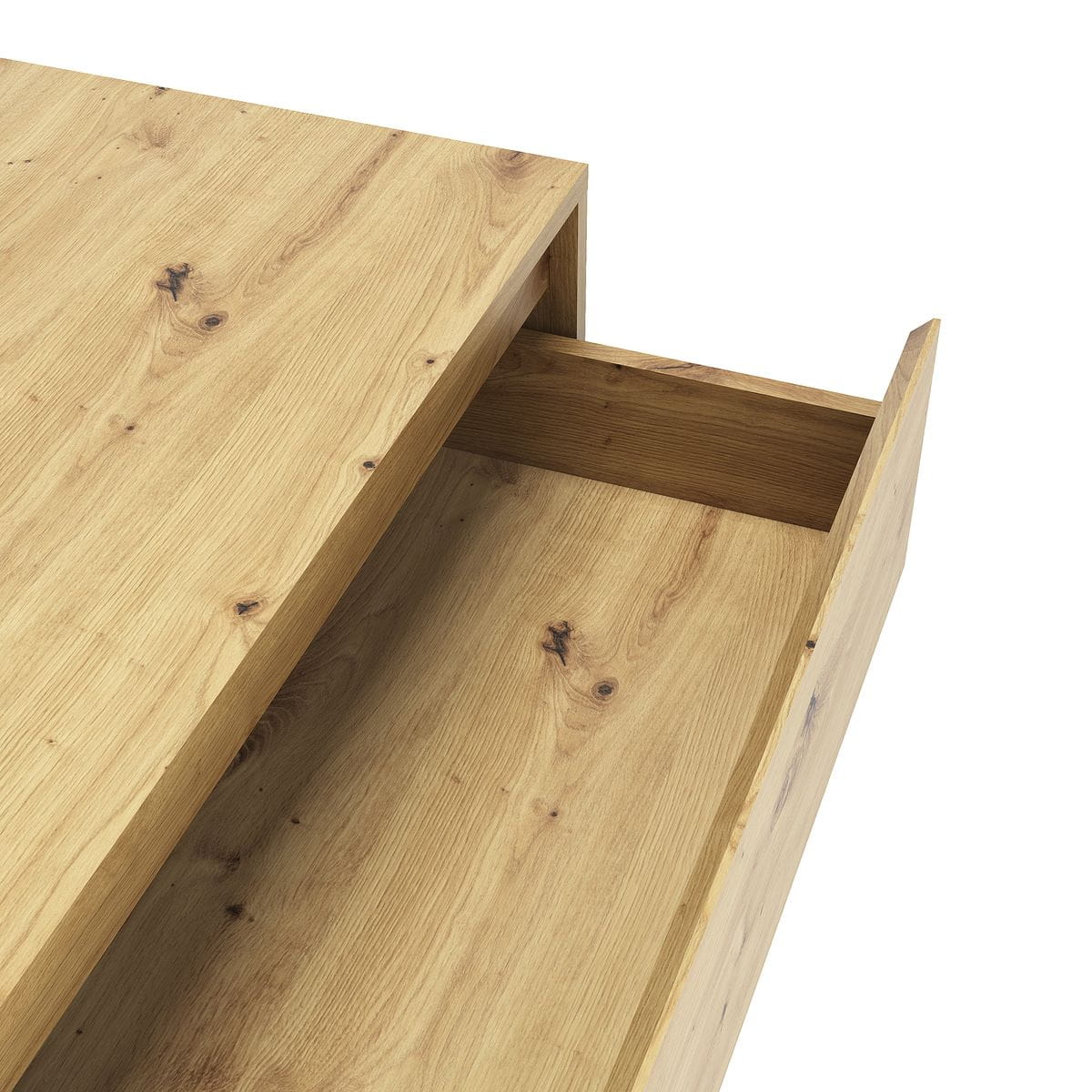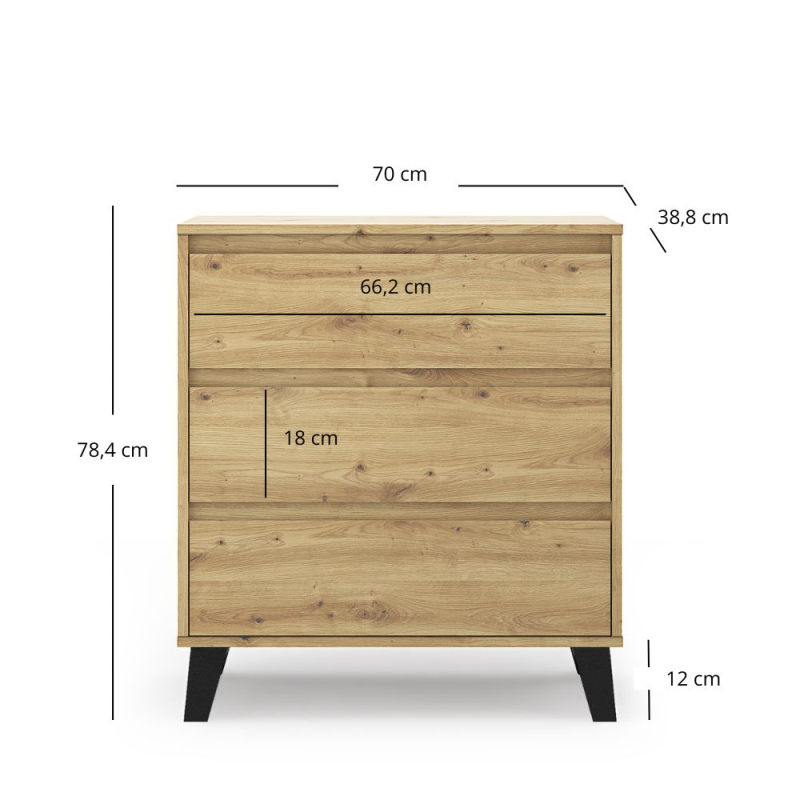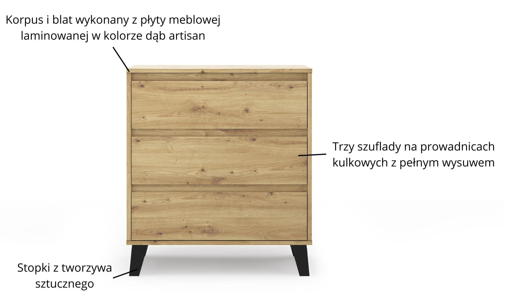 stanowi funkcjonalny i atrakcyjny element wyposażenia wnętrza. Model znakomicie sprawdzi się w nowoczesnych aranżacjach. Powierzchnia blatu może posłużyć do wyeksponowania domowej galerii zdjęć i elementów dekoracyjnych a wnętrze do uporządkowania drobnej garderoby i przydatnych drobiazgów. Mebel wykonany został z płyty meblowej laminowanej w kolorze dębu artisan.