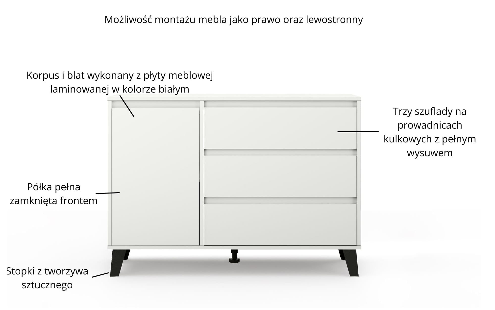 + Dodatkowe informacje: w trakcie montażu, Ty decydujesz, po której stronie znajdą się szuflady, a po której drzwi z półką
