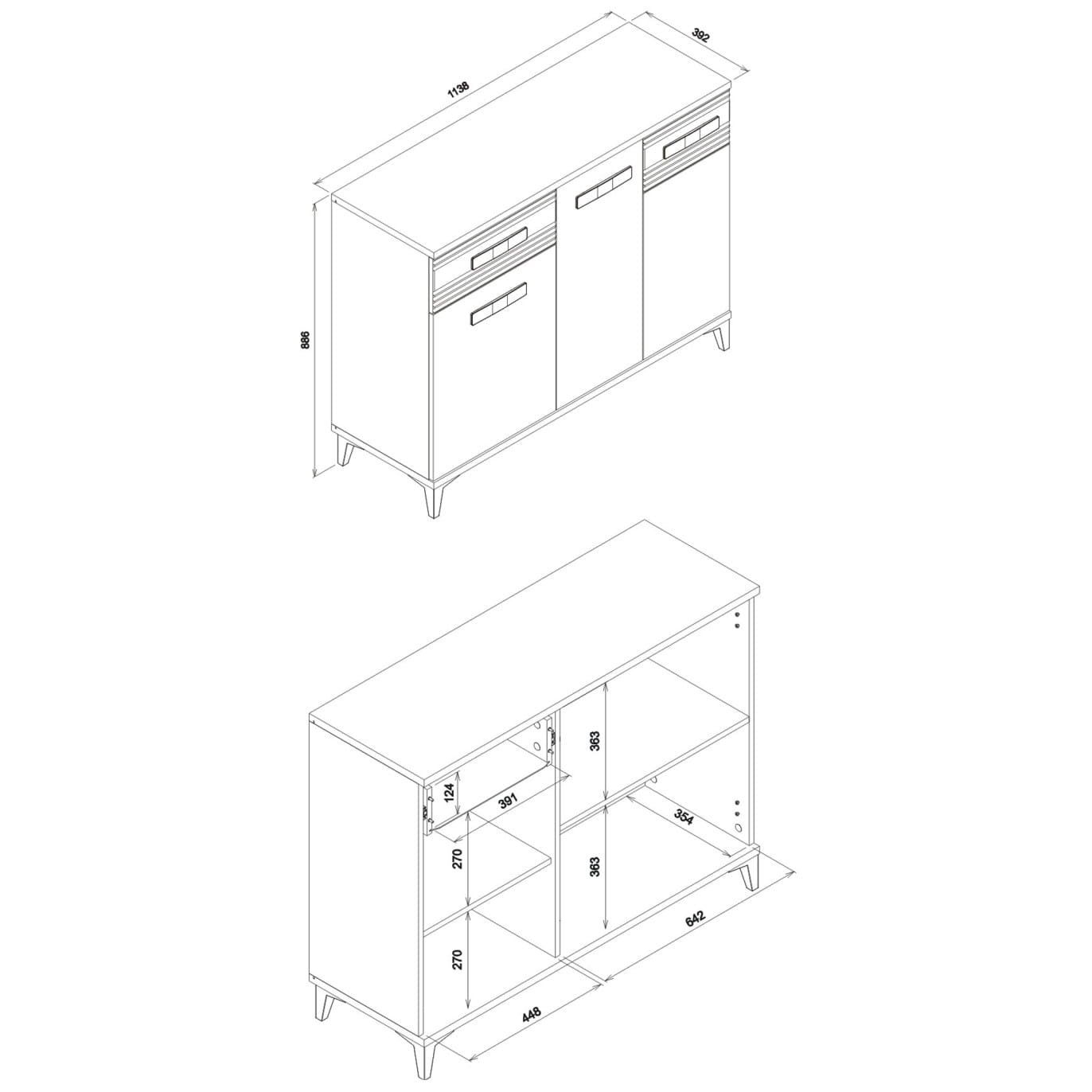 Mebel składa się z szuflady wyposażonej w wysokogatunkowe prowadnice kulkowe GTV z pełnym wysuwem oraz trzech drzwi, za którymi znajdują się cztery wnęki.