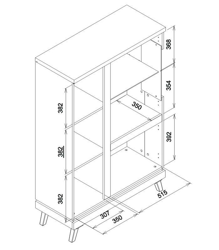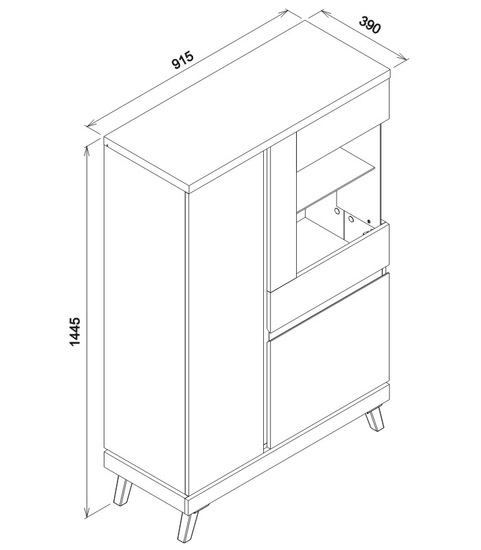 Mebel złożony jest z sześciu wnęk zamykanych trzema drzwiczkami. Szklaną półkę można doposażyć w zestaw oświetleniowy dostępny za dopłatą.