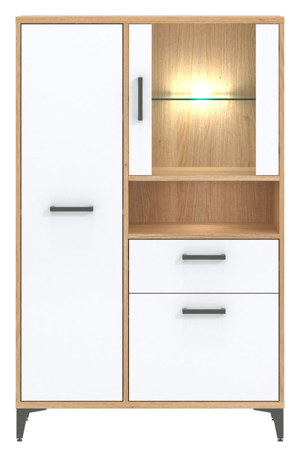 Charakterystyczną cechą COLIN CN5 jest zestawienie korpusu w kolorze dąb nagano z frontami w białym połysku, które sprawią, że wnętrze zyskuje niepowtarzalny styl. Dodatkowo mebel osadzono na solidnych wysokich nóżkach, a poziome czarne uchwyty doskonale komponują się z całością bryły.
