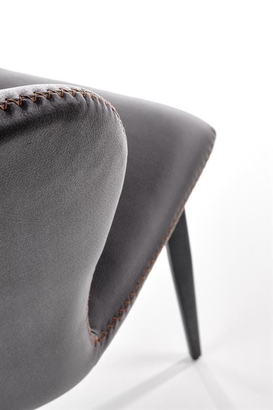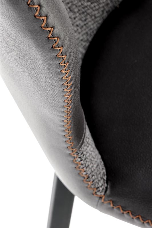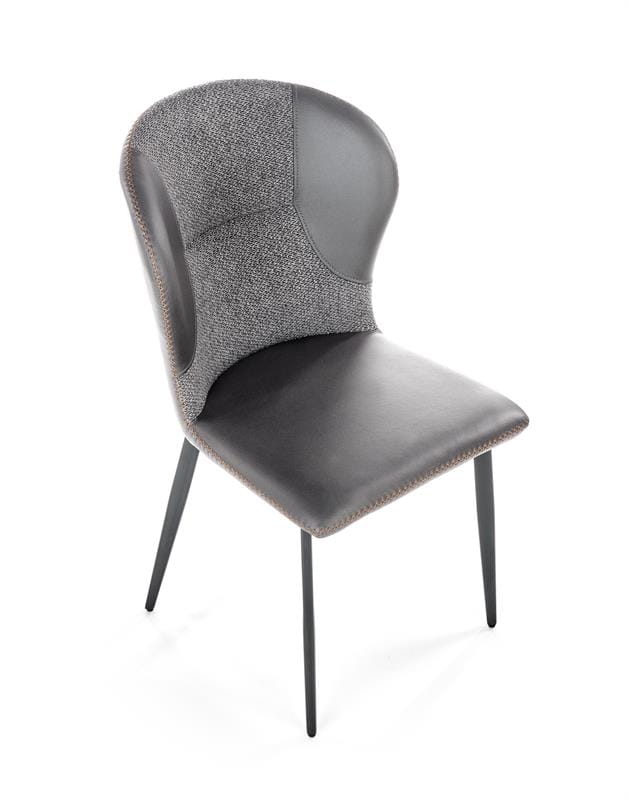 Krzesło K466 posiada komfortowe siedzisko obite ciemno popielatą ekoskórą wysokiej jakości. Oparcie stanowi natomiast wytrzymała i przyjemna w dotyku tkanina w tym samym wybarwieniu. Podstawę krzesła wykonano z kolei ze stali malowanej proszkowo na kolor czarny, dzięki czemu mebel znakomicie wkomponuje się we wnętrza urządzone w stylu loft. Metalowe nogi zagwarantują dużą wytrzymałość krzesła oraz jego stabilność podczas użytkowania. Tak skonstruowane krzesło będzie idealną opcją dla osób szukających nowoczesnych a także eleganckich rozwiązań.