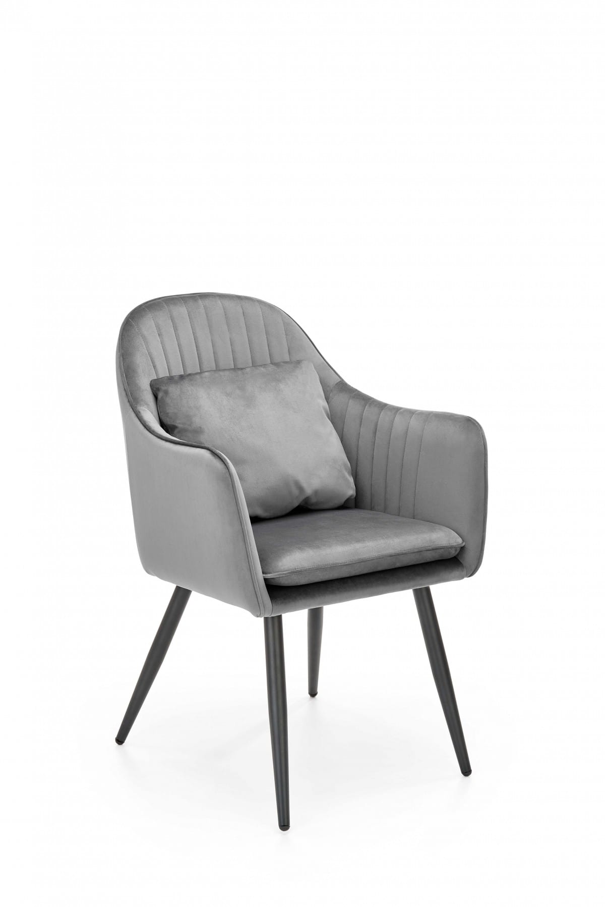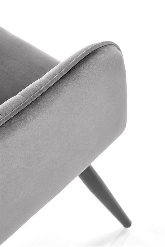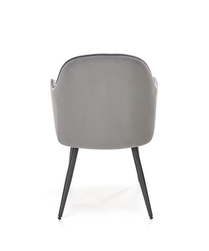 Krzesło K464 posiada komfortowe siedzisko i oparcie ozdobione dekoracyjnymi przeszyciami, które nadają meblowi wyjątkowego designu. Wyprofilowane oparcie a także dołączona do zestawu poduszka zagwarantują użytkownikowi krzesła zaznanie maksymalnego komfortu. Model tapicerowany jest przyjemną w dotyku tapicerką z tkaniny VELVET. Tego typu materiał pięknie prezentować się będzie we wnętrzach urządzonych na szykowny styl glamour. Jednakże ze względu na to, że nogi wykonane zostały ze stali malowanej proszkowo w czarnym kolorze, to krzesło będzie także rewelacyjne do mieszkań w stylu loft. Metalowe nogi to gwarancja dużej wytrzymałości mebla oraz jego stabilności podczas użytkowania.