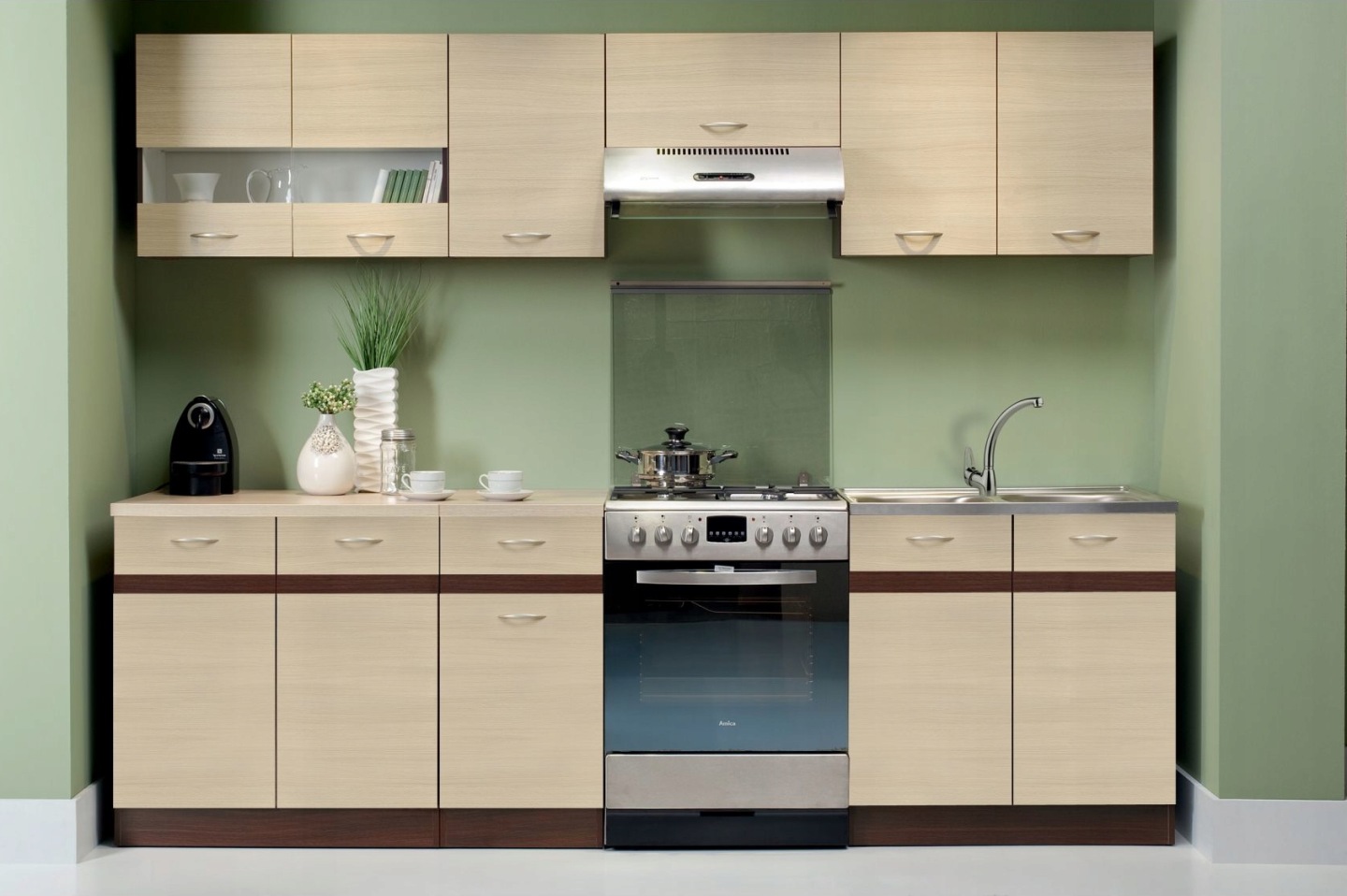 Szafki górne montowane są na zawieszkach z regulacją w trzech płaszczyznach. Szafki dolne wyposażono w stopki typu ślizgacz chroniące spód płyty meblowej.