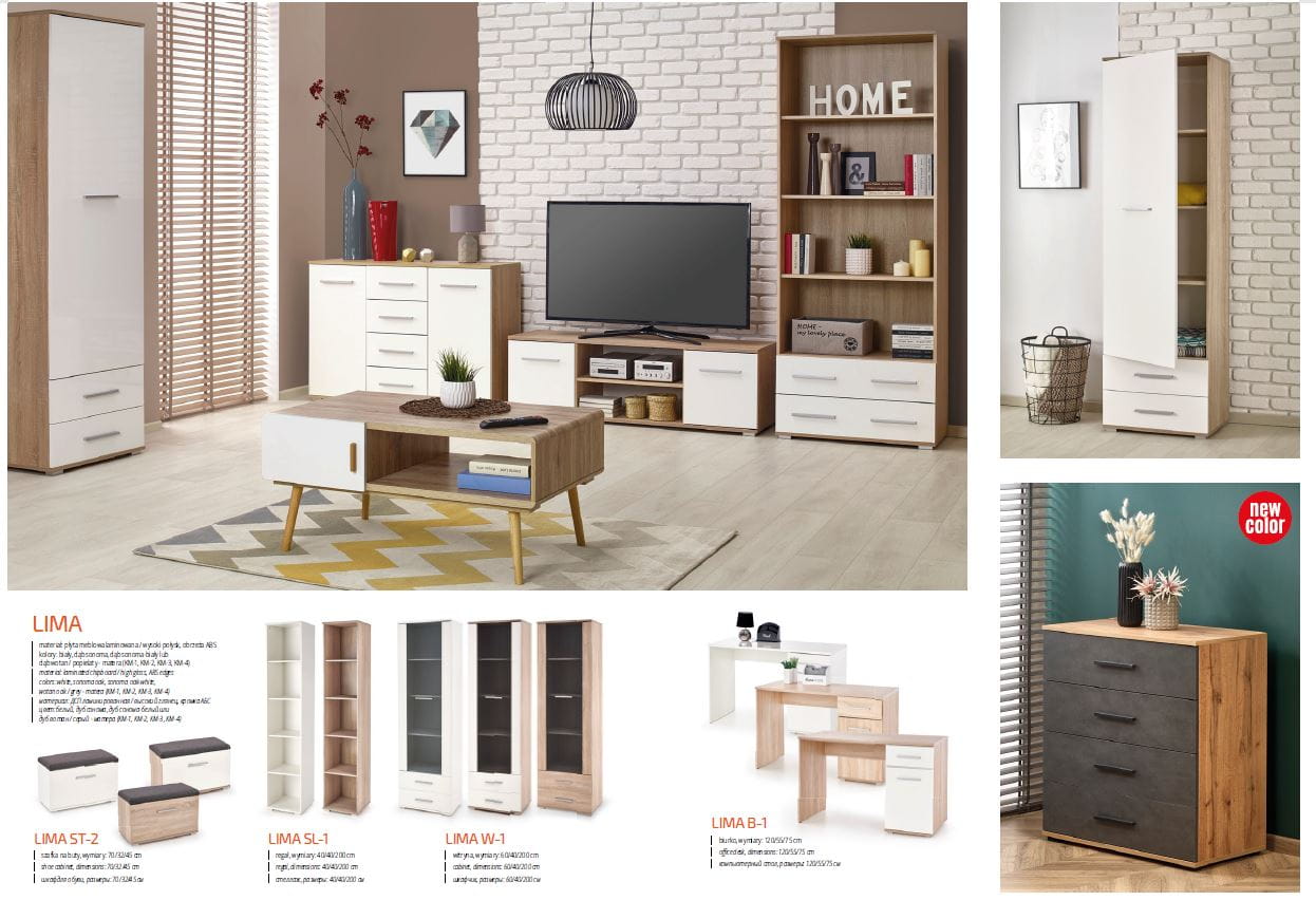 Kolekcja Lima to połączenie funkcjonalności i nowoczesnego designu oraz niskiej ceny. Dzięki uniwersalnej kolorystyce i prostocie dopasuje się praktycznie do każdego wnętrza. Meble z tego systemu sprawdzą się idealnie w salonie, sypialni i garderobie jak i biurze. System jest doskonałym rozwiązaniem wszędzie tam, gdzie potrzebujesz dodatkowego miejsca do przechowywania. Wykonane z trwałej płyty meblowej, pokrytej laminatem imitującym naturalne usłojenie drewna jest dodatkowo zabezpieczonej wytrzymałymi obrzeżami ABS.
