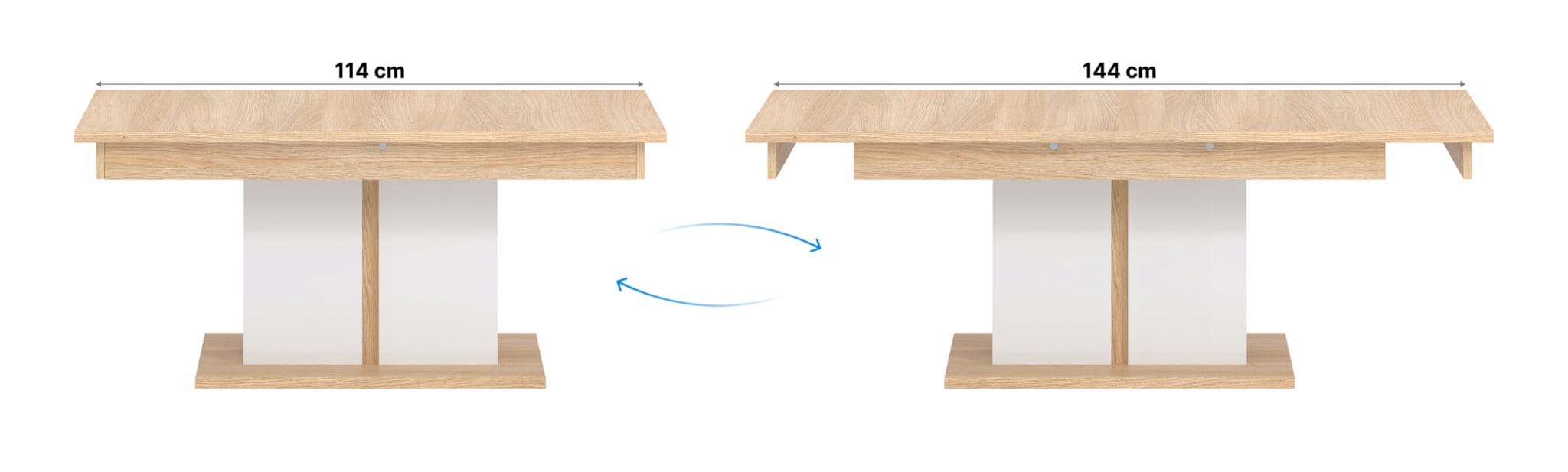 Ławę można rozłożyć do 144 cm poprzez przesunięcie blatu i dołożenie schowanej pod blatem wkładki o długości 30 cm.