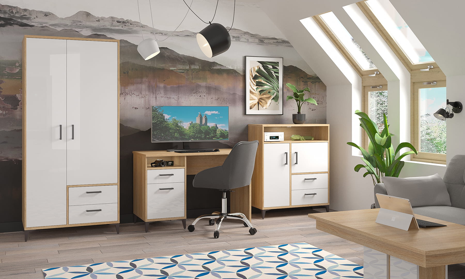 Charakterystyczną cechą COLIN CN16 jest zestawienie dwóch kolorów dębu nagano z białym połyskiem, które sprawią, że wnętrze zyskuje niepowtarzalny styl.
