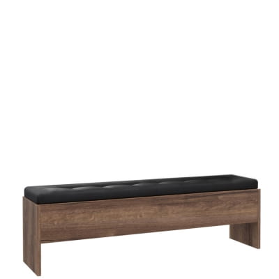 Meble z kolekcji BELLEVUE nadają wnętrzu elegancji i wprowadzają klimat luksusu. Ławka ze schowkiem dopasuje się do aranżacji każdej sypialni. Wykorzystasz ją jako komfortowe siedzisko, wyróżniające się pięknym czarnym pikowaniem. To również dodatkowe miejsce przechowywania. Siedzisko jest wyposażone w podnośnik gazowy, umożliwiający jego sprawne podnoszenie i opuszczanie. Efekt luksusu uzyskano dzięki połączeniu ciemnych dekorów Dąb Szlachetny i Dąb Czarny.